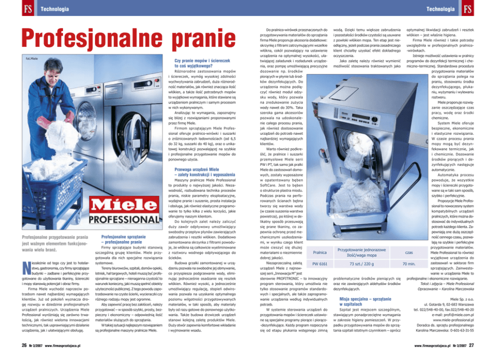 FS Technologia Technologia Profesjonalne pranie fot.Miele Czy pranie mopów i ściereczek to coś wyjątkowego? Różnorodne zastosowania mopów i ściereczek, wymóg wysokiej zdolności wychwytywania zabrudzeń, duża różnorodność materiałów, jak również znacząca ilość włókien, a także ilość potrzebnych mopów to wyjątkowe wymagania, które stawiane są urządzeniom pralniczym i samym procesom w nich wykonywanym. Analizując te wymagania, zapoznajmy się bliżej z rozwiązaniami proponowanymi przez firmę Miele. Firmom sprzątającym Miele Professional oferuje pralnico-wirówki i suszarki o zróżnicowanych ładownościach (od 6,5 do 32 kg, suszarki do 40 kg), oraz o unikatowej konstrukcji pozwalającej na szybkie i profesjonalne przygotowanie mopów do ponownego użycia. Przewaga urządzeń Miele – zalety konstrukcji i wyposażenia Profesjonalne przygotowanie prania jest ważnym elementem funkcjonowania wielu branż. N iezależnie od tego czy jest to hotelarstwo, gastronomia, czy firmy sprzątające budynki – zadbane i perfekcyjnie przygotowane do użytkowania tkaniny, ściereczki i mopy stanowią potencjał i obraz firmy. Firma Miele wychodzi naprzeciw potrzebom nawet najbardziej wymagających klientów. Już od pokoleń wyznacza drogę rozwoju w dziedzinie profesjonalnych urządzeń pralniczych. Urządzenia Miele Professional wyróżniają się zarówno trwałością, jak również wieloma innowacjami technicznymi, tak usprawniającymi działanie urządzenia, jak i ułatwiającymi obsługę. 26 Nr 3/2007 www.firmasprzatajaca.pl Profesjonalne sprzątanie – profesjonalne pranie Firmy sprzątające budynki stanowią szczególną grupę klientów. Miele przygotowała dla nich specjalne rozwiązania systemowe. Tereny biurowców, szpitali, domów opieki, lotnisk, hal targowych, hoteli muszą być profesjonalnie sprzątane – nienaganna czystość to warunek konieczny, jaki muszą spełnić obiekty użyteczności publicznej. Z tego powodu zapotrzebowanie na czyste ścierki, wycieraczki czy różnego rodzaju mopy jest ogromne. Aby zapewnić pracę bez zakłóceń, należy przygotować – w sposób szybki, prosty, bezpieczny i ekonomiczny – odpowiednią ilość materiałów służących do sprzątania. W takiej sytuacji najlepszym rozwiązaniem są profesjonalne maszyny pralnicze Miele. Maszyny pralnicze Miele Professional to produkty o najwyższej jakości. Niezawodność, rozbudowana technika procesów prania, niskie parametry eksploatacyjne, wydajne pranie i suszenie, prosta instalacja i obsługa, jak również elastyczne programowanie to tylko kilka z wielu korzyści, jakie oferujemy naszym klientom. Do kolejnych zalet należy zaliczyć duży zawór odpływowy umożliwiający swobodny przepływ płynów zawierających zabrudzenia i resztki włókien. Dodatkowo zamontowana skrzynka z filtrami powoduje, że włókna są całkowicie wyeliminowane z roztworu wodnego odpływającego do ścieków. Budowa grzałki zamontowanej w urządzeniu pozwala na swobodne jej obmywanie, co przyspiesza podgrzewanie wody, eliminując jednocześnie osadzanie się resztek włókien. Również wysoki, a jednocześnie umożliwiający regulację, stopień odwirowania pozwala na uzyskanie optymalnego poziomu wilgotności przygotowywanych materiałów, w taki sposób, aby materiały były od razu gotowe do ponownego użytkowania. Także budowa drzwiczek urządzeń stanowi kolejną zaletę produktów Miele. Duży otwór zapewnia komfortowe wkładanie i wyjmowanie wsadu. Do pralnico-wirówek przeznaczonych do przygotowywania materiałów do sprzątania firma Miele proponuje akcesoria dodatkowe: skrzynkę z filtrami zatrzymującymi wszelkie włókna, cokół pozwalający na ustawienie urządzenia na optymalnej wysokości, ułatwiającej załadunek i rozładunek urządzenia, oraz pompę umożliwiającą precyzyjne dozowanie np. środków piorących w płynie lub środków dezynfekujących. Do urządzenia można podłączyć również moduł odzysku wody, który pozwala na zredukowanie zużycia wody nawet do 30%. Taka szeroka gama akcesoriów pozwala na udoskonalenie całego procesu prania, jak również dostosowanie urządzeń do potrzeb nawet najbardziej wymagających klientów. Warto również podkreślić, że pralnice i suszarki przemysłowe Miele serii PW i PT, tak samo jak pralki Miele do zastosowań domowych, zostały wyposażone w opatentowany b ęben SoftCare. Jest to bęben o strukturze plastra miodu. Podczas prania na perforowanych ścianach bębna tworzy się warstwa wody (w czasie suszenia warstwa powietrza), po której w delikatny sposób przesuwają się prane tkaniny, co zapewnia ochronę przed mechanicznymi uszkodzeniami, w wyniku czego klient może cieszyć się dłużej materiałami o niezmiennie Pralnica dobrej jakości. Niezaprzeczalną zaletą PW 6161 urządzeń Miele z najnowszej serii „Innowacja M” jest sterownie PROFITRONIC – to innowacyjny program sterowania, który umożliwia nie tylko stosowanie programów standardowych i specjalnych, ale także zaprogramowanie urządzenia według indywidualnych potrzeb. W systemie sterowania urządzeń do przygotowania mopów i ściereczek ustawione są specjalne programy piorące i piorąco-dezynfekujące. Każdy program rozpoczyna się od etapu płukania wstępnego zimną FS wodą. Dzięki temu większe zabrudzenia i pozostałości środków czystości są usuwane z powłoki włókien mopa. Ten etap jest nieodłączny, jeżeli podczas prania zasadniczego klient chciałby uzyskać efekt dokładnego oczyszczenia. Jako zaletę należy również wymienić możliwość stosowania traktowanych jako optymalnej likwidacji zabrudzeń i resztek włókien – jest właśnie higiena. Firma Miele również i takie potrzeby uwzględniła w profesjonalnych pralnico-wirówkach. Istnieje możliwość ustawienia w pralnicy programów do dezynfekcji termicznej i chemiczno–termicznej. Standardowa procedura przygotowania materiałów do sprz