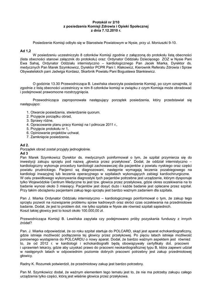 Protokół nr 2/10 z posiedzenia Komisji Zdrowia i Opieki Społecznej z dnia 7.12.2010 r. Posiedzenie Komisji odbyło się w Starostwie Powiatowym w Nysie, przy ul. Moniuszki 9-10. Ad 1,2 W posiedzeniu uczestniczyło 8 członków Komisji zgodnie z załączoną do protokołu listą obecności (lista obecności stanowi załącznik do protokołu) oraz: Ordynator Oddziału Dziecięcego ZOZ w Nysie Pani Ewa Sahaj, Ordynator Oddziału internistyczno – kardiologicznego Pan Jacek Miarka, Dyrektor ds. medycznych Pan Marek Szymkowicz, Dyrektor PCPR Pani I. Kłakowicz, Kierownik Referatu Zdrowia i Spraw Obywatelskich pani Jadwiga Kordasz, Skarbnik Powiatu Pani Bogusława Stankiewicz. O godzinie 13.30 Przewodnicząca B. Lewińska otworzyła posiedzenie Komisji, po czym oznajmiła, iż zgodnie z listą obecności uczestniczy w nim 8 członków komisji w związku z czym Komisja może obradować i podejmować prawomocne rozstrzygnięcia. Przewodnicząca zaproponowała następujący porządek posiedzenia, który przedstawiał się następująco: 1. Otwarcie posiedzenia, stwierdzenie quorum. 2. Przyjęcie porządku obrad, 3. Sprawy różne, 4. Opracowanie planu pracy Komisji na I półrocze 2011 r., 5. Przyjęcie protokołu nr 1, 6. Opiniowanie projektów uchwał, 7. Zamknięcie posiedzenia. Ad 2. Porządek obrad został przyjęty jednogłośnie. Ad 3 Pan Marek Szymkowicz Dyrektor ds. medycznych poinformował o tym, że szpital przymierza się do inwestycji zakupu sprzętu pod nazwą „głowica przez przełykowa”. Dodał, że oddział internistyczno – kardiologiczny wykonuje procedury kardiologii zachowawczej dla pacjentów z powiatu nyskiego oraz części powiatu prudnickiego. Pacjenci są diagnozowani, następnie wymagają leczenia pozabiegowego na kardiologi inwazyjnej lub leczenia operacyjnego w szpitalach wykonujących zabiegi kardiochirurgiczne. W celu prawidłowego wykonywania diagnostyki tych pacjentów potrzebne jest urządzenie, którym dysponuje tylko Wojewódzkie Centrum Medyczne to jest tzw. głowica przez przełykowa, gdzie okres oczekiwania na to badanie wynosi około 3 miesięcy. Pacjentów jest dosyć dużo i każde badanie jest opłacane przez szpital. Przy takim obciążeniu pacjentami zakup tego sprzętu jest bardzo ważnym zadaniem dla szpitala. Pan J. Miarka Ordynator Oddziału internistyczno – kardiologicznego poinformował o tym, że zakup tego sprzętu pozwoli na rozwiązanie problemu spraw kadrowych oraz skróci czas oczekiwania na przedmiotowe badanie. Dodał, że jest to problem dot. nie tylko szpitala w Nysie ale również szpitali sąsiednich. Koszt takiej głowicy jest to koszt około 100.000,00 zł. Przewodnicząca Komisji B. Lewińska zapytała czy podejmowano próby pozyskania funduszy z innych źródeł? Pan. J. Miarka odpowiedział, że co roku szpital startuje do POLCARD, skąd jest aparat echokardiograficzny, gdzie istnieje możliwość podłączenia tej głowicy przez przełykowej. Po pięciu latach istnieje możliwość ponownego wystąpienia do POLCARDU o nowy aparat. Dodał, że bardzo ważnym aspektem jest również to, że od 2012 r. w kardiologii i echokardiografii będą obowiązywały certyfikaty dot. pracowni i uprawnień lekarzy, gdzie aby uzyskać prawo do pracowni neokardiograficznej typu B, która zapewni udział w następnych latach w odpowiednim poziomie dobrych pracowni potrzebny jest zakup przedmiotowej głowicy. Radny K. Rozumek potwierdził, że przedmiotowy zakup jest bardzo potrzebny. Pan M. Szymkowicz dodał, że ważnym elementem tego tematu jest to, że nie ma potrzeby zakupu całego urządzenia tylko części, którą jest właśnie głowica przez przełykowa. Ponadto odniósł się również do tematu w sprawie planów inwestycyjnych oraz spraw, o które występowano do Rady Powiatu poprzedniej kadencji. Poinformował również o zabezpieczeniu podstawowych potrzeb zagospodarowania nowego obiektu szpitala. Złożono również do PFRON wniosek na zakup sprzętu rehabilitacyjnego, co zostało w tej chwili wstrzymane ponieważ nie ma środków finansowych. W pierwszym kwartale 2011 r. zostanie uruchomiony kolejny nabór na ambulanse. Poinformował o tym, ze toczy się największy projekt jaki realizowany jest wspólnie ze Starostwem Powiatowym czyli rozbudowa szpitala w ramach tzw. rewitalizacji terenów i obiektu szpitala w Nysie. Pozyskano z Urzędu Marszałkowskiego prawie 6.000.000,00 zł, pozostałe środki to zabezpieczenie z budżetu powiatu i po części Szpitala w Nysie. Prawdopodobnie w czerwcu 2011 r. obiekt zostanie już zagospodarowany. Następnie poruszył temat oddziału pediatrycznego, który wymaga nakładu dużych inwestycji, musi być odpowiednio przystosowany aby mógł spełniać wszystkie wymogi. Oddział ten wykonuje wiele procedur, ma bardzo dobrą kadrę medyczną, nie mniej warunki lokalowe wymagają szybkiego przystosowania do pełnienia funkcji oddziału pediatrycznego. Członek Zarządu J. Dunaj odnosząc się do tematu zakupu głowicy przez przełykowej zapytał czy nie ma szans zakupu tego urządzenia z innych projektów programów zewnętrznych? Dyrektor M. Szymkowicz odpowiedział, ze jedyna możliwość to był POLCARD, ale ten aparat nie mieści się w tym zakresie. Członek Zarządu J. Dunaj oznajmił, że w ramach lokalnego programu rewitalizacji kiedy rozpoczynano budowę szpitala to nie było mowy o lądowisku wyniesionym. Powiedział, że należy wziąć pod uwagę również to, że w budżecie powiatu są jeszcze zabezpieczone środki na spłatę kredytu zaciągniętego na inwestycję rozbudowy szpitala. Dyrektor M. Szymkowicz odpowiedział, że na budowę lądowiska ubiegano się o środki z programu Infrastruktura Środowiska z Ministerstwa. Tak się złożyło, że pierwotnie projekt zakładał budowę lądowiska przy oddziale ratunkowym. Wymóg lądowisk, które mogą być dofinansowane jest taki, że pacjent z helikoptera do szpitala nie może być transportowany pośrednimi środkami tran