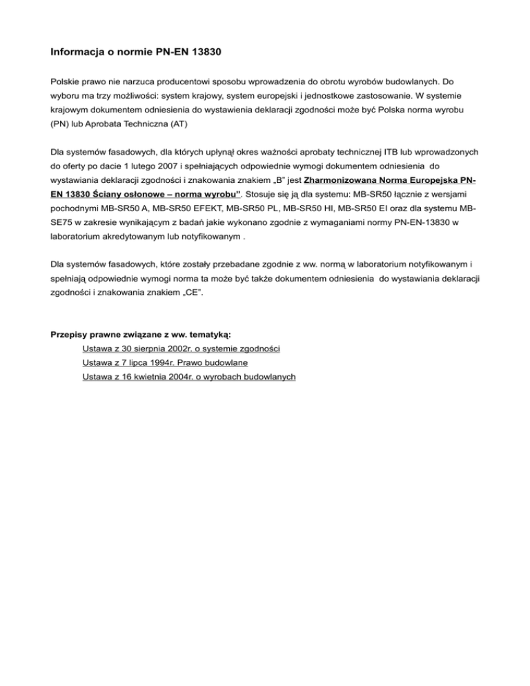 Informacja o normie PN-EN 13830 Polskie prawo nie narzuca producentowi sposobu wprowadzenia do obrotu wyrobów budowlanych. Do wyboru ma trzy możliwości: system krajowy, system europejski i jednostkowe zastosowanie. W systemie krajowym dokumentem odniesienia do wystawienia deklaracji zgodności może być Polska norma wyrobu (PN) lub Aprobata Techniczna (AT) Dla systemów fasadowych, dla których upłynął okres ważności aprobaty technicznej ITB lub wprowadzonych do oferty po dacie 1 lutego 2007 i spełniających odpowiednie wymogi dokumentem odniesienia do wystawiania deklaracji zgodności i znakowania znakiem „B” jest Zharmonizowana Norma Europejska PNEN 13830 Ściany osłonowe – norma wyrobu”. Stosuje się ją dla systemu: MB-SR50 łącznie z wersjami pochodnymi MB-SR50 A, MB-SR50 EFEKT, MB-SR50 PL, MB-SR50 HI, MB-SR50 EI oraz dla systemu MBSE75 w zakresie wynikającym z badań jakie wykonano zgodnie z wymaganiami normy PN-EN-13830 w laboratorium akredytowanym lub notyfikowanym . Dla systemów fasadowych, które zostały przebadane zgodnie z ww. normą w laboratorium notyfikowanym i spełniają odpowiednie wymogi norma ta może być także dokumentem odniesienia do wystawiania deklaracji zgodności i znakowania znakiem „CE”. Przepisy prawne związane z ww. tematyką: Ustawa z 30 sierpnia 2002r. o systemie zgodności Ustawa z 7 lipca 1994r. Prawo budowlane Ustawa z 16 kwietnia 2004r. o wyrobach budowlanych