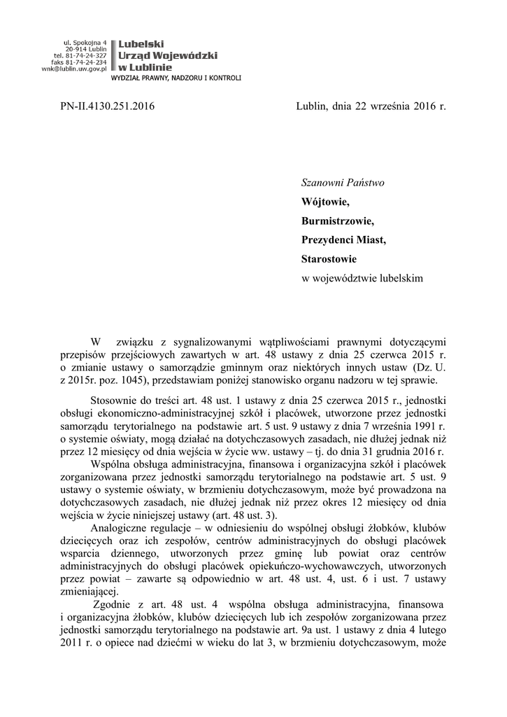 PN-II.4130.251.2016 Lublin, dnia 22 września 2016 r. Szanowni Państwo Wójtowie, Burmistrzowie, Prezydenci Miast, Starostowie w województwie lubelskim W związku z sygnalizowanymi wątpliwościami prawnymi dotyczącymi przepisów przejściowych zawartych w art. 48 ustawy z dnia 25 czerwca 2015 r. o zmianie ustawy o samorządzie gminnym oraz niektórych innych ustaw (Dz. U. z 2015r. poz. 1045), przedstawiam poniżej stanowisko organu nadzoru w tej sprawie. Stosownie do treści art. 48 ust. 1 ustawy z dnia 25 czerwca 2015 r., jednostki obsługi ekonomiczno-administracyjnej szkół i placówek, utworzone przez jednostki samorządu terytorialnego na podstawie art. 5 ust. 9 ustawy z dnia 7 września 1991 r. o systemie oświaty, mogą działać na dotychczasowych zasadach, nie dłużej jednak niż przez 12 miesięcy od dnia wejścia w życie ww. ustawy – tj. do dnia 31 grudnia 2016 r. Wspólna obsługa administracyjna, finansowa i organizacyjna szkół i placówek zorganizowana przez jednostki samorządu terytorialnego na podstawie art. 5 ust. 9 ustawy o systemie oświaty, w brzmieniu dotychczasowym, może być prowadzona na dotychczasowych zasadach, nie dłużej jednak niż przez okres 12 miesięcy od dnia wejścia w życie niniejszej ustawy (art. 48 ust. 3). Analogiczne regulacje – w odniesieniu do wspólnej obsługi żłobków, klubów dziecięcych oraz ich zespołów, centrów administracyjnych do obsługi placówek wsparcia dziennego, utworzonych przez gminę lub powiat oraz centrów administracyjnych do obsługi placówek opiekuńczo-wychowawczych, utworzonych przez powiat – zawarte są odpowiednio w art. 48 ust. 4, ust. 6 i ust. 7 ustawy zmieniającej. Zgodnie z art. 48 ust. 4 wspólna obsługa administracyjna, finansowa i organizacyjna żłobków, klubów dziecięcych lub ich zespołów zorganizowana przez jednostki samorządu terytorialnego na podstawie art. 9a ust. 1 ustawy z dnia 4 lutego 2011 r. o opiece nad dziećmi w wieku do lat 3, w brzmieniu dotychczasowym, może 2 być prowadzona na dotychczasowych zasadach, nie dłużej jednak niż przez okres 12 miesięcy od dnia wejścia w życie niniejszej ustawy. W myśl art. 48 ust. 6 centra administracyjne do obsługi placówek wsparcia dziennego, utworzone przez gminę lub powiat na podstawie art. 18a ust. 1 ustawy z dnia 9 czerwca 2011 r. o wspieraniu rodziny i systemie pieczy zastępczej, w brzmieniu dotychczasowym, mogą działać na dotychczasowych zasadach, nie dłużej jednak niż przez 12 miesięcy od dnia wejścia w życie niniejszej ustawy. W art. 48 ust. 7 ustawa stanowi zaś, ze centra administracyjne do obsługi placówek opiekuńczo-wychowawczych, utworzone przez powiat na podstawie art. 94 ust. 1 ustawy o wspieraniu rodziny i systemie pieczy zastępczej, w brzmieniu dotychczasowym, mogą działać na dotychczasowych zasadach, nie dłużej jednak niż przez 12 miesięcy od dnia wejścia w życie niniejszej ustawy. Z przytoczonych wyżej przepisów wynika, że działalność ww. jednostek może być prowadzona na dotychczasowych zasadach do dnia 31 grudnia 2016 r. W stanie prawnym obowiązującym przed 1 stycznia 2016r. jednostki obsługi ekonomiczno-administracyjnej szkół tworzone były na podstawie art. 5 ust. 9 ustawy o systemie oświaty. Przepis ten upoważniał organy prowadzące szkoły i placówki oświatowe do tworzenia jednostek obsługi ekonomiczno-administracyjnej lub organizowania wspólnej obsługi administracyjnej, finansowej i organizacyjnej prowadzonych szkół i placówek funkcjonujących w oparciu o przepisy ustawy o systemie oświaty. Nowelizacja art. 5 ust. 9 ustawy o systemie oświaty dokonana ustawą zmieniającą z dnia 25 czerwca 2015r., polegająca na pominięciu w nim wskazania jednostek samorządu terytorialnego jako uprawnionych do tworzenia jednostek obsługujących lub wspólnej obsługi, nie przesądza o konieczności likwidowania istniejących już jednostek organizacyjnych powołanych na podstawie tego przepisu. Należy podkreślić, że jednostki te były tworzone nie tylko na podstawie art. 5 ust. 9 ustawy o systemie oświaty, ale głównym dla nich umocowaniem – jako dla jednostek budżetowych – były przepisy ustawy o finansach publicznych (art. 12 ust. 1 pkt 2 i ust. 2) oraz ustawy o samorządzie gminnym (art. 18 ust. 2 pkt 9 lit. h), które nie zostały ani zmienione, ani uchylone. Przepisy przejściowe zawarte w art. 48 ustawy zmieniającej z dnia 25 czerwca 2015r. także nie zawierają żadnej wyraźnej dyspozycji o likwidacji tych jednostek. W kontekście pozostałych zmian wprowadzonych ustawą z dnia 25 czerwca 2015r., w szczególności polegających na wprowadzeniu art. 10a – 10d do ustawy o samorządzie gminnym, opisana wyżej zmiana art. 5 ust. 9 ustawy o systemie oświaty ma charakter jedynie porządkujący. W obecnym stanie prawnym możliwość zorganizowania przez jednostkę samorządu terytorialnego wspólnej obsługi została rozszerzona na całą sferę zadań publicznych realizowanych przez jednostkę samorządu terytorialnego, obejmujących również sferę oświatową, z tym jednak zastrzeżeniem, że zakres wspólnej obsługi nie może obejmować kompetencji kierowników jednostek zaliczanych do sektora finansów publicznych do dysponowania środkami publicznymi oraz zaciągania zobowiązań, a także sporządzania i zatwierdzania planu finansowego oraz przeniesień wydatków w tym planie (art. 10c ust. 1 ustawy o samorządzie gminnym). W 3 przypadku powierzenia obowiązków z zakresu rachunkowości i sprawozdawczości jednostek obsługiwanych, o których mowa w art. 10a pkt 1 i 2, są one przekazywane w całości (art. 10c ust. 2 ustawy o samorządzie gminnym). Należy więc uznać, że istniejące dotychczas jednostki obsługi ekonomicznoadministracyjnej szkół i placówek nie tylko nie straciły formalnej podstawy do dalszego ich funkcjonowania, ale uzyskały możliwość znacznego rozszerzenia zakresu swojej działalności. Warunkiem skorzystani