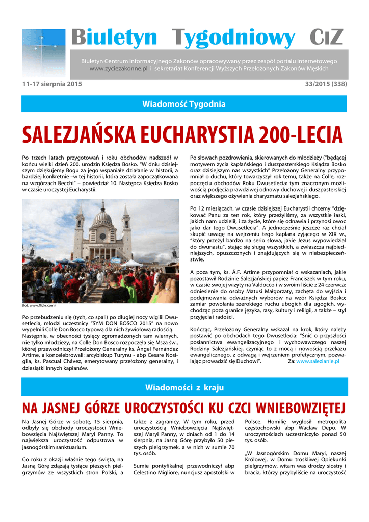 Biuletyn Tygodniowy CIZ Biuletyn Centrum Informacyjnego Zakonów opracowywany przez zespół portalu internetowego www.zyciezakonne.pl i sekretariat Konferencji Wyższych Przełożonych Zakonów Męskich 11-17 sierpnia 2015 33/2015 (338) Wiadomość Tygodnia SALEZJAŃSKA EUCHARYSTIA 200-LECIA Po trzech latach przygotowań i roku obchodów nadszedł w końcu wielki dzień 200. urodzin Księdza Bosko. “W dniu dzisiejszym dziękujemy Bogu za jego wspaniałe działanie w historii, a bardziej konkretnie –w tej historii, która została zapoczątkowana na wzgórzach Becchi” – powiedział 10. Następca Księdza Bosko w czasie uroczystej Eucharystii. Po słowach pozdrowienia, skierowanych do młodzieży (“będącej motywem życia kapłańskiego i duszpasterskiego Ksiądza Bosko oraz dzisiejszym nas wszystkich” Przełożony Generalny przypomniał o duchu, który towarzyszył rok temu, także na Colle, rozpoczęciu obchodów Roku Dwusetlecia: tym znaczonym możliwością podjęcia prawdziwej odnowy duchowej i duszpasterskiej oraz większego ożywienia charyzmatu salezjańskiego. Po 12 miesiącach, w czasie dzisiejszej Eucharystii chcemy “dziękować Panu za ten rok, który przeżyliśmy, za wszystkie łaski, jakich nam udzielił, i za życie, które się odnawia i przynosi owoc jako dar tego Dwusetlecia”. A jednocześnie jeszcze raz chciał skupić uwagę na wejrzeniu tego kapłana żyjącego w XIX w., “który przeżył bardzo na serio słowa, jakie Jezus wypowiedział do dwunastu”, stając się sługą wszystkich, a zwłaszcza najbiedniejszych, opuszczonych i znajdujących się w niebezpieczeństwie. (fot. www.flickr.com) Po przebudzeniu się (tych, co spali) po długiej nocy wigilii Dwusetlecia, młodzi uczestnicy “SYM DON BOSCO 2015” na nowo wypełnili Colle Don Bosco typową dla nich żywiołową radością. Następnie, w obecności tysięcy zgromadzonych tam wiernych, nie tylko młodzieży, na Colle Don Bosco rozpoczęła się Msza św., której przewodniczył Przełożony Generalny ks. Ángel Fernández Artime, a koncelebrowali: arcybiskup Turynu - abp Cesare Nosiglia, ks. Pascual Chávez, emerytowany przełożony generalny, i dziesiątki innych kapłanów. A poza tym, ks. Á.F. Artime przypomniał o wskazaniach, jakie pozostawił Rodzinie Salezjańskiej papież Franciszek w tym roku, w czasie swojej wizyty na Valdocco i w swoim liście z 24 czerwca: odniesienie do osoby Matusi Małgorzaty, zachęta do wyjścia i podejmowania odważnych wyborów na wzór Księdza Bosko; zamiar powołania szerokiego ruchu ubogich dla ugogich, wychodząc poza granice języka, rasy, kultury i relilgii, a także – styl przyjęcia i radości. Kończąc, Przełożony Generalny wskazał na krok, który należy postawić po obchodach tego Dwusetlecia: “Śnić o przyszłości posłannictwa ewangelizacyjnego i wychowawczego naszej Rodziny Salezjańskiej, czyniąc to z mocą i nowością przekazu ewangelicznego, z odwagą i wejrzeniem profetycznym, pozwalając prowadzić się Duchowi”. Za: www.salezianie.pl Wiadomości z kraju NA JASNEJ GÓRZE UROCZYSTOŚCI KU CZCI WNIEBOWZIĘTEJ Na Jasnej Górze w sobotę, 15 sierpnia, odbyły się obchody uroczystości Wniebowzięcia Najświętszej Maryi Panny. To największa uroczystość odpustowa w jasnogórskim sanktuarium. Co roku z okazji właśnie tego święta, na Jasną Górę zdążają tysiące pieszych pielgrzymów ze wszystkich stron Polski, a także z zagranicy. W tym roku, przed uroczystością Wniebowzięcia Najświętszej Maryi Panny, w dniach od 1 do 14 sierpnia, na Jasną Górę przybyło 50 pieszych pielgrzymek, a w nich w sumie 70 tys. osób. Sumie pontyfikalnej przewodniczył abp Celestino Migliore, nuncjusz apostolski w Polsce. Homilię wygłosił metropolita częstochowski abp Wacław Depo. W uroczystościach uczestniczyło ponad 50 tys. osób. „W Jasnogórskim Domu Maryi, naszej Królowej, w Domu troskliwej Opiekunki pielgrzymów, witam was drodzy siostry i bracia, którzy przybyliście na uroczystość 1-17 sierpnia 2015 Biuletyn Tygodniowy CiZ 33/2015 (338) ______________________________________________________________________________________________ Wniebowzięcia Najśw. Maryi Panny” – mówił w powitaniu o. Arnold Chrapkowski, generał Zakonu Paulinów. „W ostatnich dniach polskie drogi zapełniły się pielgrzymami. Nieśliśmy do Maryi Jasnogórskiej nasze radości i cierpienia, nieśliśmy nasze rodziny, nas samych, naszą Ojczyznę. Wraz z tym pielgrzymim trudem, z wiązanką ziół i kwiatów, przynosimy Ci Matko Zielna naszą troskę o nowość życia i przemianę serc” – mówił przełożony generalny paulinów. Podczas środowej audiencji ogólnej w Watykanie, 12 sierpnia br. Ojciec Święty Franciszek wspomniał o jasnogórskich pielgrzymach i łączył się z nimi w modlitwie. Mówił wtedy: „Pozdrawiam polskich pielgrzymów. W sobotę będziemy obchodzili uroczystość Wniebowzięcia Matki Bożej. Z tej okazji liczni polscy wierni, w towarzystwie ich kapłanów, zakonników i zakonnic, udają się na pieszą pielgrzymkę do jasnogórskiego Sanktuarium, aby oddać cześć Maryi i modlić się o wstawiennictwo w różnych intencjach, jakie każdy niesie w swoim sercu. Jednoczę się z tymi pielgrzymami i z wami, tu obecnymi, w modlitwie za was i za wasze rodziny. Módlcie się również za mnie. Niech Bóg wam wszystkim błogosławi!”. Generał Chrapkowski nawiązał także do przyszłorocznych Światowych Dni Młodzieży w Krakowie. Przypomniał, że towarzyszyć im będzie także szczególna rocznica – 25-lecie VI Światowych Dni Młodzieży na Jasnej Górze: „Przed nami ostatnie miesiące przygotowań do XXXI Światowych Dni Młodzieży, święta wiary i spotkania młodego Kościoła pod przewodnictwem papieża Franciszka. W te przygotowania włączamy rozpoczęte w tym roku świętowanie jubileuszu wielkiego wydarzenia z 1991 r. – VI Światowych Dni Młodzieży na Jasnej Górze z Janem Paw