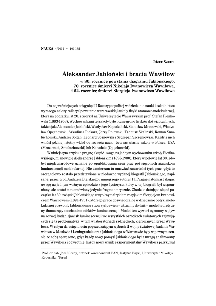 NAUKA 4/2012 • 101-135 JÓZEF SZUDY Aleksander Jabłoński i bracia Wawiłow w 80. rocznicę powstania diagramu Jabłońskiego, 70. rocznicę śmierci Nikołaja Iwanowicza Wawiłowa, i 62. rocznicę śmierci Siergieja Iwanowicza Wawiłowa Do najważniejszych osiągnięć II Rzeczypospolitej w dziedzinie nauki i szkolnictwa wyższego należy zaliczyć powstanie warszawskiej szkoły fizyki atomowo-molekularnej, którą na początku lat 20. stworzył na Uniwersytecie Warszawskim prof. Stefan Pieńkowski (1883-1953). Wychowankami tej szkoły było liczne grono fizyków doświadczalnych, takich jak: Aleksander Jabłoński, Władysław Kapuściński, Stanisław Mrozowski, Władysław Opęchowski, Arkadiusz Piekara, Jerzy Pniewski, Tadeusz Skaliński, Roman Smoluchowski, Andrzej Sołtan, Leonard Sosnowski i Szczepan Szczeniowski. Każdy z nich wniósł później istotny wkład do rozwoju nauki, tworząc własne szkoły w Polsce, USA (Mrozowski, Smoluchowski) lub Kanadzie (Opęchowski). W niniejszym artykule pragnę skupić uwagę na jednym wychowanku szkoły Pieńkowskiego, mianowicie Aleksandrze Jabłońskim (1898-1980), który w połowie lat 30. zdobył międzynarodowe uznanie po opublikowaniu serii prac poświęconych zjawiskom luminescencji molekularnej. Nie zamierzam tu omawiać zawartości tych prac, gdyż to szczegółowo zostało przedstawione w niedawno wydanej biografii Jabłońskiego, napisanej przez prof. Andrzeja Bielskiego i niniejszego autora [1]. Pragnę natomiast skupić uwagę na jednym ważnym epizodzie z jego życiorysu, który w tej biografii był wspomniany, ale został tam omówiony jedynie fragmentarycznie. Chodzi o datujące się od początku lat 30. związki Jabłońskiego z wybitnym fizykiem rosyjskim Siergiejem Iwanowiczem Wawiłowem (1891-1951), którego prace doświadczalne w dziedzinie optyki molekularnej pozwoliły Jabłońskiemu stworzyć pewien – aktualny do dziś – model teoretyczny tłumaczący mechanizm efektów luminescencji. Model ten wywarł ogromny wpływ na rozwój badań zjawisk luminescencji we wszystkich ośrodkach światowych zajmujących się tą problematyką, w tym w laboratoriach radzieckich, kierowanych przez Wawiłowa. W całym dziesięcioleciu poprzedzającym wybuch II wojny światowej badania Wawiłowa w Moskwie i Leningradzie oraz Jabłońskiego w Warszawie były w pewnym sensie ze sobą sprzężone, gdyż każdy nowy pomysł Jabłońskiego był z uwagą analizowany przez Wawiłowa i odwrotnie, każdy nowy wynik eksperymentalny Wawiłowa przykuwał Prof. dr hab. Józef Szudy, członek korespondent PAN, Instytut Fizyki, Uniwersytet Mikołaja Kopernika, Toruń 102 J. Szudy uwagę Jabłońskiego. Można bez przesady orzec, że w tym czasie w dwóch krajach o kompletnie różnych systemach ideologicznych i politycznych funkcjonował „na odległość” unikatowy duet uczonych, harmonijnie dążących do poznania prawdy w zakresie zjawisk molekularnych. Wyrok historii, a konkretnie pakt Ribbentrop-Mołotow sprawił, że to harmonijne współdziałanie zostało brutalnie zakłócone po agresji Związku Sowieckiego na ziemie polskie we wrześniu 1939 r., w wyniku czego Jabłoński został aresztowany i osadzony w obozie w Kozielsku. Tej właśnie sprawy dotyczy niniejszy tekst, w którym opis relacji pomiędzy Jabłońskim a Siergiejem Iwanowiczem Wawiłowem jest osadzony na tle sytuacji w nauce radzieckiej w epoce stalinowskiej z uwypukleniem tragicznego losu Nikołaja Iwanowicza Wawiłowa (1887-1943), starszego brata Siergieja, wybitnego botanika i genetyka. Aresztowanie Jabłońskiego Wczesnym rankiem dnia 12 lipca 1940 r. Aleksander Jabłoński, wówczas docent fizyki doświadczalnej Uniwersytetu Stefana Batorego (USB) – zlikwidowanego pół roku wcześniej przez władze litewskie – został aresztowany w swoim mieszkaniu w Wilnie z polecenia NKWD [2]. Jako porucznik rezerwy saperów uczestniczył on w kampanii wrześniowej, w czasie której został ranny pod Wizną. Na wiadomość o wejściu Armii Czerwonej na terytorium Polski w dniu 17 września 1939 r. Jabłoński przekroczył wraz z częścią swojej kompanii granicę z Litwą i został internowany przez władze litewskie w obozie w Kołotowie (Kulautuwa). Przebywał tam do początku grudnia, kiedy w związku z likwidacją USB został zwolniony z obozu i powrócił do Wilna. Po aresztowaniu Jabłoński został przetransportowany do Kowna i tam dołączony do grupy polskich oficerów nadal przebywających w obozach internowanych na Litwie i następnie wraz z nimi wywieziony do obozu w Kozielsku. Po przybyciu (w dniu 15 lipca 1940 r.) do tego obozu nad jedną z prycz znalazł wyryty podpis swojego brata Feliksa, sędziego sądu okręgowego, porucznika rezerwy artylerii, o którego losach rodzina nie miała żadnych wiadomości od momentu wkroczenia wojsk sowieckich. Nazwisko Feliksa Jabłońskiego pojawiło się potem na liście katyńskiej. Feliks należał do tej grupy polskich oficerów, którzy uwięzieni w Kozielsku zostali rozstrzelani w kwietniu 1940 r. w Katyniu. Przybyła na ich miejsce grupa z Litwy, często nazywana jako Kozielsk II, miała więcej szczęścia, gdyż w stosunku do niej władze sowieckie odstąpiły od eksterminacji, planując zamiast tego przewiezienie ich do obozów „pracy poprawczej” na Półwyspie Kola. Wybuch wojny niemiecko-sowieckiej w dniu 22 czerwca 1941 r. spowodował kompletną zmianę tych planów, w wyniku czego w końcu czerwca Aleksander Jabłoński wraz z wszystkimi więźniami Kozielska II został ewakuowany do obozu w Griazowcu. Tam po ogłoszeniu amnestii wstąpił do armii polskiej organizowanej przez gen. Władysława Andersa na terenie ZSRR na mocy umowy Sikorski–Majski i z tą armią przedostał się Aleksander Jabłoński i bracia Wawiłow 103 do Iraku, skąd – w międzyczasie awansowany do stopnia kapitana – ostatecznie trafił do Wielkiej Brytanii, gdzie po uzyskaniu urlopu z wojska objął stanowisko kierownika Zakł