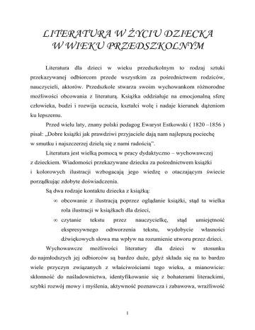 LITERATURA W ŻYCIU DZIECKA W WIEKU PRZEDSZKOLNYM Literatura dla dzieci w wieku przedszkolnym to rodzaj sztuki przekazywanej odbiorcom przede wszystkim za pośrednictwem rodziców, nauczycieli, aktorów. Przedszkole stwarza swoim wychowankom różnorodne możliwości obcowania z literaturą. Książka oddziałuje na emocjonalną sferę człowieka, budzi i rozwija uczucia, kształci wolę i nadaje kierunek dążeniom ku lepszemu. Przed wielu laty, znany polski pedagog Ewaryst Estkowski ( 1820 –1856 ) pisał: „Dobre książki jak prawdziwi przyjaciele dają nam najlepszą pociechę w smutku i najszczerzej dzielą się z nami radością”. Literatura jest wielką pomocą w pracy dydaktyczno – wychowawczej z dzieckiem. Wiadomości przekazywane dziecku za pośrednictwem książki i kolorowych ilustracji wzbogacają jego wiedzę o otaczającym świecie porządkując zdobyte doświadczenia. Są dwa rodzaje kontaktu dziecka z książką: • obcowanie z ilustracją poprzez oglądanie książki, stąd ta wielka rola ilustracji w książkach dla dzieci, • czytanie tekstu ekspresywnego przez nauczycielkę, odtworzenia tekstu, stąd umiejętność wydobycie własności dźwiękowych słowa ma wpływ na rozumienie utworu przez dzieci. Wychowawcze możliwości literatury dla dzieci w stosunku do najmłodszych jej odbiorców są bardzo duże, gdyż składa się na to bardzo wiele przyczyn związanych z właściwościami tego wieku, a mianowicie: skłonność do naśladownictwa, identyfikowanie się z bohaterami literackimi, szybki rozwój mowy i myślenia, aktywność poznawcza i zabawowa, wrażliwość 1 emocjonalna, intensywność w poznawaniu świata i jednocześnie niepodważalny autorytet osób dorosłych, czyli rodziców i wychowawców. Kontakt z literaturą np. baśnią, bajką czy legendą poszerza możliwości poznawania świata, ludzkich losów i obyczajów w perspektywie historii i przestrzeni innych krajów, pozwala na uczestnictwo w wydarzeniach niedostępnych własnym doznaniom i obserwacjom. Starannie dobrane utwory literackie ukazują ich odbiorcom wzory pięknej mowy polskiej. Utrwalone w pamięci fragmenty tekstów stają się przykładem poprawnego języka i mogą mieć wpływ na doskonalenie funkcji mowy pod względem gramatycznym i dźwiękowym, na wzbogacenie zasobu pojęć i słów, na rozwój umiejętności komunikatywnej wypowiedzi i doskonalenie stylu. Utwór literacki, podobnie jak na intelekt, wpływa na sferę emocjonalną dziecka. Świadczy o tym, m.in. jego żywa reakcja kiedy słucha opowiadania, śmieje się i płacze, nieruchomieje w momentach napięcia. Nic tak nie wpływa na wyobraźnię dziecka jak bajka czy baśń. Ich bohaterowie są nosicielami określonych wartości. Postacie te mogą być pozytywne lub negatywne. Bohater pozytywny budzi aprobatę, chęć utożsamiania się z jego postacią, natomiast postać negatywna budzi niechęć, często strach, przykład „ antywzoru” zasługującego na potępienie. „ Kopciuszek”, „ Złota rybka”, „ O krasnoludkach i sierotce Marysi”, to tylko niektóre tytuły uwrażliwiające na krzywdę, wywołujące oczekiwanie sprawiedliwości, utrwalające poczucie porządku moralnego, zgodnie z którym zło powinno być unicestwione, a dobro musi zwyciężyć. Baśnie i bajki mogą również służyć jako stymulator wyobraźni u dzieci. Najprostszym jego sposobem jest zaproponowanie im myślenia innych zakończeń, np. „ Czerwonego Kapturka”, czy „Jasia i Małgosi”. Dziecko nabiera w ten sposób wiary w możliwość w przemiany rzeczywistości nie tylko baśniowej, co ma szczególne znaczenie dla jego rozwoju. Jest to bowiem wstęp do wprowadzania w przyszłości zmian i nowych stanów w sobie i w otoczeniu. 2 Kontaktom dzieci z książką poświęcono wiele miejsca w materiale programowym przeznaczonym dla dzieci w różnym wieku, uwzględniając stopniowe narastanie trudności. Dla 3 – latków przewidziano słuchanie krótkich opowiadań, wierszy i tekstów inscenizowanych, opanowanie umiejętności samodzielnego oglądania książek, obcowanie z artystyczną ilustracją. W grupie 4 – latków ważne jest kształtowanie umiejętności wypowiedzi na temat ilustracji w książkach, wygłaszanie krótkich wierszy, poznawanie utworów budzących wrażliwość na dobro i zło. Dzieci 5 – letnie powinny podejmować próby własnych inscenizacji i ekspresji słownej, poznawać utwory o charakterze lirycznym i humorystycznym. U dzieci 6 – letnich powinno się rozbudzać zainteresowanie książką, kształtować intelektualny i emocjonalny stosunek do książki, kształtować kulturę żywego słowa i nauczyć czytania krótkich tekstów. Wiele radości dostarczają przedszkolakom utwory Czesława Janczarskiego, m.in. „ Opowiadania o Misiu Uszatku”, „Cztery małe krasnoludki”, „Dzień w przedszkolu”; utwory te bawią dzieci, a zarazem zachęcają do pierwszych społecznych kontaktów, prób nawiązania wspólnej zabawy. Codziennych czynności samoobsługowych uczą takie utwory , jak np. „Co Krysia potrafi” Jadwigi Korczakowskiej, czy „Dzień Agatki” Marii Terlikowskiej. Dzieci starsze chętnie słuchają opowiadań Ewy Szelburg – Zarembiny, Heleny Behlerowej, wierszy Tadeusza Kubiaka i Józefa Ratajczaka. Wśród literatury dziecięcej jest również wiele pozycji, które ukazują piękno polskiej przyrody i obyczaju. Są to książki Marii Konopnickiej, Janiny Porazińskiej, Kazimiery Iłłakowiczówny, Hanny Zdzitowieckiej. Obok tekstów prozatorskich, przy różnych okazjach, czytamy i deklamujemy dzieciom wiersze. Recytowanie wierszy W.Grodzieńskiej, Juliana Tuwima, Tadeusza Śliwińskiego, Władysława Broniewskiego, Janiny Porazińskiej, Doroty Gellner, Stanisławy Szychowej, Tadeusza kubiaka jest podstawową formą przybliżania dzieciom języka literatury pięknej 3 i przyswajania przez nie kultury żywego słowa. Tekst poetycki utrwalony w pamięci, wyobraźni i mowi