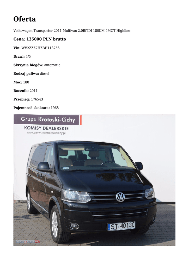 Oferta Volkswagen Transporter 2011 Multivan 2.0BiTDI 180KM 4MOT Highline Cena: 135000 PLN brutto Vin: WV2ZZZ7HZBH113756 Drzwi: 4/5 Skrzynia biegów: automatic Rodzaj paliwa: diesel Moc: 180 Rocznik: 2011 Przebieg: 176543 Pojemność skokowa: 1968 Opis: Auto-Handel-Centrum Krotoski-Cichy Autoryzowany Dealer VW Audi Seat Skoda GWARANCJA POCHODZENIA MOŻLIWOŚĆ SPRAWDZENIA POJAZDU W STACJI OBSŁUGI. MOŻLIWOŚĆ POZOSTAWIENIA SWOJEGO SAMOCHODU UŻYWANEGO W ROZLICZENIU -----------------------------------------------------------------------------------------------------------------------------------------------------Uwaga: Miejsce ekspozycji pojazdu - Grupa Krotoski-Cichy Salon Pojazdów Używanych Wysogotowo, ul. Skórzewska 8 Osoba kontaktowa tel: Maximilian Gera - 609 790 272 Przemysław Mantaj - 601 750 883 Mariusz Kowalewski - 609 795 053 Możliwa jazda próbna po wcześniejszym uzgodnieniu terminu -----------------------------------------------------------------------------------------------------------------------------------------------------Volkswagen T5 Multivan 2.0 180KM BiTDI 4MOT. Highline Pojazd kupiony w Polskim salonie Volkswagen Przebieg: 176 543 km ABS (system zapobiegający blokowaniu kół podczas hamowania) Poduszki powietrzne przednie oraz boczne ASR (system zapobiegający utracie przyczepności kół podczas przyspieszania) Podłoga wyłożona wykładziną welurową Alarm antywłamaniowy z własnym zasilaniem, dozorem wnętrza i zabezpieczeniem przed odholowaniem Przygotowanie do montażu radia: antena w lusterkach zewnętrznych, 8 głośników Czujnik deszczu Rolety przeciwsłoneczne w bocznych oknach Drzwi boczne przesuwne elektrycznie po lewej stronie z domykaniem Siedzenia obrotowe i składane dla dwóch pasażerów w pierwszym rzędzie Drzwi boczne przesuwne elektrycznie po prawej stronie z domykaniem Siedzenie kierowcy i pasażera z podłokietnikami i podparciem odcinka lędźwiowego, podgrzewane Drzwi boczne przesuwne z lewej strony z elektrycznym domykaniem Siedzenie trzyosobowe rozkładane w drugim rzędzie siedzeń, z trzema szufladami EDS-elektron. blokada mech. różnicowego Stolik środkowy, wielofunkcyjny ESP (elektroniczny system stabilizacji toru jazdy z asystentem hamowania) Szyby barwione Felgi aluminiowe Neva, 17 calowe Tapicerka siedzeń Skóra/Alcantara Filtr cząstek stałych (DPF) Tempomat Immobilizer Uchwyty do mocowania ładunku Kierownica i dźwignia zmiany biegów obszyte skórą Wspomaganie ruszania pod górę Klapa tylna z elektrycznym wspomaganiem domykania Wspomaganie układu kierowniczego zależne od prędkości (servotronic) Klimatyzacja z elektroniczną regulacją Climatronic, trzystrefowa Zamek centralny sterowany pilotem z zabezpieczeniem Safe i uruchamianiem od wewnątrz Komputer pokładowy premium (kolorowy wyświetlacz TFT LCD) Zderzaki lakierowane w kolorze nadwozia Listwa osłony wlotu powietrza do chłodnicy chromowana Ściany boczne wyłożone skórą Listwy boczne w kolorze nadwozia 38. Światła do jazdy dziennej Okna przyciemnione w przestrzeni pasażerskiej Światła przeciwmgielne z przodu ze statycznym doświetlaniem zakrętów Pakiet elementów chromowanych (zaw. światła przeciwmgielne) Żaluzja przestrzeni bagażowej Blokada tylnego mechanizmu różnicowego, manualna Lakier metaliczny lub perłowy Pakiet 2690 Pakiet elektryczny I Poduszki (kurtyny) powietrzne w przestrzeni pasażerskiej Rear Assist - asystent parkowania z kamerą w tylnej klapie Skrzynia biegów DSG, automatyczna 7-stopniowa i inne NA POWYŻSZY POJAZD WYSTAWIANA JEST FAKTURA VAT 23% - KUPUJĄCY ZWOLNIONY Z OPŁATY SKARBOWEJ ( 2% wartości pojazdu) -----------------------------------------------------------------------------------------------------------------------------------------------------Oferujemy kompleksową obsługę sprzedaży ratalnej na bardzo dogodnych warunkach - w celu bliższego zapoznania się z aktualną ofertą finansowania prosimy o kontakt : Katarzyna Świątkiewicz - 609 562 980 Oferujemy ubezpieczenia samochodowe z wiodących na rynku ubezpieczalni - możliwość zakupu pakietu ubezpieczeniowego na miejscu. Oferujemy możliwość jazdy próbnej przed zakupem oraz usługę inspekcji pojazdu. Przyjmujemy również w rozliczeniu każdy pojazd. -----------------------------------------------------------------------------------------------------------------------------------------------------Ogłoszenie ma charakter informacyjny i stanowi zaproszenie do zawarcia umowy (art. 71 Kodeksu cywilnego); nie stanowi natomiast oferty handlowej w rozumieniu art. 66 § 1 Kodeksu cywilnego. W celu sprawdzenia zgodności oferty oraz uzyskania wszelkich informacji prosimy kontaktować się z handlowcem d.s. samochodów używanych Auto możesz zobaczyć: