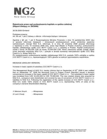 Rejestracja przez sąd podwyższenia kapitału w spółce zależnej (Raport bieżący nr 39/2008) 26.09.2008 /Emitent/ Podstawa prawna: Art. 56 ust. 1 pkt 2 Ustawy o ofercie –informacje bieżące i okresowe Zgodnie z §5 ust. 1 pkt 9 Rozporządzenia Ministra Finansów z dnia 19 października 2005 roku w sprawie informacji bieżących i okresowych przekazywanych przez emitentów papierów wartościowych, Zarząd NG2 S.A. informuje, iż w dniu 25 września 2008 powziął informację o rejestracji w dniu 15 września 2008 roku, przez Sąd Miejski w Pradze (Czechy), podwyższenia kapitału zakładowego spółki CCC BOTY Czech s.r.o. z siedzibą w Pradze. Kapitał podwyższony został z kwoty 34.200.000 CZK do kwoty 75.000.000 CZK. Nowo utworzone udziały zostały objęte przez jedynego wspólnika NG2 S.A. i pokryte w drodze konwersji wierzytelności spółki CCC Boty Czech s.r.o. wobec NG2 S.A. Po zarejestrowaniu podwyższenia kapitału zakładowego NG2 S.A. posiada 100% udziałów w spółce CCC BOTY Czech s.r.o., reprezentujących 100% głosów na walnym zgromadzeniu wspólników. MESSAGE (ENGLISH VERSION) Increase in basic capital of subsidiary CCC BOTY Czech s.r.o. The Management Board of NG2 S.A. hereby informs that on September of 25th 2008 it was notified that on September 15th 2008 the Municipal Court in Prague (Czech Republic) issued a decision concerning an increase in the basic capital of CCC BOTY Czech s.r.o. . The subsidiary’s basic capital was increased from CZK 34,200,000 to CZK 75,000,000. The new created shares was acquired by NG2 S.A., company’s sole shareholder and covered by way of conversion of CCC BOTY Czech s.r.o. liabilities to NG2 S.A. Following the registration of the capital increase at CCC BOTY Czech s.r.o., NG2 S.A. holds 100% shares in CCC BOTY Czech s.r.o, representing 100% of votes at the company’s General Shareholders Meeting. 1/ Mariusz Gnych – Wiceprezes 2/ Lech Chudy - Wiceprezes NG2 SA, ul. Strefowa 6, 59-101 Polkowice, tel. (076) 845 84 00, fax (0-76) 845 84 31, www.ng2.pl, [email protected], NIP 692-22-00-609 Sąd Rejonowy dla Wrocławia-Fabrycznej we Wrocławiu IX Wydział Gospodarczy Krajowego Rejestru Sądowego KRS 0000211692 Wysokość kapitału zakładowego – 3 840 000,00 zł, Wysokość kapitału wpłaconego – 3 840 000,00 zł