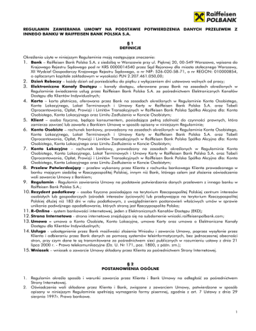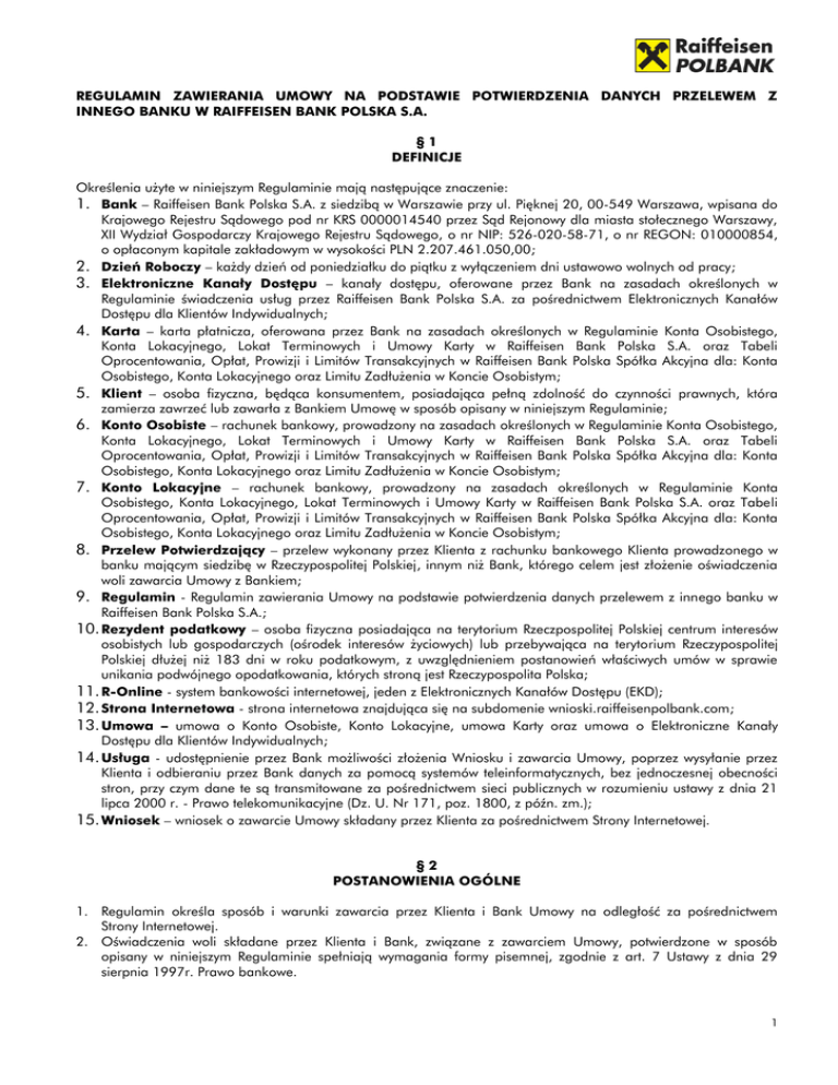 REGULAMIN ZAWIERANIA UMOWY NA PODSTAWIE POTWIERDZENIA DANYCH PRZELEWEM Z INNEGO BANKU W RAIFFEISEN BANK POLSKA S.A. §1 DEFINICJE Określenia użyte w niniejszym Regulaminie mają następujące znaczenie: 1. Bank – Raiffeisen Bank Polska S.A. z siedzibą w Warszawie przy ul. Pięknej 20, 00-549 Warszawa, wpisana do Krajowego Rejestru Sądowego pod nr KRS 0000014540 przez Sąd Rejonowy dla miasta stołecznego Warszawy, XII Wydział Gospodarczy Krajowego Rejestru Sądowego, o nr NIP: 526-020-58-71, o nr REGON: 010000854, o opłaconym kapitale zakładowym w wysokości PLN 2.207.461.050,00; 2. Dzień Roboczy – każdy dzień od poniedziałku do piątku z wyłączeniem dni ustawowo wolnych od pracy; 3. Elektroniczne Kanały Dostępu – kanały dostępu, oferowane przez Bank na zasadach określonych w Regulaminie świadczenia usług przez Raiffeisen Bank Polska S.A. za pośrednictwem Elektronicznych Kanałów Dostępu dla Klientów Indywidualnych; 4. Karta – karta płatnicza, oferowana przez Bank na zasadach określonych w Regulaminie Konta Osobistego, Konta Lokacyjnego, Lokat Terminowych i Umowy Karty w Raiffeisen Bank Polska S.A. oraz Tabeli Oprocentowania, Opłat, Prowizji i Limitów Transakcyjnych w Raiffeisen Bank Polska Spółka Akcyjna dla: Konta Osobistego, Konta Lokacyjnego oraz Limitu Zadłużenia w Koncie Osobistym; 5. Klient – osoba fizyczna, będąca konsumentem, posiadająca pełną zdolność do czynności prawnych, która zamierza zawrzeć lub zawarła z Bankiem Umowę w sposób opisany w niniejszym Regulaminie; 6. Konto Osobiste – rachunek bankowy, prowadzony na zasadach określonych w Regulaminie Konta Osobistego, Konta Lokacyjnego, Lokat Terminowych i Umowy Karty w Raiffeisen Bank Polska S.A. oraz Tabeli Oprocentowania, Opłat, Prowizji i Limitów Transakcyjnych w Raiffeisen Bank Polska Spółka Akcyjna dla: Konta Osobistego, Konta Lokacyjnego oraz Limitu Zadłużenia w Koncie Osobistym; 7. Konto Lokacyjne – rachunek bankowy, prowadzony na zasadach określonych w Regulaminie Konta Osobistego, Konta Lokacyjnego, Lokat Terminowych i Umowy Karty w Raiffeisen Bank Polska S.A. oraz Tabeli Oprocentowania, Opłat, Prowizji i Limitów Transakcyjnych w Raiffeisen Bank Polska Spółka Akcyjna dla: Konta Osobistego, Konta Lokacyjnego oraz Limitu Zadłużenia w Koncie Osobistym; 8. Przelew Potwierdzający – przelew wykonany przez Klienta z rachunku bankowego Klienta prowadzonego w banku mającym siedzibę w Rzeczypospolitej Polskiej, innym niż Bank, którego celem jest złożenie oświadczenia woli zawarcia Umowy z Bankiem; 9. Regulamin - Regulamin zawierania Umowy na podstawie potwierdzenia danych przelewem z innego banku w Raiffeisen Bank Polska S.A.; 10. Rezydent podatkowy – osoba fizyczna posiadająca na terytorium Rzeczpospolitej Polskiej centrum interesów osobistych lub gospodarczych (ośrodek interesów życiowych) lub przebywająca na terytorium Rzeczypospolitej Polskiej dłużej niż 183 dni w roku podatkowym, z uwzględnieniem postanowień właściwych umów w sprawie unikania podwójnego opodatkowania, których stroną jest Rzeczypospolita Polska; 11. R-Online - system bankowości internetowej, jeden z Elektronicznych Kanałów Dostępu (EKD); 12. Strona Internetowa - strona internetowa znajdująca się na subdomenie wnioski.raiffeisenpolbank.com; 13. Umowa – umowa o Konto Osobiste, Konto Lokacyjne, umowa Karty oraz umowa o Elektroniczne Kanały Dostępu dla Klientów Indywidualnych; 14. Usługa - udostępnienie przez Bank możliwości złożenia Wniosku i zawarcia Umowy, poprzez wysyłanie przez Klienta i odbieraniu przez Bank danych za pomocą systemów teleinformatycznych, bez jednoczesnej obecności stron, przy czym dane te są transmitowane za pośrednictwem sieci publicznych w rozumieniu ustawy z dnia 21 lipca 2000 r. - Prawo telekomunikacyjne (Dz. U. Nr 171, poz. 1800, z późn. zm.); 15. Wniosek – wniosek o zawarcie Umowy składany przez Klienta za pośrednictwem Strony Internetowej. §2 POSTANOWIENIA OGÓLNE 1. Regulamin określa sposób i warunki zawarcia przez Klienta i Bank Umowy na odległość za pośrednictwem Strony Internetowej. 2. Oświadczenia woli składane przez Klienta i Bank, związane z zawarciem Umowy, potwierdzone w sposób opisany w niniejszym Regulaminie spełniają wymagania formy pisemnej, zgodnie z art. 7 Ustawy z dnia 29 sierpnia 1997r. Prawo bankowe. 1 §3 ZASADY ŚWIADCZENIA USŁUGI 1. Bank udostępnia Wniosek przez całą dobę 7 dni w tygodniu, z wyłączeniem przerw technicznych (konserwacja, przegląd, wymiana sprzętu) oraz przerw podyktowanych względami bezpieczeństwa lub innymi przyczynami niezależnymi od Banku (siła wyższa lub działanie osób trzecich). 2. Klient przyjmuje do wiadomości i akceptuje, że zakazane jest dostarczanie za pośrednictwem Wniosku treści o charakterze bezprawnym, obraźliwym, mogących wprowadzić w błąd oraz zawierających wirusy lub mogących wywołać zakłócenia lub uszkodzenia systemów teleinformatycznych. 3. Urządzenie elektroniczne, z którego następuje dostęp do Strony Internetowej, powinno spełniać następujące wymagania: 1) posiadać system operacyjny na bieżąco uaktualniany poprzez instalacje poprawek i aktualizacji, natychmiast po udostępnieniu ich przez producenta; 2) posiadać program antywirusowy monitorujący na bieżąco system operacyjny; 3) bazy wirusów programu antywirusowego powinny być uaktualniane natychmiast po przygotowaniu nowej wersji baz przez dostawcę programu antywirusowego; 4) posiadać osobistą zaporę (personal firewall) monitorującą ruch sieciowy stacji Klienta i wyposażoną w funkcje blokowania ruchu wchodzącego i wychodzącego z komputera Klienta; 5) posiadać zainstalowaną przeglądarkę internetową wraz ze wszystkimi aktualizacjami bezpieczeństwa: Internet Explorer w wersji minimum 11.X, Firefox w wersji minimum 27.x lub Google Chrome w wersji minimum 33.X. Dopuszczalne jest stosowanie innych wersji przeglądarek intern