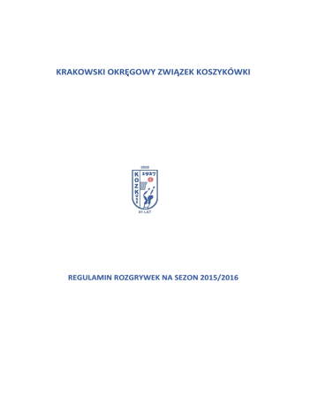 KRAKOWSKI OKRĘGOWY ZWIĄZEK KOSZYKÓWKI REGULAMIN ROZGRYWEK NA SEZON 2015/2016 POSTANOWIENIA OGÓLNE §1 1. Rozgrywki mistrzowskie prowadzone są przez Krakowski Okręgowy Związek Koszykówki, a organizuje je Wydział Gier i Dyscypliny KOZKosz. 2. We wszystkich zawodach organizowanych przez KOZKosz obowiązuje Regulamin Rozgrywek zatwierdzony przez Zarząd KOZKosz, Regulamin Współzawodnictwa Sportowego PZKosz, Regulamin Dyscyplinarny PZKosz, Regulamin Opłat PZKosz, Regulamin Opłat KOZKosz. 3. W rozgrywkach biorą udział zespoły województwa świętokrzyskiego, z którym województwo małopolskie tworzy wspólną strefę w rozgrywkach centralnych. 4. W rozgrywkach prowadzonych przez KOZKosz: kadeci/kadetki B, młodzicy/młodziczki, chłopcy/dziewczęta, Zarząd KOZKosz zastrzega sobie prawo do modyfikacji niektórych Przepisów Gry w Koszykówkę oraz Regulaminu Cyklu PZKosz. 5. W rozgrywkach minikoszykówki U-12 (2004 i młodsi) obowiązuje regulamin zatwierdzony oddzielnie. 6. Tytuł „Mistrza Małopolski” nie będzie przyznawany, gdy do rozgrywek zgłosi się mniej niż 4 zespoły w strefie. 7. Zawodnicy zagraniczni (nieposiadający statusu zawodnika miejscowego w rozumieniu RWS PZKosz) mogą występować w rozgrywkach po uzyskaniu indywidualnej zgody Zarządu PZKosz. 8. Sezon sportowy 2015/2016 to okres od 1 lipca 2015 do 30 czerwca 2016. §2 1. W sezonie sportowym 2015/2016 rozgrywki zostaną przeprowadzone w następujących klasach rozgrywkowych: - 2 liga Kobiet ustali organizator - 3 liga Mężczyzn mecze w niedziele - klasa juniorek starszych rocznik 1994 i młodsze przemiennie - klasa juniorów starszych rocznik 1996 i młodsi w nd przemiennie - klasa juniorek rocznik 1998-99 (co najmniej 6) w nd przemiennie - klasa juniorów rocznik 1998-99 „ w soboty - klasa kadetek A rocznik 2000-01 „ w soboty - klasa kadetów A rocznik 2000-01 „ w niedziele - klasa młodziczek rocznik 2002 i młodsze w niedziele - klasa młodzików rocznik 2002 i młodsi w soboty - klasa dziewcząt rocznik 2003 i młodsze w soboty - klasa chłopców rocznik 2003 i młodsi w niedziele - klasa kadetek B rocznik 2001 i młodsze liga - klasa kadetów B rocznik 2001 i młodsi liga - minikoszykówka dz/ch rocznik 2004 i młodsze turnieje 2. W klasach kadetów B, kadetek B, młodzików, młodziczek, chłopców i dziewcząt obowiązują przepisy szczególne, zawarte w załączniku nr 6 do Regulaminu Rozgrywek. 3. WGiD może wyznaczyć inne terminy rozgrywania meczy, gdy będzie taka konieczność. Przerwy w terminarzach rozgrywek wynikają z kalendarza PZKosz, zgrupowań kadr wojewódzkich. Świąt i ferii zimowych oraz turniejów organizowanych przez KOZKosz. 4. W jednej klasie rozgrywkowej mogą występować dwa lub więcej zespoły tego samego klubu. Awans do rozgrywek szczebla centralnego (ćwierćfinały lub półfinały MP) może uzyskać tylko jeden zespół. Zapis ten nie dotyczy rozgrywek seniorskich: 3 LM i 2 LK, w których stosuje się postanowienia RWS PZKosz. 5. W przypadku rezygnacji drużyny z rozgrywek szczebla centralnego (ćwierćfinały, półfinały MP) w jej miejsce awansuje drużyna, która zajęła kolejne miejsce w tabeli (np. z gry w MP rezygnuje drużyna, która zajęła 2 miejsce w tabeli w strefie, w jej miejsce awansuje drużyna z 3 miejsca w tabeli, a drużyna, która zajęła 4 miejsce w rozgrywkach strefowych awansuje z 3 miejsca do MP). 6. Kluby, które w danej klasie zgłosiły dwa lub więcej zespołów, po zakończeniu rozgrywek w strefie 3 (małopolska-świętokrzyskie) do rozgrywek szczebla centralnego mogą zgłosić wszystkich zawodników z tych zespołów. §3 1. Wszelka korespondencja z klubami prowadzona przez KOZKosz (WGiD) odbywać się będzie za pośrednictwem poczty elektronicznej. Korespondencja elektroniczna wysłana z adresu [email protected] i [email protected] jest uznawana jak przesłana listem poleconym. Pisma kierowane będą na wskazane przez Kluby ( w załączniku nr 3 Regulaminu Rozgrywek KOZKosz) adresy e-mail i traktowane będą, jako skutecznie doręczone ze wszelkimi tego konsekwencjami. Dokumenty przesyłane będą faksem lub listem tylko w wyjątkowych przypadkach. 2. Wszelkie załączniki do komunikatów wydawanych przez WR PZKosz, jak również załączniki do Regulaminu Współzawodnictwa Sportowego PZKosz, mają charakter druków oficjalnych Polskiego Związku Koszykówki, wobec czego nieużywanie takich druków skutkować może odmową ich przyjęcia lub orzekaniem kar dyscyplinarnych za nieposługiwanie się drukami oficjalnymi (dotyczy również załączników do Regulaminu Rozgrywek KOZKosz). 3. Sprawy związane z rozgrywkami rozpatrywane są w godzinach otwarcie biura KOZKosz. §4 1. Wszystkie kluby zobowiązane są do obowiązkowego ubezpieczenia zawodniczek i zawodników od następstw nieszczęśliwych wypadków na skutek uprawiania sportu kwalifikowanego (art. 31 ustawy z dnia 29 lipca 2005 r. o sporcie kwalifikowanym Dz. U. Z 2005 r. nr 155 poz. 1289 oraz art. 52 ustawy z dnia 18 sierpnia 1996 r. o kulturze fizycznej DZ. U. Z 2001 r. nr 81 poz. 889 z późniejszymi zmianami). 2. Kluby zobowiązane są do złożenia oświadczenia (druk załącznik nr 1 Regulaminu Rozgrywek). KOZKosz może żądać od klubów przedłożenia kopii umowy ubezpieczenia zawodników. ZGŁOSZENIE DRUŻYN §5 1. W rozgrywkach sezonu 2015/2016 będą uczestniczyć zespoły, które zgłoszą swój udział do danej klasy rozgrywkowej e-mailem na adres [email protected] lub [email protected] w nieprzekraczalnym terminie do 17.08.2015 r, oprócz klasy chłopców i dziewcząt oraz minikoszykówki, gdzie termin upływa 30.09.2015. 2. Zgłoszenie drużyn po wyznaczonych terminach jest możliwe wyłącznie za zgodą Prezydium KOZKosz. Termin ten nie może przekroczyć 7 dni, a opłata wpisowa jest podwyższona o 100% 3. Wszystkie kluby uczestniczące w rozgrywkach organizowanych przez KOZKosz zobowiązane są do dostarczenia wypełnionego i opieczętowanego 