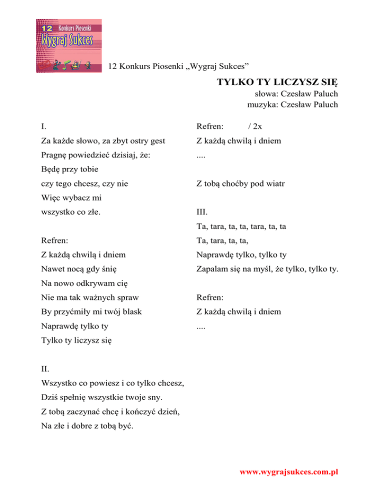 12 Konkurs Piosenki „Wygraj Sukces” TYLKO TY LICZYSZ SIĘ słowa: Czesław Paluch muzyka: Czesław Paluch I. Refren: / 2x Za każde słowo, za zbyt ostry gest Z każdą chwilą i dniem Pragnę powiedzieć dzisiaj, że: .... Będę przy tobie czy tego chcesz, czy nie Z tobą choćby pod wiatr Więc wybacz mi wszystko co złe. III. Ta, tara, ta, ta, tara, ta, ta Refren: Ta, tara, ta, ta, Z każdą chwilą i dniem Naprawdę tylko, tylko ty Nawet nocą gdy śnię Zapalam się na myśl, że tylko, tylko ty. Na nowo odkrywam cię Nie ma tak ważnych spraw Refren: By przyćmiły mi twój blask Z każdą chwilą i dniem Naprawdę tylko ty .... Tylko ty liczysz się II. Wszystko co powiesz i co tylko chcesz, Dziś spełnię wszystkie twoje sny. Z tobą zaczynać chcę i kończyć dzień, Na złe i dobre z tobą być. www.wygrajsukces.com.pl