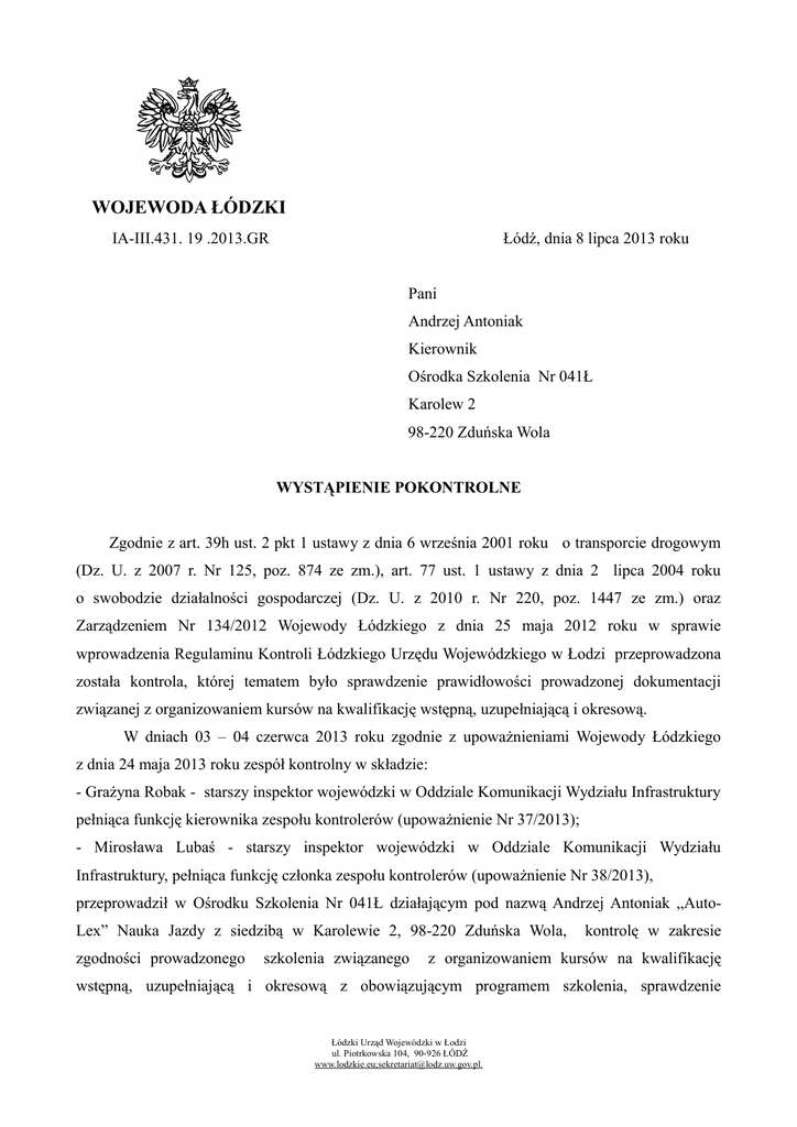 WOJEWODA ŁÓDZKI IA-III.431. 19 .2013.GR Łódź, dnia 8 lipca 2013 roku Pani Andrzej Antoniak Kierownik Ośrodka Szkolenia Nr 041Ł Karolew 2 98-220 Zduńska Wola WYSTĄPIENIE POKONTROLNE Zgodnie z art. 39h ust. 2 pkt 1 ustawy z dnia 6 września 2001 roku o transporcie drogowym (Dz. U. z 2007 r. Nr 125, poz. 874 ze zm.), art. 77 ust. 1 ustawy z dnia 2 lipca 2004 roku o swobodzie działalności gospodarczej (Dz. U. z 2010 r. Nr 220, poz. 1447 ze zm.) oraz Zarządzeniem Nr 134/2012 Wojewody Łódzkiego z dnia 25 maja 2012 roku w sprawie wprowadzenia Regulaminu Kontroli Łódzkiego Urzędu Wojewódzkiego w Łodzi przeprowadzona została kontrola, której tematem było sprawdzenie prawidłowości prowadzonej dokumentacji związanej z organizowaniem kursów na kwalifikację wstępną, uzupełniającą i okresową. W dniach 03 – 04 czerwca 2013 roku zgodnie z upoważnieniami Wojewody Łódzkiego z dnia 24 maja 2013 roku zespół kontrolny w składzie: - Grażyna Robak - starszy inspektor wojewódzki w Oddziale Komunikacji Wydziału Infrastruktury pełniąca funkcję kierownika zespołu kontrolerów (upoważnienie Nr 37/2013); - Mirosława Lubaś - starszy inspektor wojewódzki w Oddziale Komunikacji Wydziału Infrastruktury, pełniąca funkcję członka zespołu kontrolerów (upoważnienie Nr 38/2013), przeprowadził w Ośrodku Szkolenia Nr 041Ł działającym pod nazwą Andrzej Antoniak „AutoLex” Nauka Jazdy z siedzibą w Karolewie 2, 98-220 Zduńska Wola, zgodności prowadzonego szkolenia związanego kontrolę w zakresie z organizowaniem kursów na kwalifikację wstępną, uzupełniającą i okresową z obowiązującym programem szkolenia, sprawdzenie Łódzki Urząd Wojewódzki w Łodzi ul. Piotrkowska 104, 90-926 ŁÓDŹ www.lodzkie.eu;[email protected]. dokumentacji wymaganej w związku z prowadzeniem szkolenia oraz kontrola dokumentacji osób przystępujących do uzyskania kwalifikacji, w szczególności spełniających wymagania określone w art. 39b i art. 39b2 ustawy o transporcie drogowym, za okres od dnia 01 stycznia do dnia 31 grudnia 2012 roku. Ośrodek Szkolenia Nr 041Ł jest prowadzony przez Andrzeja Antoniaka „Auto-Lex” Nauka Jazdy w Karolewie 2, 98-220 Zduńska Wola na podstawie posiadanego tytułu prawnego do nieruchomości (akt notarialny repertorium A nr 4719/98) oraz w Zduńskiej Woli przy ul. Juliusza 34 na podstawie umowy najmu lokalu użytkowego z dnia 02 stycznia 2011 roku. W wyniku przeprowadzonej kontroli działalności Ośrodka Szkolenia Nr 041Ł pod nazwą „Auto-Lex” Nauka Jazdy Andrzej Antoniak, w kontrolowanym zakresie ocenia się pozytywnie z nieprawidłowościami, na podstawie niżej wymienionych cząstkowych ocen i ustaleń. Ośrodek szkolenia jest dobrze przygotowany do wykonywania zadań związanych ze szkoleniem osób wykonujących przewóz drogowy. 1. W zakresie prowadzenia zajęć teoretycznych na kwalifikację wstępną, przyśpieszoną i uzupełniającą. Zajęcia teoretyczne prowadzone są zgodnie z obowiązującym programem w oparciu o platformę eLearningu pod opieką wykładowcy-trenera. Platformę eLearningu dostarcza firma LIWONA Sp. z o.o. z siedzibą w Warszawie na podstawie umowy licencyjnej zawartej w dniu 14 listopada 2011 roku. Przedsiębiorca posiada wiedzę, umiejętności i wykształcenie niezbędne do zapewnienia prawidłowego przebiegu szkolenia w oparciu o rozporządzenie Ministra Infrastruktury z dnia 1 kwietnia 2010 roku w sprawie szkolenia kierowców wykonujących przewóz drogowy (Dz. U. Nr 53, poz. 314). Przedsiębiorca posiada także certyfikat trenera – wykładowcy Portalu Szkoleniowego – Kierowca Zawodowy w zakresie kat. prawa jazdy C1, C1+E C, C+E, D1, D1+E, D, D+E. Szkolenie kursantów w warunkach specjalnych, o których mowa w art. 39g ust.11 pkt. 1 ustawy z dnia 6 września 2001 roku o transporcie drogowym, odbywa się na podstawie zawartych umów: a) w dniu 01 grudnia 2011 roku z Łódzkim Stowarzyszeniem Przewoźników Międzynarodowych i Spedycji z siedzibą w Łodzi przy ul. Górniczej 18/36, – umowa najmu symulatora jazdy samochodem ciężarowym i autobusem do szkolenia zawodowych kierowców nr 21/11/2011 – przedmiotowe urządzenie posiada certyfikat zgodności NR Z/15/090/11 wydany przez Instytut Transportu Samochodowego– Pracownia Certyfikacji; Łódzki Urząd Wojewódzki w Łodzi ul. Piotrkowska 104, 90-926 ŁÓDŹ www.lodzkie.eu;[email protected]. – umowa Nr 5/2011 przedmiotem której jest przeprowadzenie zajęć praktycznych w ruchu drogowym do kategorii D prawa jazdy autobusem marki RENAULT nr rej. EL 176HE; – umowa Nr 6/2011 przedmiotem której jest przeprowadzenie zajęć praktycznych w ruchu drogowym do kategorii C prawa jazdy samochodem ciężarowym marki SCANIA nr rej. EL 176HE; b) w dniu 22 listopada 2012 roku z Centrum Edukacji Zawodowej CARGO spółka z o.o. z siedzibą w Jaworznie przy ul. Krakowskiej 9. – U-001.S – umowa wykonywania usługi szkoleniowej z zakresu jazdy w warunkach specjalnych z wykorzystaniem mobilnego symulatora jazdy posiadającego certyfikat zgodności NR 001/011/RM/2012 wydany przez Instytut Zaawansowanych Technologii Wytwarzania – Zakład Certyfikacji; – U-004.S – umowa wykonywania usługi szkoleniowej z zakresu jazdy w warunkach drogowych z wykorzystaniem autobusu MAN RHC 404 (LION'S COACH) nr rejestracyjny SJ 56222; – U-005.S – umowa wykonywania usługi szkoleniowej z zakresu jazdy w warunkach drogowych z wykorzystaniem samochodu ciężarowego MAN TGL – 12.250 4x2 nr rejestracyjny WGM SS52 Przedmiotowe szkolenia kierowców zawodowych w ramach kwalifikacji wstępnej, wstępnej przyśpieszonej i uzupełniającej w zakresie zajęć praktycznych z jazdy w warunkach specjalnych prowadzone są przez osoby posiadające prawem przewidziane kwalifikacje, uprawnienia instruktora techniki jazdy oraz odpowiednią wiedzę techniczną. 2. Ośrodek dysponuje pojazdami samochodowymi odpowiednimi do zakresu prowadzonego szkolenia (art. 39g ust.2 pkt. 