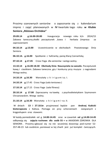 Prosimy szanownych seniorów o zapoznanie się z kalendarium imprez i zajęć planowanych w IV kwartale tego roku w Klubie Seniora „Różowa Orchidea” 29.09.14 g.16.00-20.00 Inauguracja nowego roku k/o 2014/15 Zabawa taneczna,słodki poczęstunek ,kawa i herbata (impreza za zaproszeniami 04.10.14 Seniora. .g.13.00 Uczestniczenie w obchodach Powiatowego 06.10.14. g.16.00 Spotkanie z hafciarką panią Klarą Czerwińską 07.10.14 Cross Yoga dla seniorów –wstęp wolny. g.17.45 Dnia 13.10.14 g.16.00-18.30 Obchody Dnia Nauczyciela na wesoło. Poczęstunek kawą i ciastkiem. Zabawa taneczna ,gry i konkursy przy muzyce z nagrodami Wstęp wolny. 14.10.14 g.16.30 Warsztaty z k i r i g a m i cz. I. 14.10.14 g.17.45 Cross Yoga (sala tenisowa ) 17.10.14 g.17.15 Cross Yoga (sala fitness) 20.10.14 g 17.00 Zapraszamy na kawkę Chrzanowskim. Wstęp wolny. z psychodietetykiem Szymonem 21.10.14 g.16.30 Warsztaty z k i r i g a m i –cz. II. W dniach 13 i 27.10.br. przyjmować będzie pan Andrzej Kubicki bioterapeuta z Kalisza. Pomaga on przy schorzeniach związanych z kręgosłupem oraz stawami. W każdy poniedziałek od g. 14.00-14.45 oraz w czwartek od g.14.00-14.45 odbywają się zajęcia ruchowe dla osób 55 + w AKADEMII ZDROWIA DLA SENIORA . Prosimy zgłaszać się na nie wcześniej dzwoniąc pod numer 52357-48-23 lub osobiście ,ponieważ w tej chwili jest już komplet ćwiczących. Nowe osoby, zapisujemy na czwartek. g.15.00 w poniedziałek i na g.13.00 w Ponadto w każdy czwartek od g.15.00-15.45 można uczestniczyć w nauce języka angielskiego od podstaw. 3.11.14 o g.17.00 Odbędą się Zaduszki poetyckie. Wstęp wolny. Ogłaszamy kreatywny konkurs pt. Anioł z przeslaniem”, który przeznaczony jest także dla seniorów. Regulamin dostępny będzie na naszej stronie internetowej. Dnia 21 .11.14 o g.16.30 odbędzie się przestawienie teatralne dla dzieci pt. ”Troskliwe misie” Zapraszamy na nie wszystkie Babcie i Dziadków wraz z wnukami i wnuczkami. Obchodzić będziemy Święto Pluszowego Misia. Wstęp wolny 24.11.14 odbędą się Andrzejki .Jak zwykle zaproszenia są do nabycia u pani Eli W ramach wstępu zapewniona jest zabawa, wróżby andrzejkowe przy muzyce oraz kawa, herbata i ciastka. Serdecznie zapraszamy. 28.11.14 odbędą się Andrzejki wokalno-poetyckie .Wstęp wolny 5 grudnia organizujemy dla naszych najmłodszych pociech wraz z opiekunami nietypowe Mikołajki. Zgłaszać się można na nie u p. Krzysztofa Karwata