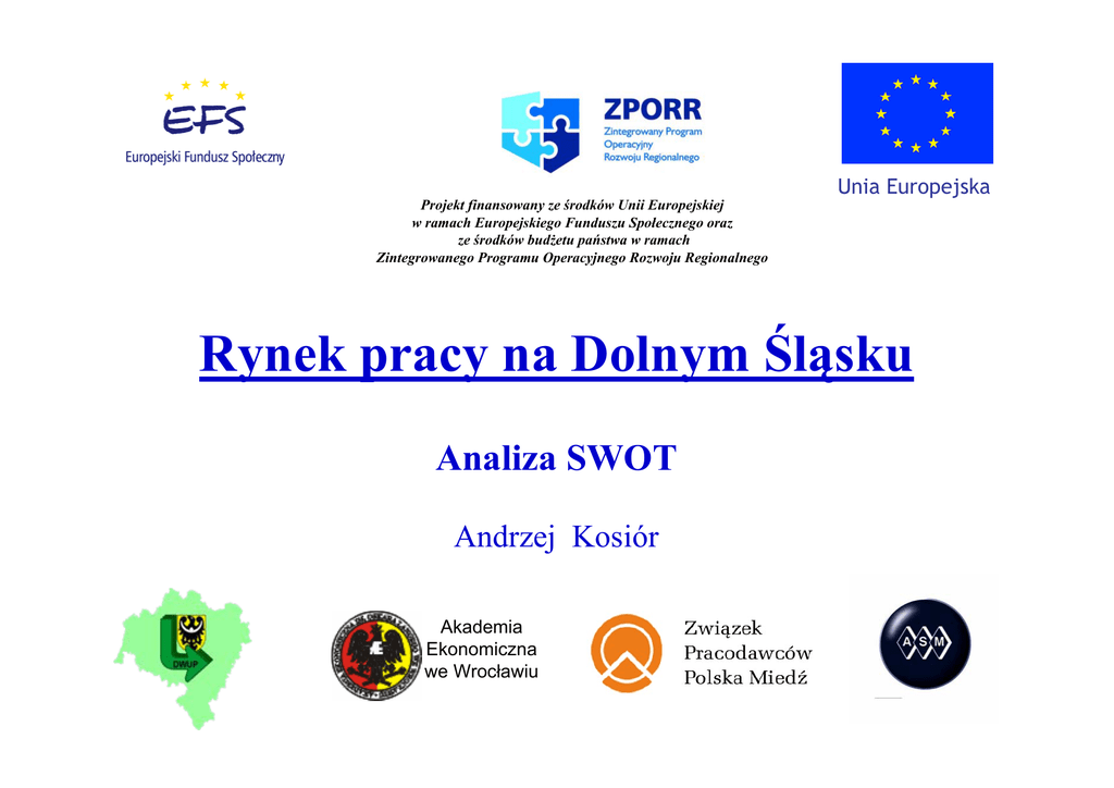 Projekt finansowany ze środków Unii Europejskiej w ramach Europejskiego Funduszu Społecznego oraz ze środków budżetu państwa w ramach Zintegrowanego Programu Operacyjnego Rozwoju Regionalnego Unia Europejska Rynek pracy na Dolnym Śląsku Analiza SWOT Andrzej Kosiór Akademia Ekonomiczna we Wrocławiu Rynek pracy - definicje Miejsce, na którym odbywa się proces kupna oraz sprzedaży pracy; Kupującym są pracodawcy; Sprzedającym są osoby poszukujące pracy – pracobiorcy, oferujące kompetencje (wykształcenie, kwalifikacje, umiejętności) oraz dyspozycyjność, siłę fizyczną i czas Rynek pracy – definicje, c.d. Rynek pracy nie jest rynkiem wolnego wyboru, gdyż: • popyt i podaż pozostają w chronicznej nierównowadze m. in. ze względu na bezwładność (opóźnienie) w produkowaniu kompetencji • płaca jako cena pracy w istocie nie stwarza mechanizmów „oczyszczania rynku”; ani popyt na pracę, ani jej podaż nie zależą od wysokości płac • zawierane na nim transakcje nie przebiegają w warunkach wolności wyboru pracobiorców (zjawisko wymuszonego przywiązania do pracy) • relacje zachodzące między pracobiorcą a pracodawcą są stosunkiem społecznym realizowanym pod przymusem przepisów prawa pracy. Dlatego rynek ten wymaga „wspomagania”. Rynek pracy - uczestnicy • ABSOLWENCI szkół, którzy uzyskali wykształcenie: • podstawowe • gimnazjalne • zawodowe • średnie (Liceum Zawodowe, Liceum Profilowane, Liceum Uzupełniające, Liceum Ogólnokształcące, Technikum, Policealne Studium) • wyższe (Uniwersytety, Akademie, Politechniki, Wyższe Szkoły Zawodowe, Uczelnie Prywatne) • Podyplomowe • OSOBY DOKSZTAŁCAJĄCE SIĘ, które biorą udział w kursach, szkoleniach, treningach, warsztatach, praktykach • PRACODAWCY - przedsiębiorstwa Rynek pracy - instytucje realizują zadania państwa w zakresie promocji zatrudnienia, łagodzenia skutków bezrobocia oraz aktywizacji zawodowej, a także wzmacniania integracji oraz solidarności społecznej; są to: • • • • • publiczne służby zatrudnienia (urzędy pracy) agencje zatrudnienia (biura pośrednictwa pracy) Ochotnicze Hufce Pracy instytucje szkoleniowe instytucje mające w zakresie obowiązków monitorowanie rynku pracy • instytucje dialogu społecznego i partnerstwa lokalnego (związki zawodowe, pracodawców i bezrobotnych, organizacje pozarządowe współpracujące z publicznymi służbami zatrudnienia) Dolnośląski rynek pracy wg GUS Aktywni zawodowo w tys. osób 1400 1200 1000 800 Ogółem Bezrobotni Pracujący 600 400 200 0 2000 2003 2004 2005 Struktura pracujących na Dolnym Śląsku w rolnictwie i leśnictwie 16,0% w przemyśle 28,0% inne 5,0% w usługach nierynkowych 19,0% w usługach rynkowych 32,0% Podział kosztów pracy składka na ubezp. zdrowotne 6,0% kładka na ubezp. społ.-chorobowe 2,0% zaliczka na podatek dochodowy 5,0% kładka na ubezp. społ.-rentowe 5,0% kładka na ubezp. społ.-emerytalne PFRON 8,0% 2,0% składka na FP składka na ubezp. składka na ubezp. składka na ubezp. 2,0% społ.-emerytalne społ.-chorobowe społ.-rentowe 8,0% 1,0% 5,0% wynagrodzenie netto 56,0% Warsztat Część I Mocne strony regionalnego rynku pracy wg obowiązujących opracowań strategicznych • • • • • • wykształcenie i umiejętności pracowników dyspozycyjność pracowników umiarkowane ceny pracy – płace dobre relacje pracodawca – pracownik wzrost liczby młodych pracowników sieć instytucji wspomagających rynek Słabe strony regionalnego rynku pracy wg obowiązujących opracowań strategicznych • sztywne ramy prawne stosunków pracy • nieadekwatna do popytu struktura podaży (m.in. nieelastyczne szkolnictwo zawodowe, brak nawyków ustawicznego kształcenia) • monokultura rynku w małych miastach (bezrobocie strukturalne, brak ofert pracy) • niska mobilność pracowników • szara strefa rynku pracy • ukryte bezrobocie na wsi • słaba aktywizacja bezrobotnych na wsi i w miasteczkach • wzrost kosztów pozapłacowych pracy Szanse regionalnego rynku pracy wg obowiązujących opracowań strategicznych • Napływ dużych inwestycji zagranicznych (działalność SSE, aktywność gmin) • Zróżnicowanie działalności gospodarczej • Promocja przedsiębiorczości • Bogate zasoby surowców naturalnych • Walory przyrodnicze, uzdrowiskowe i kulturowe • Wzrost zapotrzebowania na usługi zdrowotne i opiekuńcze w Europie • Możliwości przemysłu spożywczego • Certyfikacja produktów i producentów regionalnych • Wdrażanie Regionalnej Strategii Innowacji • Decentralizacja wykorzystania funduszy strukturalnych • Otwarcie rynków pracy krajów „starej” UE • Bogata oferta edukacyjna szkolnictwa wyższego Zagrożenia regionalnego rynku pracy wg obowiązujących opracowań strategicznych • Niedokończona restrukturyzacja przemysłu i służby zdrowia • Nieadekwatne do potrzeb i niedoinwestowane szkolnictwo • Niezmodernizowana infrastruktura drogowa • Centralizacja finansów publicznych (deficyt budżetu państwa) • Walory przyrodniczo-uzdrowiskowe • Odpływ młodych pracowników na otwarte rynki „starej” Unii • Niejasne i niestabilne uregulowania prawne Mocne strony rynku pracy subregionu wrocławskiego • Nowe i nowoczesne inwestycje przemysłowe w kilku wiodących branżach, • Wykorzystanie położenia wzdłuż głównych szlaków transportowych i przy granicy ze „starą” Unią, • Dobre szkolnictwo wyższe, • Wykorzystanie walorów turystycznych, • Indywidualne cechy pracowników (kreatywność, rzetelność), • Sieć szkolnictwa ponadgimnazjalnego, • Działalność samorządów gminnych na rzecz podnoszenia kwalifikacji i tworzenia nowych miejsc pracy, • Sieć instytucji rynku pracy (agencje zatrudnienia) Słabe strony rynku pracy subregionu wrocławskiego • Migracja młodych pracowników do krajów „starej” Unii, • Słaba współpraca administracji publicznej z uczelniam