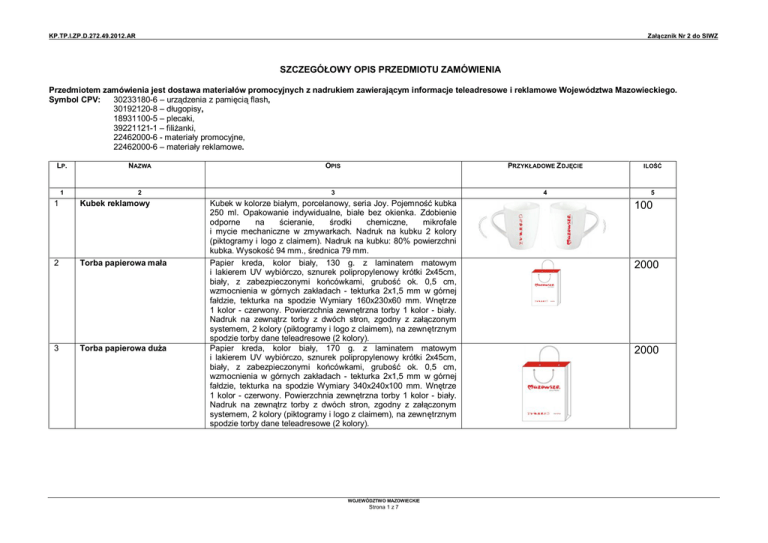 KP.TP.I.ZP.D.272.49.2012.AR Załącznik Nr 2 do SIWZ SZCZEGÓŁOWY OPIS PRZEDMIOTU ZAMÓWIENIA Przedmiotem zamówienia jest dostawa materiałów promocyjnych z nadrukiem zawierającym informacje teleadresowe i reklamowe Województwa Mazowieckiego. Symbol CPV: 30233180-6 – urządzenia z pamięcią flash, 30192120-8 – długopisy, 18931100-5 – plecaki, 39221121-1 – filiżanki, 22462000-6 - materiały promocyjne, 22462000-6 – materiały reklamowe. LP. 1 NAZWA 2 1 Kubek reklamowy 2 Torba papierowa mała 3 Torba papierowa duża OPIS PRZYKŁADOWE Z DJĘCIE ILOŚĆ 3 4 5 Kubek w kolorze białym, porcelanowy, seria Joy. Pojemność kubka 250 ml. Opakowanie indywidualne, białe bez okienka. Zdobienie odporne na ścieranie, środki chemiczne, mikrofale i mycie mechaniczne w zmywarkach. Nadruk na kubku 2 kolory (piktogramy i logo z claimem). Nadruk na kubku: 80% powierzchni kubka. Wysokość 94 mm., średnica 79 mm. Papier kreda, kolor biały, 130 g. z laminatem matowym i lakierem UV wybiórczo, sznurek polipropylenowy krótki 2x45cm, biały, z zabezpieczonymi końcówkami, grubość ok. 0,5 cm, wzmocnienia w górnych zakładach - tekturka 2x1,5 mm w górnej fałdzie, tekturka na spodzie Wymiary 160x230x60 mm. Wnętrze 1 kolor - czerwony. Powierzchnia zewnętrzna torby 1 kolor - biały. Nadruk na zewnątrz torby z dwóch stron, zgodny z załączonym systemem, 2 kolory (piktogramy i logo z claimem), na zewnętrznym spodzie torby dane teleadresowe (2 kolory). Papier kreda, kolor biały, 170 g. z laminatem matowym i lakierem UV wybiórczo, sznurek polipropylenowy krótki 2x45cm, biały, z zabezpieczonymi końcówkami, grubość ok. 0,5 cm, wzmocnienia w górnych zakładach - tekturka 2x1,5 mm w górnej fałdzie, tekturka na spodzie Wymiary 340x240x100 mm. Wnętrze 1 kolor - czerwony. Powierzchnia zewnętrzna torby 1 kolor - biały. Nadruk na zewnątrz torby z dwóch stron, zgodny z załączonym systemem, 2 kolory (piktogramy i logo z claimem), na zewnętrznym spodzie torby dane teleadresowe (2 kolory). WOJEWÓDZTWO MAZOWIECKIE Strona 1 z 7 100 2000 2000 KP.TP.I.ZP.D.272.49.2012.AR Załącznik Nr 2 do SIWZ 4 Filiżanka Filiżanka ze spodkiem. Kolor: biały. Porcelana. Rozmiar: 180 ml. Można myć w zmywarce. Opakowanie indywidualne, białe bez okienka. Zdobienie odporne na ścieranie, środki chemiczne, mikrofale i mycie mechaniczne w zmywarkach. Nadruk na filiżance 2 kolory (piktogramy i logo z claimem) Na spodku strona internetowa 2 kolory. Nadruk na filiżance: 80% powierzchni filiżanki. Wysokość 66 mm., średnica 89 mm., talerzyk 155 mm. 100 5 Długopis reklamowy Metalowy długopis z dużym, niebieskim wkładem. Wymiary: 14,4x0,7 cm. Kolor długopisu: czerwony. Grawer z jednej strony, zgodny z załączonym systemem. 1500 6 Piłka plażowa 6 panelowa piłka plażowa, materiał; PVC, długość panelu 280mm. Wymiary: śr. 180 mm. Rodzaj nadruku: T1/A. Maksymalna wielkość nadruku: 110×50mm mm. Waga jednej szt. : 0,03 kg. Nadruk 2 kolory (logo z claimem) na każdym białym panelu. 1000 7 Torba - lodówka Elegancka torba – lodówka, wyposażona w uchwyty, pasek na ramię oraz dodatkową kieszonkę zamykana na zamek. Wymiary: 52x29 cm. Kolor torby: biała. Nadruk 2 kolory (logo z claimem). 100 8 Pen Drive Pamięć zewnętrzna USB Windows Vista Home Basic/Home Premium/Business/Enterprise/Ultimate/Starter, Windows XP Professional/Home Edition, Windows 2000 Professional, Windows Me, Mac OS10.1~10.4.7, Linux z jądrem 2.4 i wyższe. Pojemność pamięci 32 GB, maksymalna prędkość odczytu - nie mniejsza niż 25 MB/s, maksymalna prędkość zapisu – nie mniejsza niż 15 MB/s, możliwość zawieszenia pamięci na smyczy załączonej do produktu. Obudowa plastikowo-metalowa. Hot plug and play. Gwarancja 1 rok. Urządzenie może również służyć jako odtwarzacz plików MP3 czy przeglądarka zdjęć. Kolor biały ze srebrną obudową. Znakowanie grawer. 200 WOJEWÓDZTWO MAZOWIECKIE Strona 2 z 7 KP.TP.I.ZP.D.272.49.2012.AR Załącznik Nr 2 do SIWZ 9 Torba pod siodełko rowerowe. Torba pod siodełko rowerowe. Specjalny design mieszczący więcej potrzebnych rzeczy niż tradycyjna torba podsiodłowa. Duży obustronny dostęp do komory głównej na lekką kurtkę, dętki, narzędzia itp. Wewnętrzne kieszenie z siatki pomogą zorganizować klucze, narzędzia i inne małe przedmioty. System do szybkiego mocowania, łatwego zakładania/zdejmowania oraz przekładania pomiędzy rowerami. System montażowy: z paskiem do wspornika siodła. Pojemność torby: 1.2 L. Materiał: 1200 Denier Polyester. Taśma odblaskowa. Rozmiar: L x W x H 24 x 11 x 12 cm. Waga: 200 g. Kolor torby na zewnątrz czarny lub szary (do uzgodnienia). Nadruk 2 kolory z trzech stron, zgodny z załączonym systemem. 100 10 Opaski frote na rękę Opaska z tkaniny frotte. Kolor biały. Materiał: 70% bawełny, 26% poliester, 4% elastan. Haft z dwóch stron, 2 kolory, zgodny z załączonym systemem. 500 11 Saszetka na biodro Praktyczna saszetka biodrowa do schowania i uporządkowania ważnych drobnych akcesoriów, takich jak aparat fotograficzny lub dokumenty podróżne. Odporna na ścieranie tkanina z teksturowanych nici poliestrowych o grubości 600 den, bardzo drobno i gęsto tkana. Od spodu tkanina powleczona jest trwałą, wodoodporną powłoką poliuretanową, ma trwały kolor i jest odporna na działanie promieniowania UV. Komora główna i 2 małe kieszonki boczne zamykane na zamek błyskawiczny, kieszeń przednia zapinana na rzep z zakładką poszerzającą i karabińczykiem na klucze. Kolor saszetki czarny lub szary. Wymiary: 1:12x36x10 cm. Pojemność 2,5 l. Waga: 150 g. Kieszonkowy pas biodrowy Nadruk z jednej strony – 2 kolory, zgodny z załączonym systemem. 100 WOJEWÓDZTWO MAZOWIECKIE Strona 3 z 7 KP.TP.I.ZP.D.272.49.2012.AR 12 Plecak turystyczny 50l. – 60l Załącznik Nr 2 do SIWZ Duży plecak turystyczny na kilkudniowe wycieczki 60L. Podzielonych na dwa przedziały. Górne zamknięcie wysoko regulowane. Syste