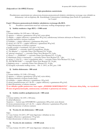 Nr sprawy AZP- 240/PN-p14/019/2014 Załącznik nr 1 do SIWZ/Umowy Opis przedmiotu zamówienia Przedmiotem zamówienia jest sukcesywna dostawa pomocniczych druków szkolnictwa wyższego oraz okładek na dokumenty i tub na dyplomy dla Katolickiego Uniwersytetu Lubelskiego Jana Pawła II z podziałem na 2 części Część 1 Dostawa pomocniczych druków szkolnictwa wyższego dla KUL I. Przedmiot zamówienia musi być wykonany według następującego opisu: 1) Indeks studenta z logo KUL – 5 000 sztuk Opis: 1) format indeksu A6 (105 mm x 148 mm); 2) oprawa — tektura o gramaturze 630 g/m2, szyta nićmi; 3) oklejka — papier offsetowy o gramaturze 80 g/m2, zadrukowany kolorem zielonym nr Pantone 355 U; 4) grzbiet introkal w kolorze czarnym; 5) wyklejka — papier offsetowy o gramaturze 80 g/m2; 6) strony od 1 do 93 — papier offsetowy o gramaturze 80 g/m2; 7) druk dwustronny w kolorze czarnym: a) godło uczelni o wymiarach 14,5 mm x 16,2 mm, b) „INDEKS” — czcionka Arial CE pogrubiony, 40 pkt, c) „Nr albumu” — czcionka Times New Roman CE, 10 pkt, d) „pieczęć urzędowa” — czcionka Times New Roman CE, 6 pkt, e) strona 1 — „INDEKS” — czcionka Times New Roman CE, 11,5 pkt, f) objaśnienia (tekst w nawiasach) — czcionka Times New Roman CE, 7 pkt, g) strony: 1, 4 do 93 — tekst i wypełnienie tabel — czcionka Times New Roman CE, 9 pkt, h) „ŚLUBOWANIE” — czcionka Times New Roman CE, 14 pkt, i) paginacja stron — czcionka Times New Roman CE, 10 pkt, 8) szczegóły wykonania według wzoru. - Dz. U. 2011, nr 201, poz. 1188 2) Indeks doktoranta - 500 sztuk Opis: 1) format indeksu A5 (148 x 210 mm); 2) oprawa — tektura o gramaturze 630 g/m2, szyta nićmi,; 3) okleina introkal w kolorze bordo/brąz; 4) wyklejka — papier offsetowy o gramaturze 120 g/m2; 5) strony ponumerowane od 1 do 60 — papier offsetowy o gramaturze 80 g/m2; 6) druk dwustronny w kolorze czarnym 7) na okładce godło państwowe oraz napis: „INDEKS DOKTORANTA” - tłoczone złotą folią, na wysokości 55 mm od górnej krawędzi, umieszczony centralnie w pionowej osi strony; 3) Indeks studiów podyplomowych – 500 sztuk Opis: 1) format indeksu A6 (105 x 148 mm); 2) układ albumowy 3)oprawa — karton typu EFENBENS o gramaturze 240 g/m2, szyta drutem 4) strony ponumerowane od 1 do 56 — papier offsetowy o gramaturze 80 g/m2; 5) druk dwustronny w kolorze czarnym 4) Teczka do akt doktoranta – 800 sztuk Opis: 1) 3 razy format A4 (210 x 297 mm) bigowane i składane na trzy 2) papier offsetowy o gramaturze 170 g/m2; 3) druk dwustronny w kolorze czarnym 5) Teczka do akt studenta – 10 000 sztuk Opis: 1) 3 razy format A4 (210 x 297 mm) bigowane i składane na trzy 2) papier offsetowy o gramaturze 170 g/m2; 3) druk dwustronny w kolorze czarnym Nr sprawy AZP- 240/PN-p14/019/2014 6) Zaświadczenie o ukończeniu studiów z wyróżnieniem– 900 sztuk Opis: 1) Format B5 (176 x 250 mm) 2) karton ELFENEBES w kolorze żółtym gramatura 240 g/m2, 3) druk jednostronny w kolorze brązowym 7) dyplom licencjatu kościelnego – 100 kompletów (oryginał +odpis+ egz. do akt) Opis: 1) Oryginał format A4 (210 x 297 mm); karton ELFENEBES w kolorze żółtym gramatura 240 g/m2 druk jednostronny w kolorze brązowym 2) Odpis i egzemplarz do akt: format A4 (210 x 297 mm) Papier BOND 80-100 g/m2 w kolorze żółtym, druk jednostronny w kolorze brązowym 8) dyplom licencjatu kanonicznego – 60 kompletów (oryginał +odpis+ egz. do akt) Opis: 1) Oryginał format A4 (210 x 297 mm); karton ELFENEBES w kolorze żółtym gramatura 240 g/m2 druk jednostronny w kolorze brązowym 2) Odpis i egzemplarz do akt: format A4 (210 x 297 mm) Papier BOND 80-100 g/m2 w kolorze żółtym, druk jednostronny w kolorze brązowym 9) Świadectwo ukończenia studiów doktoranckich – 300 sztuk 1) format świadectwa B5 (176 x 250 mm); 2) papier celulozowy offsetowy biały, o gramaturze 80 g/m2, pokryty giloszem według wzoru; gilosz stanowi siatka w kolorze jasnoróżowym — nr pantone 182 U, o wymiarach 148 x 210 mm, grubości linii 0,567 pkt, przesuniętych względem siebie o kat 5°; 3)druk jednostronny w kolorze czarnym 4) szczegóły wykonania według wzory - Dz. U. z 2009 r. nr 11 poz. 61 z poźn. zm. 10) świadectwo ukończenia kursu -wzór w opracowaniu przez UCSPiDZ) – 500 szt. Opis: 1) format B5 (176 x 250 mm) 2) papier kreda silk o gramaturze 120 g/m2; 3) druk dwustronny w kolorze czarnym 11) świadectwo ukończenia studiów podyplomowych– 500 sztuk Opis: 1) format A4 (210 x 297 mm) 2) papier kreda silk o gramaturze 120 g/m2; 3) pokryty giloszem; gilosz stanowi siatka w kolorze brązowym — nr pantone 480, o wymiarach 297 x 210 mm, grubość linii 0,567 pkt, przesuniętych względem siebie o kat 5 4) druk dwustronny w kolorze czarnym 12) Dziennik praktyk studenta – 2 300 sztuk Opis: 1) format A5 (148 x 210 mm); 2) oprawa szyta drutem — karton biały jednostronnie kredowany o gramaturze 250 g/m2 ; nadruk czarny 3) strony ponumerowane od 1 do 32 — papier offsetowy o gramaturze 80 g/m2; 4) druk dwustronny w kolorze czarnym 13) Dziennik wychowania fizycznego – 150 sztuk Nr sprawy AZP- 240/PN-p14/019/2014 Opis: 1) format A5 (148 x 210 mm); 2) oprawa szyta drutem — karton biały o gramaturze 250 g/m2, jednostronnie kredowany, nadruk czarny 3) strony ponumerowane od 1 do 32 — papier offsetowy o gramaturze 80 g/m2; 4) druk dwustronny w kolorze czarnym 5) Szczegóły wykonania według wzoru MEN –3/14.1 I-21 SW 14) Druki wpłat – 50000 szt Opis: 1) format A4 (210 x 297 mm) 2) papier offsetowy o gramaturze 80 g/m2; 3) nadruk jednostronny w kolorze magenta 15) Papier do suplementu pokryty giloszem – 60 000 sztuk Opis: 1) format A4 (210 x 297 mm); 2) papier offsetowy biały, gramatura 80 g/m2; 3) papier pokryty giloszem; gilosz stanowi siatka w kolorze brązowym — nr pantone 480, o wymiarach 297 x 210 mm, grubość linii 0,567 pkt, przesuniętych względem siebie o kat 5° 4) szczegóły wykonania według wzoru