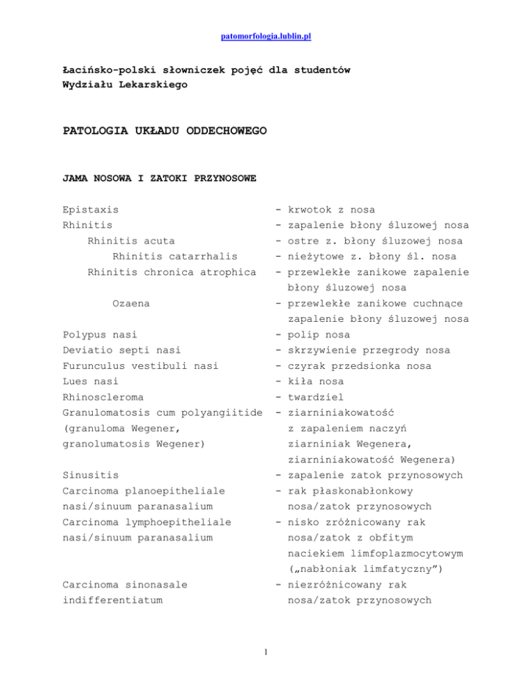 patomorfologia.lublin.pl Łacińsko-polski słowniczek pojęć dla studentów Wydziału Lekarskiego PATOLOGIA UKŁADU ODDECHOWEGO JAMA NOSOWA I ZATOKI PRZYNOSOWE Epistaxis Rhinitis Rhinitis acuta Rhinitis catarrhalis - krwotok z nosa zapalenie błony śluzowej nosa ostre z. błony śluzowej nosa nieżytowe z. błony śl. nosa - przewlekłe zanikowe zapalenie błony śluzowej nosa - przewlekłe zanikowe cuchnące zapalenie błony śluzowej nosa - polip nosa - skrzywienie przegrody nosa - czyrak przedsionka nosa - kiła nosa - twardziel - ziarniniakowatość z zapaleniem naczyń ziarniniak Wegenera, ziarniniakowatość Wegenera) - zapalenie zatok przynosowych - rak płaskonabłonkowy nosa/zatok przynosowych - nisko zróżnicowany rak nosa/zatok z obfitym naciekiem limfoplazmocytowym („nabłoniak limfatyczny”) - niezróżnicowany rak nosa/zatok przynosowych Rhinitis chronica atrophica Ozaena Polypus nasi Deviatio septi nasi Furunculus vestibuli nasi Lues nasi Rhinoscleroma Granulomatosis cum polyangiitide (granuloma Wegener, granolumatosis Wegener) Sinusitis Carcinoma planoepitheliale nasi/sinuum paranasalium Carcinoma lymphoepitheliale nasi/sinuum paranasalium Carcinoma sinonasale indifferentiatum 1 patomorfologia.lublin.pl GARDŁO - zapalenia gardła - zapalenie migdałków - ostre paciorkowcowe zapalenie migdałków podniebiennych i gardła Carcinoma nasopharyngeale - rak nosogardzieli Carcinoma nasopharyngeale - rak nosogardzieli akeratodes nierogowaciejący Carcinoma nasopharyngeale – nisko zróżnicowany rak lymphoepitheliale nosogardzieli z obfitym naciekiem limfoplazmocytowym („nabłoniak limfatyczny”) Carcinoma nasopharyngeale - rak n. płaskonabłonkowy planoepitheliale keratodes rogowaciejący Carcinoma planoepitheliale - rak płaskonabłonkowy gardła hypopharyngis dolnego Rhabdomyosarcoma embryonale - mięśniakomięsak pharyngis prążkowanokomórkowy zarodkowy gardła Pharyngitis Tonsillitis Angina KRTAŃ I TCHAWICA obrzęk krtani zapalenie krtani gruźlica krtani zapalenie krtani i tchawicy guzek krtaniowy (guzek śpiewaczy) - polip krtani - brodawczak krtani - brodawczakowatość krtani Oedema laryngis Laryngitis Tuberculosis laryngis Laryngotracheitis Nodulus laryngealis (nodulus cantorum) Polypus laryngealis Papilloma laryngis Papillomatosis laryngis - 2 patomorfologia.lublin.pl Keratosis planoepithelii laryngis – rogowacenia nabłonka („pachydermia”, leucoplakia l.) wielowarstwowego płaskiego („zeskórnienie”) krtani Carcinoma planoepitheliale l. - rak płaskonabłonkowy krtani Carcinoma verrucosum laryngis – rak brodawkowaty krtani Tracheitis - zapalenie tchawicy PŁUCA Agenesia pulmonis Embolia pulmonalis (embolia arteriarum pulmonalium) Embolia thrombotica a. p. Embolia sellaris Embolia adiposa Aeroembolia Infarctus haemorrhagicus pulmonis Hypertensio pulmonalis H. pulmonalis primaria H. pulmonalis secundaria Syndroma Goodpasture Haemosiderosis pulmonalis idiopathica Oedema pulmonum Induratio fusca pulmonum Atelectasis Atelectasis primaria (a. foetalis) Atelectasis secundaria A. e compressione (collapsus) A. e resorptione A. e contractione (a. e cicatrisatione) 3 - całkowity brak płuca - zator płucny (zator tętnic płucnych) – zator skrzeplinowy tętnic p. - zator jeździec - zator tłuszczowy - zator powietrzny - zawał krwotoczny płuca - nadciśnienie płucne - nadciśnienie płucne pierwotne - nadciśnienie płucne wtórne - zespół Goodpasture’a - idiopatyczna hemosyderoza płucna - obrzęk płuc - stwardnienie brunatne płuc - niedodma - niedodma pierwotna (płodowa) - niedodma wtórna - niedodma z ucisku - niedodma resorpcyjna - n. z obkurczenia (n. z bliznowacenia) patomorfologia.lublin.pl Syndroma membranarum hyalinicarum pulmonum Lipoproteinosis alveolaris pulmonum Microlithiasis alveolaris pulmonum Emphysema Emphysema vesiculare (emphysema alveolare) Emphysema primarium Emphysema senile Emphysema vicariens Emphysema centrilobulare Emphysema marginale Emphysema bullosum Emphysema panlobulare Emphysema interstitiale Emphysema mediastinale Asthma bronchiale Bronchiectases Bronchiectases sacciformes Bronchiectases cylindriformes Bronchiectases fusiformes Mucoviscidosis pulmonum Laryngotracheobronchitis Bronchitis Bronchitis acuta Bronchitis muco-purulenta Bronchitis chronica B. chronica hypertrophica B. chronica atrophica Peribronchitis fibrosa 4 - zespół ciężkiej niedomogi oddechowej noworodków (zespół błon szklistych) - lipoproteinoza pęcherzyków płucnych - mikrokamica pęcherzykowa płuc - rozedma - rozedma pęcherzykowa – – - rozedma pierwotna rozedma starcza rozedma zastępcza rozedma centralna rozedma brzeżna rozedma pęcherzowa rozedma zrazikowa rozedma śródmiąższowa rozedma śródpiersia dychawica oskrzelowa rozstrzenia oskrzeli rozstrzenia workowate rozstrzenia walcowate rozstrzenie wrzecionowate mukowiscydoza płuc zapalenie krtani, tchawicy i oskrzeli zapalenie oskrzeli ostre zapalenie oskrzeli śluzowo-ropne z. oskrzeli przewlekłe zapalenie oskrzeli przewlekłe przerostowe z. o. przewlekłe zanikowe z. o. przewlekłe zapalenie otoczenia oskrzeli z włóknieniem patomorfologia.lublin.pl Bronchiolitis fibrosa obliterans - zapalenie oskrzelików z włóknieniem i zwężeniem światła - krztusiec - błonica - ropień płuca - ropnie przerzutowe płuc Pertussis Diphteria Abscessus pulmonis Abscessus metastatici pulmonum Abscessus synpneumonicus - ropień w przebiegu zapalenia płuc Abscessus metapneumonicus - ropień w miejscu zapalenia płuc po jego ustąpieniu Fistula broncho-pulmonalis - przetoka płucno-oskrzelowa Gangraena pulmonis - zgorzel płuca Pneumonia - zapalenie płuc Pneumonia intraalveolaris - zapalenie płuc (pneumonia alveolaris) (śród)pęcherzykowe Pneumonia pneumococcica - zapalenie płuc pneumokokowe Pneumonia staphylococcica – zapalenie płuc gronkowcowe Pneumonia streptococcica - zapalenie płuc paciorkowcowe Pneumonia nosocomialis - z. płuc wewnątrzszpitalne Pneumonia loba