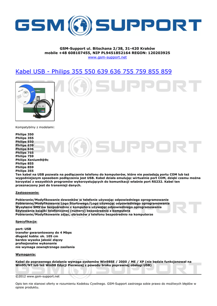 GSM-Support ul. Bitschana 2/38, 31-420 Kraków mobile +48 608107455, NIP PL9451852164 REGON: 120203925 www.gsm-support.net Kabel USB - Philips 355 550 639 636 755 759 855 859 Kompatybilny z modelami: Philips 350 Philips 355 Philips 550 Philips 639 Philips 636 Philips 755 Philips 759 Philips Xenium9@9c Philips 855 Philips 859 Philips 355 Ten kabel na USB pozwala na podłączenie telefonu do komputerów, które nie posiadają portu COM lub też wygodniejszym sposobem podłączenia jest USB. Kabel działa emulując wirtualnie port COM, dzięki czemu można korzystać z wszystkich programów wykorzystujących do komunikacji właśnie port RS232. Kabel ten przeznaczony jest do transmisji danych. Zastosowanie: Pobieranie/Modyfikowanie dzwonków w telefonie używając odpowiedniego oprogramowanie Pobieranie/Modyfikowanie Logo Startowego/Logo używając odpowiedniego oprogramowania Wysyłanie SMS'ów bezpośrednio z komputera używając odpowiedniego oprogramowania Edytowanie książki telefonicznej (numery) bezpośrednio z komputera Pobieranie/Modyfikowanie zdjęc, obrazków z telefonu bezpośrednio na komputerze Specyfikacja: port: USB transfer gwarantowany do 4 Mbps długość kabla: ok. 105 cm bardzo wysoka jakość złączy profesjonalne wykonanie nie wymaga zewnętrznego zasilania Wymagania: Kabel do poprawnego działania wymaga systemów Win98SE / 2000 / ME / XP (nie będzie funkcjonował na Win95/NT lub też Win98 Edycji Pierwszej z powodu braku poprawnej obsługi USB) ©2012 www.gsm-support.net Opis ten nie stanowi oferty w rozumieniu Kodeksu Cywilnego. GSM-Support zastrzega sobie prawo do możliwych błędów w opisie produktu. Prosimy o weryfikację z Państwa strony, a w razie wątpliwości o kontakt. GSM-Support ul. Bitschana 2/38 31-420 Kraków POLSKA tel. 608107455 e-mail: [email protected] Powered by TCPDF (www.tcpdf.org)