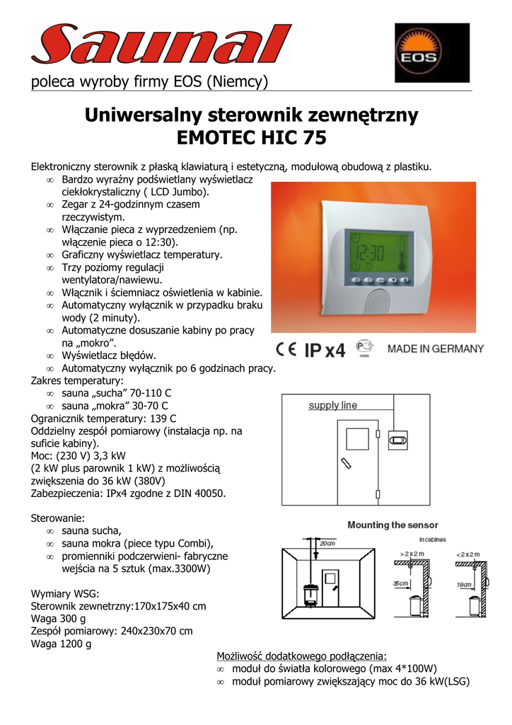 poleca wyroby firmy EOS (Niemcy) Uniwersalny sterownik zewnętrzny EMOTEC HIC 75 Elektroniczny sterownik z płaską klawiaturą i estetyczną, modułową obudową z plastiku. • Bardzo wyraźny podświetlany wyświetlacz ciekłokrystaliczny ( LCD Jumbo). • Zegar z 24-godzinnym czasem rzeczywistym. • Włączanie pieca z wyprzedzeniem (np. włączenie pieca o 12:30). • Graficzny wyświetlacz temperatury. • Trzy poziomy regulacji wentylatora/nawiewu. • Włącznik i ściemniacz oświetlenia w kabinie. • Automatyczny wyłącznik w przypadku braku wody (2 minuty). • Automatyczne dosuszanie kabiny po pracy na „mokro”. • Wyświetlacz błędów. • Automatyczny wyłącznik po 6 godzinach pracy. Zakres temperatury: • sauna „sucha” 70-110 C • sauna „mokra” 30-70 C Ogranicznik temperatury: 139 C Oddzielny zespół pomiarowy (instalacja np. na suficie kabiny). Moc: (230 V) 3,3 kW (2 kW plus parownik 1 kW) z możliwością zwiększenia do 36 kW (380V) Zabezpieczenia: IPx4 zgodne z DIN 40050. Sterowanie: • sauna sucha, • sauna mokra (piece typu Combi), • promienniki podczerwieni- fabryczne wejścia na 5 sztuk (max.3300W) Wymiary WSG: Sterownik zewnetrzny:170x175x40 cm Waga 300 g Zespół pomiarowy: 240x230x70 cm Waga 1200 g Możliwość dodatkowego podłączenia: • moduł do światła kolorowego (max 4*100W) • moduł pomiarowy zwiększający moc do 36 kW(LSG) poleca wyroby firmy EOS (Niemcy) Schemat podłączeniowy sterownika EMOTEC HIC 75