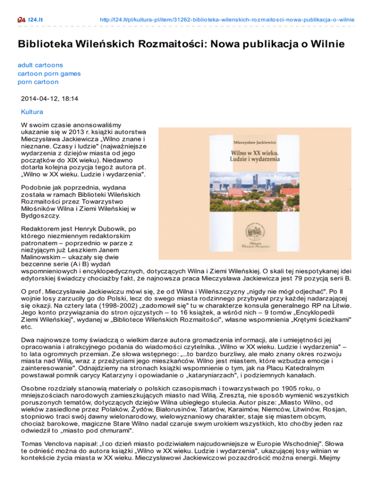l24.lt http://l24.lt/pl/kultura-pl/item/31262-biblio teka-wilenskich-ro zmaito sci-no wa-publikacja-o -wilnie Biblioteka Wileńskich Rozmaitości: Nowa publikacja o Wilnie adult cartoons cartoon porn games porn cartoon 2014-04-12, 18:14 Kultura W swoim czasie anonsowaliśmy ukazanie się w 2013 r. książki autorstwa Mieczysława Jackiewicza „Wilno znane i nieznane. Czasy i ludzie" (najważniejsze wydarzenia z dziejów miasta od jego początków do XIX wieku). Niedawno dotarła kolejna pozycja tegoż autora pt. „Wilno w XX wieku. Ludzie i wydarzenia". Podobnie jak poprzednia, wydana została w ramach Biblioteki Wileńskich Rozmaitości przez Towarzystwo Miłośników Wilna i Z iemi Wileńskiej w Bydgoszczy. Redaktorem jest Henryk Dubowik, po którego niezmiennym redaktorskim patronatem – poprzednio w parze z nieżyjącym już Leszkiem Janem Malinowskim – ukazały się dwie bezcenne serie (A i B) wydań wspomnieniowych i encyklopedycznych, dotyczących Wilna i Z iemi Wileńskiej. O skali tej niespotykanej idei edytorskiej świadczy chociażby f akt, że najnowsza praca Mieczysława Jackiewicza jest 79 pozycją serii B. O prof . Mieczysławie Jackiewiczu mówi się, że od Wilna i Wileńszczyzny „nigdy nie mógł odjechać". Po II wojnie losy zarzuciły go do Polski, lecz do swego miasta rodzinnego przybywał przy każdej nadarzającej się okazji. Na cztery lata (1998-2002) „zadomowił się" tu w charakterze konsula generalnego RP na Litwie. Jego konto przywiązania do stron ojczystych – to 16 książek, a wśród nich – 9 tomów „Encyklopedii Z iemi Wileńskiej", wydanej w „Bibliotece Wileńskich Rozmaitości", własne wspomnienia „Krętymi ścieżkami" etc. Dwa najnowsze tomy świadczą o wielkim darze autora gromadzenia inf ormacji, ale i umiejętności jej opracowania i atrakcyjnego podania do wiadomości czytelnika. „Wilno w XX wieku. Ludzie i wydarzenia" – to lata ogromnych przemian. Z e słowa wstępnego: „...to bardzo burzliwy, ale mało znany okres rozwoju miasta nad Wilią, wraz z przeżyciami jego mieszkańców. Wilno jest miastem, które wzbudza emocje i zainteresowanie". Odnajdziemy na stronach książki wspomnienie o tym, jak na Placu Katedralnym powstawał pomnik carycy Katarzyny i opowiadanie o „kataryniarzach", i podziemnych kanałach. Osobne rozdziały stanowią materiały o polskich czasopismach i towarzystwach po 1905 roku, o mniejszościach narodowych zamieszkujących miasto nad Wilią. Z resztą, nie sposób wymienić wszystkich poruszonych tematów, dotyczących dziejów Wilna ubiegłego stulecia. Autor pisze: „Miasto Wilno, od wieków zasiedlone przez Polaków, Ż ydów, Białorusinów, Tatarów, Karaimów, Niemców, Litwinów, Rosjan, stopniowo traci swój dawny wielonarodowy, wielowyznaniowy charakter, staje się miastem obcym, chociaż barokowe, magiczne Stare Wilno nadal czaruje swym urokiem wszystkich, kto choćby jeden raz odwiedził to „miasto pod chmurami". Tomas Venclova napisał: „I co dzień miasto podziwiałem najcudowniejsze w Europie Wschodniej". Słowa te odnieść można do autora książki „Wilno w XX wieku. Ludzie i wydarzenia", ukazującej losy wilnian w kontekście życia miasta w XX wieku. Mieczysławowi Jackiewiczowi pozazdrościć można energii. Miejmy nadzieję, że powstanie jeszcze niejedna książka, na której, podobnie jak dziś anonsowanej, znajdzie się dedykacja: „ Wnukom, by pamiętali o Wilnie". Halina Jotkiałło „Rota"