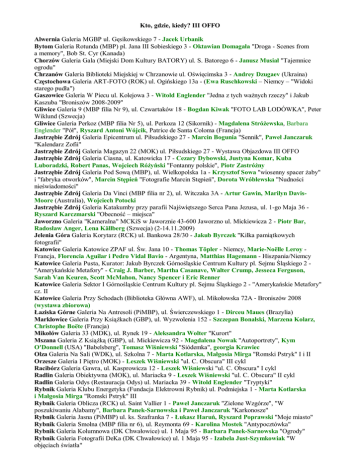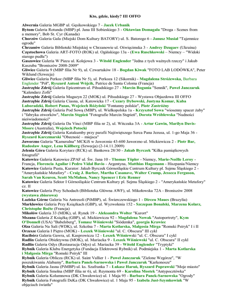 Kto, gdzie, kiedy? III OFFO Alwernia Galeria MGBP ul. Gęsikowskiego 7 - Jacek Urbanik Bytom Galeria Rotunda (MBP) pl. Jana III Sobieskiego 3 - Oktawian Domagała "Droga - Scenes from a memory", Bob St. Cyr (Kanada) Chorzów Galeria Gala (Miejski Dom Kultury BATORY) ul. S. Batorego 6 - Janusz Musiał "Tajemnice ogrodu" Chrzanów Galeria Biblioteki Miejskiej w Chrzanowie ul. Oświęcimska 3 - Andrey Dzugaev (Ukraina) Częstochowa Galeria ART-FOTO (ROK) ul. Ogińskiego 13a - (Ewa Ruschkowski – Niemcy – "Widoki starego pudła") Gaszowice Galeria W Piecu ul. Kolejowa 3 - Witold Englender "Jedna z tych ważnych rzeczy" i Jakub Kaszuba "Broniszów 2008-2009" Gliwice Galeria 9 (MBP filia Nr 9), ul. Czwartaków 18 - Bogdan Kiwak "FOTO LAB LODÓWKA", Peter Wiklund (Szwecja) Gliwice Galeria Perkoz (MBP filia Nr 5), ul. Perkoza 12 (Sikornik) - Magdalena Stróżewska, Barbara Englender "Pół", Ryszard Antoni Wójcik, Patrice de Santa Coloma (Francja) Jastrzębie Zdrój Galeria Epicentrum ul. Piłsudskiego 27 - Marcin Bogunia "Sennik", Paweł Janczaruk "Kalendarz Zofii" Jastrzębie Zdrój Galeria Magazyn 22 (MOK) ul. Piłsudskiego 27 - Wystawa Objazdowa III OFFO Jastrzębie Zdrój Galeria Ciasna, ul. Katowicka 17 - Cezary Dybowski, Justyna Komar, Kuba Luboradzki, Robert Panas, Wojciech Różyński "Fontanny polskie", Piotr Zastróżny Jastrzębie Zdrój Galeria Pod Sową (MBP), ul. Wielkopolska 1a - Krzysztof Sowa "wiosenny spacer żaby" i "fabryka otworków", Marcin Stępień "Fotografie Marcin Stępień", Dorota Wróblewska "Nudności nieświadomości" Jastrzębie Zdrój Galeria Da Vinci (MBP filia nr 2), ul. Witczaka 3A - Artur Gawin, Marilyn DavisMoore (Australia), Wojciech Potocki Jastrzębie Zdrój Galeria Katakumby przy parafii Najświętszego Serca Pana Jezusa, ul. 1-go Maja 36 Ryszard Karczmarski "Obecność – miejsca" Jaworzno Galeria "Kameralna" MCKiS w Jaworznie 43-600 Jaworzno ul. Mickiewicza 2 - Piotr Bar, Radosław Anger, Lena Källberg (Szwecja) (2-14.11.2009) Jelenia Góra Galeria Korytarz (RCK) ul. Bankowa 28/30 - Jakub Byrczek "Kilka pamiątkowych fotografii" Katowice Galeria Katowice ZPAF ul. Św. Jana 10 - Thomas Töpler - Niemcy, Marie-Noëlle Leroy Francja, Florencia Aguilar i Pedro Vidal Bavio - Argentyna, Matthias Hagemann - Hiszpania/Niemcy Katowice Galeria Pusta, Kurator: Jakub Byrczek Górnośląskie Centrum Kultury pl. Sejmu Śląskiego 2 "Amerykańskie Metafory" - Craig J. Barber, Martha Casanave, Walter Crump, Jesseca Ferguson, Sarah Van Keuren, Scott McMahon, Nancy Spencer i Eric Renner Katowice Galeria Sektor I Górnośląskie Centrum Kultury pl. Sejmu Śląskiego 2 - "Amerykańskie Metafory" cz. II Katowice Galeria Przy Schodach (Biblioteka Główna AWF), ul. Mikołowska 72A - Broniszów 2008 (wystawa zbiorowa) Łaziska Górne Galeria Na Antresoli (PiMBP), ul. Świerczewskiego 1 - Dirceu Maues (Brazylia) Marklowice Galeria Przy Książkach (GBP), ul. Wyzwolenia 152 - Szczepan Bonalski, Marzena Kolarz, Christophe Boëte (Francja) Mikołów Galeria 33 (MDK), ul. Rynek 19 - Aleksandra Wolter "Kurort" Mszana Galeria Z Książką (GBP), ul. Mickiewicza 92 - Magdalena Nowak "Autoportrety", Kym O'Donnell (USA) "Babelsberg", Tomasz Wiśniewski "Siódemka", georgia Krawiec Olza Galeria Na Sali (WDK), ul. Szkolna 7 - Marta Kotlarska, Małgosia Mirga "Romski Pstryk" I i II Orzesze Galeria I Piętro (MOK) - Leszek Wiśniewski "ul. C. Obscura" III cykl Racibórz Galeria Gawra, ul. Kasprowicza 12 - Leszek Wiśniewski "ul. C. Obscura" I cykl Radlin Galeria Obiektywna (MOK), ul. Mariacka 9 - Leszek Wiśniewski "ul. C. Obscura" II cykl Radlin Galeria Odys (Restauracja Odys) ul. Mariacka 39 - Witold Englender "Tryptyki" Rybnik Galeria Klubu Energetyka (Fundacja Elektrowni Rybnik) ul. Podmiejska 1 - Marta Kotlarska i Małgosia Mirga "Romski Pstryk" III Rybnik Galeria Oblicza (RCK) ul. Saint Vallier 1 - Paweł Janczaruk "Zielone Wzgórze", "W poszukiwaniu Alabamy", Barbara Panek-Sarnowska i Paweł Janczaruk "Karkonosze" Rybnik Galeria Jasna (PiMBP) ul. ks. Szafranka 7 - Łukasz Haruń, Ryszard Poprawski "Moje miasto" Rybnik Galeria Smolna (MBP filia nr 6), ul. Reymonta 69 - Karolina Mostek "Antypocztówka" Rybnik Galeria Kolumnowa (DK Chwałowice) ul. 1 Maja 95 - Barbara Panek-Sarnowska "Ogrody" Rybnik Galeria Fotografii DeKa (DK Chwałowice) ul. 1 Maja 95 - Izabela Just-Szymkowiak "W objęciach światła" Rybnik Galeria Drugiego Planu (DK Chwałowice) ul. 1 Maja 95 - Anna Wydrych, "Blowup" (Artur Arturrovic Hilbrecht, Daniel KWADI Hilbrecht, Katarzyna Piechowiak), Ilja Tishchenko (Rosja), Tomasz Sobieraj "Ulica krokoldyli" Rybnik TeleGaleria (Telepizza) ul. Pocztowa 1 - Michał Gozdek "Portrety", Barbara Englender "Cykl czwarty" Rybnik Galeria DK Niedobczyce ul. Barbary 23 - Marcin Jedynak Rydułtowy Galeria Za Drzwiami (MBP), ul. Mickiewicza 33 - Rafał Pudło, Gregg Kemp (USA) solarigrafia, Katarzyna Harasimczuk "Nostalgia", Josep Maria Linares Cot. (Hiszpania) Sosnowiec Pub&Galernia Patelnia 36 ul. Warszawska 3 - Witold Englender "Zemska Brana", Kuba Szkudlarek, Grzegorz Sawa-Borysławski Suszec Galeria fotograficzna OKO ul. Ogrodowa 22 - Wystawa zbiorowa autorów OFFO Tarnowskie Góry Galeria Antresola (MBP) ul. Zamkowa 5a/b - Ryszard Poprawski "Spacer po plaży" Trzebinia Galeria FotoKLUBU Trzebińska Kinematografia (PMDK) ul. Kościuszki 72 - Piotr Zabłocki "trzecie molo", Michał Suski "Paryż", ASCAF Włochy (Cesare Bossi, Beppe De Leo, Luciana Majoni, Paolo Monina, Patrizio Pampaloni) Wodzisław Śląski Galeria NCE (Niepubliczne Centrum Edukacyjne) ul. 1 Maja 23B - Marek Lalko, Maciej Rawluk "Ciała astralne", Claude Cogny (Francja), Mark Tweedie (Anglia) "Dream of Flight", Aleksej Demidow (Ukraina) Wodzisław Śląski Galeria Pod Fikusem (MiPBP), ul. Daszyńskiego 2 - Małgorzata Panek i Tomasz Walów "N: 51° 47' 11 E: 15° 29' 14"", Adam Gołemberski "Moje miasto", Adam Fleks, Oleg Tarasov (Rosja) Zawiercie Galeria Perspektywy (MOK "Centrum" im. Adama Mickiewicza) 