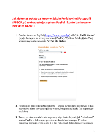Jak dokonać opłaty za kursy w Szkole Perfekcyjnej Fotografii (PPSOP.pl) wykorzystując system PayPal i konto bankowe w POLSKIM BANKU 1. Otwórz konto na PayPal (https://www.paypal.pl). OPCJA: „Załóż Konto” (opcja dostępna ze strony domowej PayPal). Wybierz Polskę (jako Twój kraj lub region) oraz opcję PayPal dla Ciebie. 2. Rozpocznij proces rejestracji konta -‐ Wpisz swoje dane osobowe: e-‐mail nazwisko, adres i co szczególnie ważne, bezpieczne hasło (co najmniej 8 znaków). 3. Teraz, po utworzeniu konta zapoznaj się z instrukcjami, jak "naładować" konto PayPal – dokonując przelewu z konta bankowego. Przelew bankowy zajmuje średnio ok. 2-‐3 dni roboczych (standardowe operacje 1 bankowe). Powinieneś uzyskać potwierdzenie o sfinalizowaniu przelewu przez email, który podałeś podczas rejestracji konta PayPal. Opcjonalnie zamiast przelewu z konta bankowego możesz też wykorzystywać wszystkie ważniejsze karty płatnicze (Visa, Master Card, czy American Express). 4. Na stronie internetowej PPSOP.pl wybierz teraz kurs, który cię interesuje i wybierz płatność PayPal – zostaniesz przekierowany do systemu PayPal, aby sfinalizować płatność. Zastrzeżenie: Niniejszy dokument jest wyłącznie do ogólnych celów informacyjnych. Prosimy wiec o dokładne zapoznanie się ze wszystkimi instrukcjami, zasadami bezpiecznego korzystania z serwisu, oraz uaktualnieniami na stronie internetowej PayPal (https://www.paypal.pl). Szkoła Perfekcyjnej Fotografii nie ma żadnego związku z serwisem PayPal dlatego nie możemy ponosić odpowiedzialności ze dokładność powyższych informacji. Usługodawca / sprzedawca: Szkoła Perfekcyjnej Fotografii -‐ The Perfect Picture School of Photography. Nazwa firmy: Aperture Productions LLC, USA. 2
