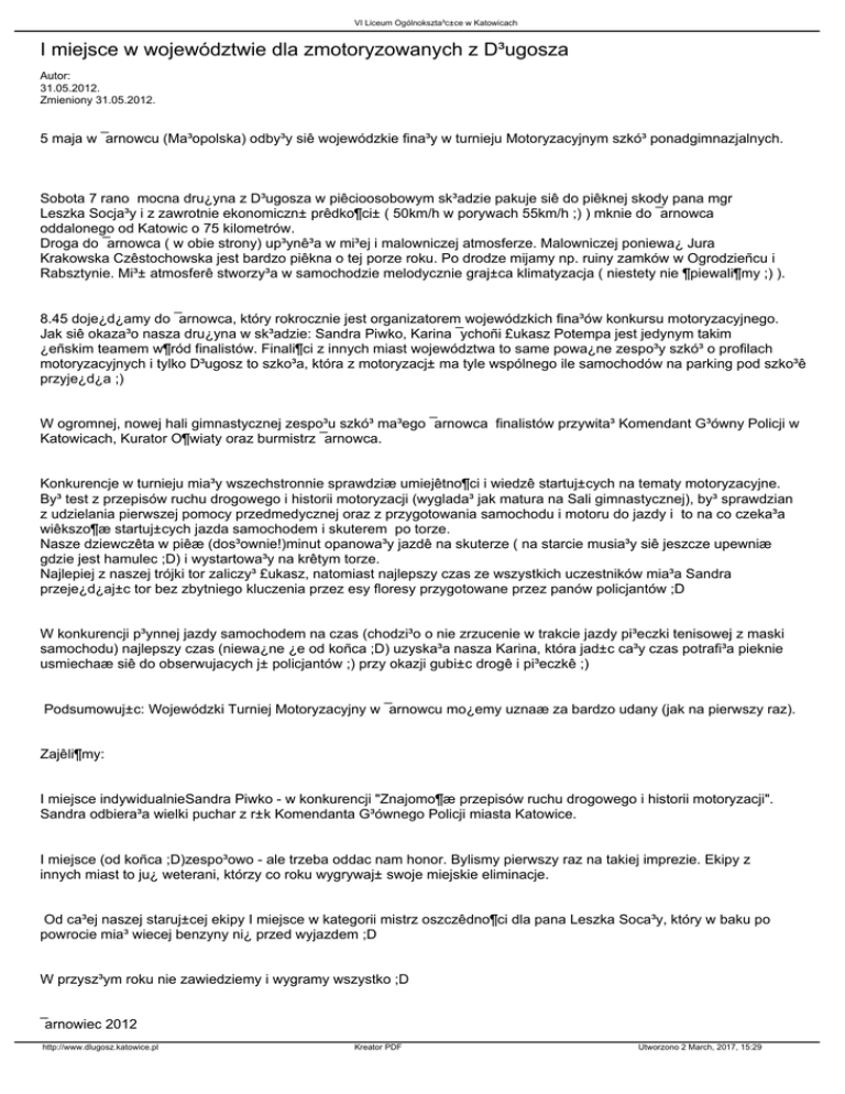 VI Liceum Ogólnokszta³c±ce w Katowicach I miejsce w województwie dla zmotoryzowanych z D³ugosza Autor: 31.05.2012. Zmieniony 31.05.2012. 5 maja w ¯arnowcu (Ma³opolska) odby³y siê wojewódzkie fina³y w turnieju Motoryzacyjnym szkó³ ponadgimnazjalnych. Sobota 7 rano mocna dru¿yna z D³ugosza w piêcioosobowym sk³adzie pakuje siê do piêknej skody pana mgr Leszka Socja³y i z zawrotnie ekonomiczn± prêdko¶ci± ( 50km/h w porywach 55km/h ;) ) mknie do ¯arnowca oddalonego od Katowic o 75 kilometrów. Droga do ¯arnowca ( w obie strony) up³ynê³a w mi³ej i malowniczej atmosferze. Malowniczej poniewa¿ Jura Krakowska Czêstochowska jest bardzo piêkna o tej porze roku. Po drodze mijamy np. ruiny zamków w Ogrodzieñcu i Rabsztynie. Mi³± atmosferê stworzy³a w samochodzie melodycznie graj±ca klimatyzacja ( niestety nie ¶piewali¶my ;) ). 8.45 doje¿d¿amy do ¯arnowca, który rokrocznie jest organizatorem wojewódzkich fina³ów konkursu motoryzacyjnego. Jak siê okaza³o nasza dru¿yna w sk³adzie: Sandra Piwko, Karina ¯ychoñi £ukasz Potempa jest jedynym takim ¿eñskim teamem w¶ród finalistów. Finali¶ci z innych miast województwa to same powa¿ne zespo³y szkó³ o profilach motoryzacyjnych i tylko D³ugosz to szko³a, która z motoryzacj± ma tyle wspólnego ile samochodów na parking pod szko³ê przyje¿d¿a ;) W ogromnej, nowej hali gimnastycznej zespo³u szkó³ ma³ego ¯arnowca finalistów przywita³ Komendant G³ówny Policji w Katowicach, Kurator O¶wiaty oraz burmistrz ¯arnowca. Konkurencje w turnieju mia³y wszechstronnie sprawdziæ umiejêtno¶ci i wiedzê startuj±cych na tematy motoryzacyjne. By³ test z przepisów ruchu drogowego i historii motoryzacji (wyglada³ jak matura na Sali gimnastycznej), by³ sprawdzian z udzielania pierwszej pomocy przedmedycznej oraz z przygotowania samochodu i motoru do jazdy i to na co czeka³a wiêkszo¶æ startuj±cych jazda samochodem i skuterem po torze. Nasze dziewczêta w piêæ (dos³ownie!)minut opanowa³y jazdê na skuterze ( na starcie musia³y siê jeszcze upewniæ gdzie jest hamulec ;D) i wystartowa³y na krêtym torze. Najlepiej z naszej trójki tor zaliczy³ £ukasz, natomiast najlepszy czas ze wszystkich uczestników mia³a Sandra przeje¿d¿aj±c tor bez zbytniego kluczenia przez esy floresy przygotowane przez panów policjantów ;D W konkurencji p³ynnej jazdy samochodem na czas (chodzi³o o nie zrzucenie w trakcie jazdy pi³eczki tenisowej z maski samochodu) najlepszy czas (niewa¿ne ¿e od koñca ;D) uzyska³a nasza Karina, która jad±c ca³y czas potrafi³a pieknie usmiechaæ siê do obserwujacych j± policjantów ;) przy okazji gubi±c drogê i pi³eczkê ;) Podsumowuj±c: Wojewódzki Turniej Motoryzacyjny w ¯arnowcu mo¿emy uznaæ za bardzo udany (jak na pierwszy raz). Zajêli¶my: I miejsce indywidualnieSandra Piwko - w konkurencji "Znajomo¶æ przepisów ruchu drogowego i historii motoryzacji". Sandra odbiera³a wielki puchar z r±k Komendanta G³ównego Policji miasta Katowice. I miejsce (od koñca ;D)zespo³owo - ale trzeba oddac nam honor. Bylismy pierwszy raz na takiej imprezie. Ekipy z innych miast to ju¿ weterani, którzy co roku wygrywaj± swoje miejskie eliminacje. Od ca³ej naszej staruj±cej ekipy I miejsce w kategorii mistrz oszczêdno¶ci dla pana Leszka Soca³y, który w baku po powrocie mia³ wiecej benzyny ni¿ przed wyjazdem ;D W przysz³ym roku nie zawiedziemy i wygramy wszystko ;D ¯arnowiec 2012 http://www.dlugosz.katowice.pl Kreator PDF Utworzono 2 March, 2017, 15:29 VI Liceum Ogólnokszta³c±ce w Katowicach http://www.dlugosz.katowice.pl Kreator PDF Utworzono 2 March, 2017, 15:29