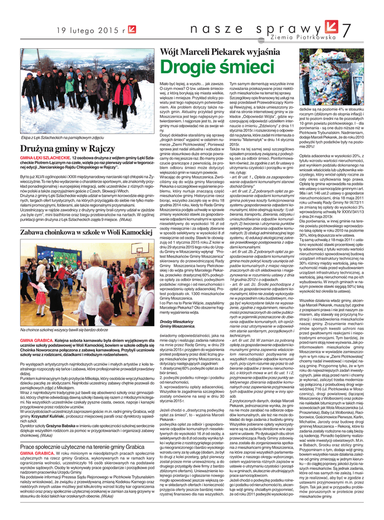 19 lutego 2015 r nasze sprawy Ziemia Piotrkowska 7 Wójt Marceli Piekarek wyjaśnia Drogie śmieci Ekipa z Łęk Szlacheckich na pamiątkowym zdjęciu Drużyna gminy w Rajczy GMINA ŁĘKI SZLACHECKIE. 12 osobowa drużyna z wójtem gminy Łęki Szlacheckie Piotrem Łącznym na czele, wzięła po raz pierwszy udział w tegorocznej edycji „Narciarskiego Rajdu Chłopskiego w Rajczy”. Był to już XLVII ogólnopolski i XXIII międzynarodowy narciarski rajd chłopski na Żywiecczyźnie.To nie tylko wydarzenie o charakterze sportowym, ale znakomity przykład ponadregionalnej i europejskiej integracji, setki uczestników z różnych regionów polski a także zaprzyjaźnieni goście z Czech, Słowacji i Włoch. Drużyna z gminy Łęki Szlacheckie wzięła udział w barwnym korowodzie ekip gminnych, targach ofert turystycznych, na których przyciągała do siebie nie tylko materiałami promocyjnymi, folderami, ale także regionalnymi przysmakami. Uczestniczący w rajdzie zawodnicy z drużyny gminy brali czynny udział w zjeździe „na byle cym”, mini biathlonie oraz biegu przebierańców na nartach. W ogólnej punktacji gmin drużyna z Łęk Szlacheckich zajęła 9 miejsce. (Wuka). Zabawa choinkowa w szkole w Woli Kamockiej Na choince szkolnej wszyscy bawili się bardzo dobrze GMINA GRABICA. Kolejna sobota karnawału była dniem wyjątkowym dla uczniów szkoły podstawowej w Woli Kamockiej, bowiem w szkole odbyła się Choinka Noworoczna połączona z zabawą karnawałową. Przybyli uczniowie szkoły wraz z rodzicami, dziadkami i młodszym rodzeństwem. Po występach artystycznych najmłodszych uczniów i małych artystów z koła teatralnego rozpoczęły się tańce i zabawa, które profesjonalnie prowadził prawdziwy didżej. Punktem kulminacyjnym było przybycie Mikołaja, który osobiście wręczył każdemu dziecku paczkę ze słodyczami. Najmłodsi uczestnicy zabawy chętnie pozowali do pamiątkowych zdjęć z Mikołajem. Wraz z najmłodszymi tradycyjnie już bawili się absolwenci szkoły oraz gimnazjaliści, którzy chętnie odwiedzają dawną szkołę i bawią się razem z młodszymi kolegami. Na wszystkich uczestników czekały pyszne ciasta, owoce, napoje i kanapki przygotowane przez rodziców uczniów. W uroczystościach uczestniczyli zaproszeni goście:m.in.radni gminy Grabica, wójt gminy Krzysztof Kuliński, proboszcz miejscowej parafii oraz dyrektorzy sąsiednich szkół. Dyrektor szkoły Grażyna Babska w imieniu całe społeczności szkolnej serdecznie dziękuje wszystkim rodzicom za pomoc w przygotowaniach i organizacji zabawy choinkowej.(Wuka) Prace społecznie użyteczne na terenie gminy Grabica GMINA GRABICA. W roku minionym w nieodpłatnych pracach społecznie użytecznych na rzecz gminy Grabica, wykonywanych na w ramach kary ograniczenia wolności, uczestniczyło 16 osób skierowanych na podstawie wyroków sądowych. Osoby te wykonywały prace gospodarcze i porządkowe pod nadzorem pracownika Urzędu Gminy. Na podstawie informacji Prezesa Sądu Rejonowego w Piotrkowie Trybunalskim należy wnioskować, że związku z przewidywaną zmianą Kodeksu Karnego oraz niektórych innych ustaw możliwy jest kilkukrotny wzrost liczby kar ograniczenia wolności oraz pracy społecznie użytecznej orzekanej w zamian za karę grzywny w stosunku do ilości takich kar orzekanych obecnie. (Wuka) Miało być lepiej, a wyszło… jak zawsze. O czym mowa? O tzw. ustawie śmieciowej, z którą borykają się miasta wielkie, większe i mniejsze. Przykład stolicy powiatu jest tego najlepszym potwierdzeniem. Ale problem dotyczy także naszych gmin. Aktualny przykład gminy Moszczenica jest tego najlepszym potwierdzeniem. I najgorsze jest to, że wójt gminy musi odpowiadać nie za swoje winy. Dosyć dokładnie staraliśmy się sprawę „drogich śmieci” wyjaśnić w ostatnim numerze „Ziemi Piotrkowskiej”. Ponieważ sprawa jest nadal aktualna i wzbudza w gminie stosunkowo duże emocje powracamy do niej jeszcze raz. Bo mamy przeczucie graniczące z pewnością, że problem odbioru śmieci może dotyczyć większości gmin w naszym powiecie. Wracając do gminy Moszczenica. Zwróciliśmy się do wójta gminy Marcelego Piekarka o szczegółowe wyjaśnienie problemu, który nurtuje znaczącą część mieszkańców gminy. Historycznie rzecz biorąc, wszystko zaczęło się w dniu 18 grudnia 2014 roku, kiedy to Rada Gminy Moszczenica podjęła uchwałę w sprawie zmiany wysokości stawki za gospodarowanie odpadami komunalnymi w sposób nieselektywny do wysokości 16 zł od osoby miesięcznie i za odpady zbierane w sposób selektywny w wysokości 8 zł miesięcznie od osoby. Stawki te obowiązują od 1 stycznia 2015 roku.Z kolei w dniu 29 stycznia 2015 tego roku do Urzędu Gminy w Moszczenicy wpłynął "Protest Mieszkańców Gminy Moszczenica" skierowany do przewodniczącej Rady Gminy Moszczenica Iwony Pietrzkowskiej i do wójta gminy Marcelego Piekarka, przeciwko: drastycznej 60% podwyżce opłaty za odbiór śmieci, podwyżkom podatków: rolnego i od nieruchomości i wprowadzeniu opłaty adiacenckiej. Protest podpisało ok. 1300 mieszkańców Gminy Moszczenica. I co Pan na to Panie Wójcie, zapytaliśmy Marcelego Piekarka? Oto obszerne fragmenty wyjaśnienia wójta. Drodzy Mieszkańcy Gminy Moszczenica, świadomy odpowiedzialności, jaka na mnie ciąży i realizując zadania nałożone na mnie przez Radę Gminy, w dniu 29 stycznia 2015 r.przyjąłem do wyjaśnienia protest podpisany przez dość liczną grupę mieszkańców gminy Moszczenica, a dotyczący następujących zagadnień: 1.drastycznej 60% podwyżki opłat za odbiór śmieci, 2. podwyżki podatku rolnego i podatku od nieruchomości, 3. wprowadzeniu opłaty adiacenckiej. Wszystkie te zagadnienia szczegółowo zostały omówione na sesji w dniu 30 stycznia 2015 r. Jeżeli chodzi o „drastyczną podwyżkę opłat za śmieci”, to - wyjaśnia Marceli Piekarek podwyżka opłat za odbiór i gospodarowanie odpadów komunalnych niesel