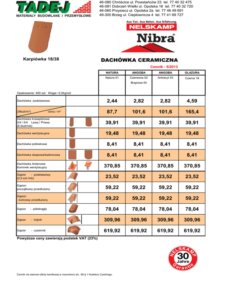 46-080 Chróścice ul. Powstańców 23 tel. 77 40 32 475 46-081 Dobrzeń Wielki ul. Opolska 16 tel. 77 40 32 720 46-060 Przysiecz ul. Opolska 2a tel. 77 46 49 691 49-300 Brzeg ul. Ciepłownicza 4 tel. 77 41 69 727 Karpiówka 18/38 DACHÓWKA CERAMICZNA Cennik - 5/2013 NATURA ANGOBA ANGOBA GLAZURA Natura 01 Czerwona 02 Antracyt 03 Czarna 18 Brązowa 04 Opakowanie: 400 szt. Waga:~2,0kg/szt Dachówka podstawowa 2,44 2,82 2,82 4,59 (36szt/m²) 87,7 101,6 101,6 165,4 Dachówka krawędziowa 3/4 i 5/4 Lewa / Prawa (6,5szt/mb) 39,91 39,91 39,91 39,91 Dachówka wentylacyjna 19,48 19,48 19,48 19,48 Dachówka połówkowa 8,41 8,41 8,41 8,41 Dachówka okapowa/kalenicowa 8,41 8,41 8,41 8,41 370,85 370,85 370,85 370,85 23,52 23,52 23,52 23,52 59,22 59,22 59,22 59,22 Gąsior: - końcowy przedłużony 59,22 59,22 59,22 59,22 Gąsior - półokrągły 78,04 78,04 78,04 78,04 Gąsior - trójnik 309,96 309,96 309,96 309,96 Gąsior - czwórnik 619,92 619,92 619,92 619,92 cena / m² Dachówka Antenowa Kominek wentylacyjny Gąsior - podstawowy (2,5 szt./mb) Gąsior: początkowy przedłużany - Powyższe ceny zawierają podatek VAT (23%) Cennik nie stanowi oferty handlowej w rozumieniu art.. 66 § 1 Kodeksu Cywilnego.