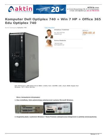 Komputer Dell Optiplex 740 + Win 7 HP + Office 365 Edu Optiplex 740 Numer katalogowy:Optiplex 740 Twój konsultant Arkadiusz Trzebiński tel. 503 030 555 [email protected] NOWOŚĆ W OFERCIE 399.00 zł 399.00 zł z VAT Karina Gładecka 796 603 606 [email protected] Dell 740 Procesor: AMD Athlon 64 X2 3800+ 2.0GHz, Ram: 1024MB ( 1GB ), Dysk: 80GB, Napęd: Dvd Windows 7 HP + Office 365 Edu. Wraz z komputerem otrzymujesz: 1. Dwa certyfikaty, które potwierdzają autentyczność systemu Microsoft Windows. 2. Oryginalną płytę z systemem Windows 7 Home Premium zabezpieczoną hologramem w polskiej wersji językowej. Strona 1 / 3 3. System zainstalowany wraz ze sterownikami. 4. Nowy klucz nadany przez Microsoft. 5. Office 365 Edu Strona 2 / 3 Product/Model DELL Optiplex 740 Procesor AMD Athlon 64 X2 3800+ 2,0GHz ( 2000 MHz ) Chipset nVidia GeForce 6150LE/NForce 430 Pamięć DDR2 1024MB pamięci pracują w DUAL CHANNEL Twardy dysk 80 GB - standard Serial ATA (SATA) - 7200 rpm Napęd optyczny COMBO - (nagrywarka CD oraz odtwarzacz DVD) Karta graficzna-video zintegrowana karta wideo nVidia Integrated nVIDIA® Quadro® NVS 210S Karta graficzna-video wolny slot PCI-Express x16 low profile Karta muzyczna zintegrowana Sigma Tel 9200 CODEC (dźwięk 2.1 kanałowy) Karta sieciowa zintegrowana, Broadcom® 5754 Gigabit* Ethernet LAN 10/100/1000 Wejścia/Wyjścia 7x 2.0 USB (dwa z przodu) 1x PCI low profile 1x PCI Express low profile 1x RS-232 1x VGA 1x LPT 4x Audio( z przodu - słuchawki, mikrofon, line-out, line-in ) Zasilacz 275W ORYGINALNY Obudowa SLIM - SFF Masa 7,5kg Gwarancja 6 - miesięcy gwarancji pisemnej Strona 3 / 3 Powered by TCPDF (www.tcpdf.org)