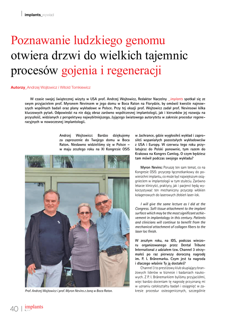 implants_wywiad Poznawanie ludzkiego genomu otwiera drzwi do wielkich tajemnic procesów gojenia i regeneracji Autorzy_Andrzej Wojtowicz i Witold Tomkiewicz W czasie swojej świątecznej wizyty w USA prof. Andrzej Wojtowicz, Redaktor Naczelny _implants spotkał się ze swym przyjacielem prof. Myronem Nevinsem w jego domu w Boca Raton na Florydzie, by omówić kwestie najnowszych wspólnych badań oraz plany wykładowe w Polsce. Przy tej okazji prof. Wojtowicz zadał prof. Nevinsowi kilka kluczowych pytań. Odpowiedzi na nie dają obraz zarówno współczesnej implantologii, jak i kierunków jej rozwoju na przyszłość, widzianych z perspektywy najwybitniejszego, żyjącego światowego autorytetu w zakresie procedur regeneracyjnych w nowoczesnej implantologii. Andrzej Wojtowicz: Bardzo dziękujemy za zaproszenie do Twojego domu w Boca Raton. Niedawno widzieliśmy się w Polsce – w maju zeszłego roku na XI Kongresie OSIS w Jachrance, gdzie wygłosiłeś wykład i zaprosiłeś wspaniałych pozostałych wykładowców z USA i Europy. W czerwcu tego roku przylatujesz do Polski ponownie, tym razem do Krakowa na Kongres Camlog. O czym będziesz tam mówił podczas swojego wykładu? Myron Nevins: Poruszę ten sam temat, co na Kongresie OSIS: przyczep łącznotkankowy do powierzchni implantu, co może być największym osiągnieciem w implantologii w tym stuleciu. Zarówno lekarze klinicyści, praktycy, jak i pacjenci będą wykorzystywać ten mechaniczny przyczep włókien kolagenowych do laserowych żłobień laser-lok. I will give the same lecture as I did at the Congress. Soft tissue attachment to the implant surface which may be the most signiicant achievement in implantology in this century. Patients and clinicians will continue to beneit from the mechanical attachment of collagen ibers to the laser loc inish. Prof. Andrzej Wojtowicz i prof. Myron Nevins z żoną w Boca Raton. 40 implants 1_2016 W zeszłym roku, na IDS, podczas wieczoru organizowanego przez Dental Tribune International z udziałem tzw. Channel 3 otrzymałeś po raz pierwszy doroczną nagrodę im. P. I. Brånemarka. Czym jest ta nagroda i dlaczego właśnie Ty ją dostałeś? Channel 3 to prestiżowy klub skupiający branżowych liderów w biznesie i badaniach naukowych. Z P. I. Brånemarkiem byliśmy przyjaciółmi, więc bardzo doceniam tę nagrodę przyznaną mi w uznaniu całokształtu badań i osiągnięć w zakresie procedur osteogenicznych, szczególnie implants_wywiad z rekombinowanymi BMP-2 i czynnikami płytkopochodnymi oraz tego ostatniego – przyczepu łącznotkankowego do powierzchni implantu. This is a prestigious recognition by leaders of both the implant industry and research community. P. I. and I were friends so I greatly appreciated the award for my overall research achievements on osteogenic procedures with BMP-2 and platelet derived growth factor and with the soft tissue attachment to the implant. Przez lata prowadziłeś badania implantów, regeneracji kości i tkanek miękkich. Co z perspektywy czasu, Twoim zdaniem, w tej dziedzinie jest największym odkryciem? Odkrycie i wykorzystanie zjawiska osteointegracji zaprezentowane przez Brånemarka na zawsze diametralnie zmieniło na korzyść pacjentów planowanie leczenia stomatologicznego. Potem poznaliśmy rolę czynników wzrostu i zaczęliśmy je stosować w postaci rekombinowanej, przez co zwiększamy możliwości regeneracji kości, tkanek miękkich i całych kompleksów tkankowych, jakim jest przyzębie, by ratować naturalne uzębienie. The discovery and presentation of osseointegration by Brånemark changed dental treatment planning with signiiant beneits for patients. The possibilities of soft and hard tissue regeneration has been enhanced by the use of recombinant growth factors and ofer the possibility of periodontal regeneration to save the natural dentition. the control of periodontal inlammation and implant inlammation. Great advances have been demonstrated by superior clinicians in both the US and Europe and, for that matter, throughout the world in regenerative procedures. The availability of a larger armamentarium of regenerative products is available in the US. I believe that Europe has a much stronger development of prosthetic technology. W czerwcu 2014 r. uczestniczyłem w genialnym kursie dotyczącym badań naukowych, który zorganizowałeś z Bill’em Gianobile na Harvardzie. Prezentowane były wyniki najnowszych badan z czynnikami wzrostu i badań genetycznych prowadzonych w celu regulacji metabolizmu kości małymi peptydami. To pewnie najbliższa przyszłość. Co uważasz obecnie za technologiczny „state of the art” w implantologii i regeneracji? Nastał wiek stomatologii cyfrowej (digital dentistry), w którym sukces opiera się na precyzji. Jest pewne, że będą ulepszenia w tej dziedzinie. Z kolei poznawanie ludzkiego genomu otwiera drzwi do wielu wielkich tajemnic procesów gojenia i regeneracji. This is the age of digital dentistry moving us towards precision based results. It is clear that improvements will continue in this ield. The knowledge of the human gnone has opened the door to many signiiant mysteries relative to healing and regeneration. Czego zatem możemy spodziewać się w najbliższej przyszłości? Stale prowadzone są badania, z których płynie wiedza, co pozwala na ulepszenia w dziedzinie implantów i regeneracji. Przyszłość stomatologii zależy od procesu kształcenia i edukacji studentów, z naciskiem na uczenie ich i nadzorowanie wykonywanych przez nich procedur klinicznych. Oczywiście, musi to być uzupełniane możliwościami kształcenia podyplomowego. Bardzo często gościsz w Europie na kongresach, masz wielu europejskich przyjaciół. Jakie widzisz różnice pomiędzy USA a Europą, jeśli chodzi o stomatologię w ogóle i szczególnie, jeśli chodzi o implanty i regenerację tkanek? Największa różnica widoczna jest w dostępności higienistek stomatologicznych w USA i w Europie. T