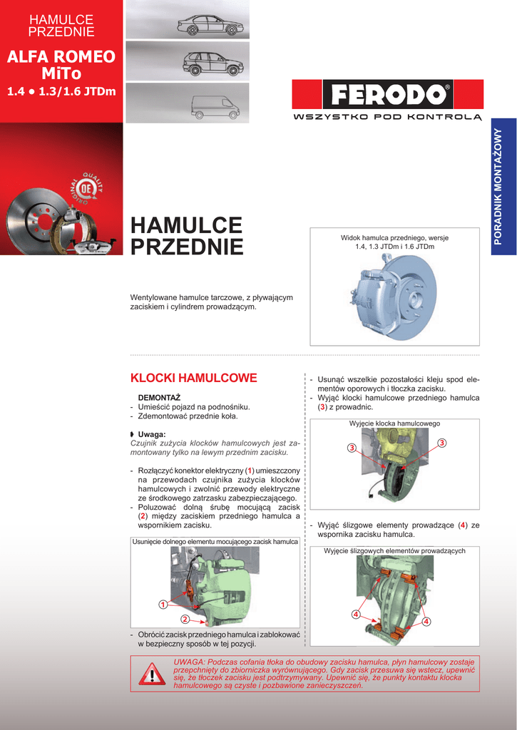 HAMULCE PRZEDNIE ALFA ROMEO MiTo HAMULCE PRZEDNIE Widok hamulca przedniego, wersje 1.4, 1.3 JTDm i 1.6 JTDm Wentylowane hamulce tarczowe, z pływającym zaciskiem i cylindrem prowadzącym. KLOCKI HAMULCOWE DEMONTAŻ - Umieścić pojazd na podnośniku. - Zdemontować przednie koła. ➧ Uwaga: Czujnik zużycia klocków hamulcowych jest zamontowany tylko na lewym przednim zacisku. - Rozłączyć konektor elektryczny (1) umieszczony na przewodach czujnika zużycia klocków hamulcowych i zwolnić przewody elektryczne ze środkowego zatrzasku zabezpieczającego. - Poluzować dolną śrubę mocującą zacisk (2) między zaciskiem przedniego hamulca a wspornikiem zacisku. Usunięcie dolnego elementu mocującego zacisk hamulca 1 2 - Usunąć wszelkie pozostałości kleju spod elementów oporowych i tłoczka zacisku. - Wyjąć klocki hamulcowe przedniego hamulca (3) z prowadnic. Wyjęcie klocka hamulcowego 3 3 - Wyjąć ślizgowe elementy prowadzące (4) ze wspornika zacisku hamulca. Wyjęcie ślizgowych elementów prowadzących 4 4 - Obrócić zacisk przedniego hamulca i zablokować w bezpieczny sposób w tej pozycji. UWAGA: Podczas cofania tłoka do obudowy zacisku hamulca, płyn hamulcowy zostaje przepchnięty do zbiorniczka wyrównującego. Gdy zacisk przesuwa się wstecz, upewnić się, że tłoczek zacisku jest podtrzymywany. Upewnić się, że punkty kontaktu klocka hamulcowego są czyste i pozbawione zanieczyszczeń. PORADNIK MONTAŻOWY 1.4 • 1.3/1.6 JTDm HAMULCE PRZEDNIE ALFA ROMEO MiTo 1.4 • 1.3/1.6 JTDm MONTAŻ - Oczyścić ślizgowe elementy prowadzące. - Umieścić ślizgowe elementy prowadzące wewnątrz gniazd wspornika. - Umieścić klocki przedniego hamulca w swoich gniazdach, zwracając szczególną uwagę na prawidłowe umieszczenie właściwego klocka po stronie tłoczka. Klocek na tę stronę oznaczony jest nitami równoległymi (1) do elementów prowadzących płytki tylnej klocka (2). - Umieścić klocki przedniego hamulca w swoich gniazdach, zwracając szczególną uwagę na prawidłowe umieszczenie właściwego klocka po stronie reakcyjnej zacisku (przeciwległej do tłoczka). Klocek na tę stronę oznaczony jest nitami umieszczonymi pod kątem prostym (3) do elementów prowadzących płytki tylnej klocka (4). - Usunąć wszystkie elementy ochronne wykonane z folii dwustronnej, umieszczone na tylnej stronie klocka hamulcowego. - Rozłączyć konektor elektryczny umieszczony na przewodach czujnika zużycia klocków hamulcowych i zwolnić przewody elektryczne ze środkowego zatrzasku zabezpieczającego. - Poluzować śruby (5) i zdemontować zacisk przedniego hamulca (6). Demontaż zacisku hamulca 6 5 Właściwe umiejscowienie klocków hamulcowych KLOCEK OD STRONY TŁOCZKA 2 1 2 KLOCEK NA STRONĘ PRZECIWLEGŁĄ - Poluzować śruby mocujące i zdemontować zacisk przedniego hamulca. - Poluzować śruby mocujące i zdemontować wspornik zacisku hamulca. - Poluzować śruby (7) i zdemontować przednie tarcze hamulcowe (8). Demontaż tarczy hamulcowej 3 4 4 7 - Umieścić zacisk przedniego hamulca w jego gnieździe i dokręcić nową śrubę momentem dokręcającym o wartości 27 ÷ 30 Nm. - Podłączyć elektryczne złącze czujnika zużycia klocków hamulcowych, ułożyć przewody elektryczne na swoim miejscu i zabezpieczyć je środkowym zatrzaskiem zabezpieczającym. TARCZE HAMULCOWE DEMONTAŻ - Umieścić pojazd na podnośniku. - Zdemontować przednie koła. ➧ Uwaga: Czujnik zużycia klocków hamulcowych jest zamontowany tylko na lewym przednim zacisku. 8 MONTAŻ - Umieścić tarczę hamulcową na swoim miejscu, po czym dokręcić śruby momentem obrotowym o wartości 10 ÷ 15 Nm. - Umieścić zacisk przedniego hamulca w jego gnieździe, po czym dokręcić śruby w prawidłowej kolejności (zacząć od momentu dokręcającego 15 Nm, a następnie dokręcić momentem o wartości 27 ÷ 30 Nm, zaczynając od górnej śruby). - Podłączyć elektryczne złącze czujnika zużycia klocków hamulcowych, ułożyć przewody elektryczne na swoim miejscu i zabezpieczyć je. ŚRODKI OSTROŻNOŚCI Płyn hamulcowy jest higroskopijny i należy go wymieniać w regularnych odstępach czasu. Nie stosować płynu, nie odpowiadającego podanym w tabeli specyfikacjom. Należy uważać, by płyn nie wyciekł przypadkowo na części lakierowane, gumowe, plastikowe lub na części mechanizmów. HAMULEC POSTOJOWY Mechaniczny hamulec postojowy składa się z dźwigni (1), umieszczonej pomiędzy dwoma przednimi siedzeniami, działającej przez system dźwigniowy i linki (2), na dźwignie hamulca postojowego tylnych hamulców. Schematyczny rysunek hamulca postojowego ➧ Uwaga: Przed cofaniem tłoka w przypadku montażu nowych klocków hamulcowych, dźwignia zacisku powinna zawsze być w położeniu zatrzymania. W przeciwnym razie hamulec postojowy nie będzie działał prawidłowo. Zaciągnięty hamulec postojowy 2 1 REGULACJA ➧ Uwaga: Hamulec postojowy należy wyregulować po dokonaniu wymiany tylnych klocków hamulcowych lub kompletu linek hamulca postojowego, ponieważ luz powstający w wyniku zużycia jest automatycznie kasowany. - W pierwszej kolejności, zanim przystąpimy do regulacji linki hamulca, należy sprawdzić, czy dźwignia, wychodząca z zacisku jest w położeniu zatrzymania. Dźwignia w położeniu zatrzymania - Zaznaczyć położenie nakrętki regulacyjnej (3), po czym odkręcić ją przynajmniej na 2 lub 3 obroty, aby całkowicie poluzować linki hamulca. Nakrętka regulacyjna hamulca postojowego 3 - Zaciągnąć dźwignię hamulca o jedno nacięcie i sprawdzić, czy dźwignia przesunęła się z położenia zatrzymania, oraz czy dystans na obu zaciskach jest jednakowy. Dźwignia przy zaciągnięciu o jedno nacięcie - Uruchomić silnik i nacisnąć zdecydowanie pedał hamulca przynajmniej 10 razy. - Zaciągnąć dźwignię ręcznego hamulca do poziomu piątego nacięcia na zębatce. - Dokręcić nakrętkę regulacyjną na dźwigni ręcznego hamulca do momentu, aż tylne