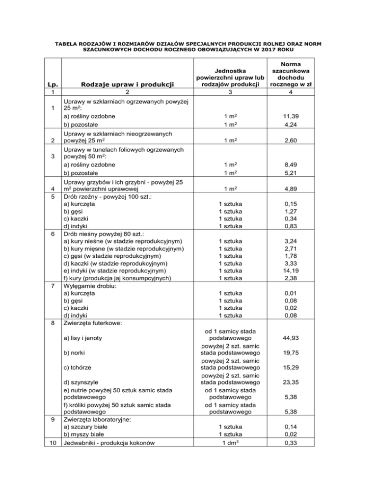 TABELA RODZAJÓW I ROZMIARÓW DZIAŁÓW SPECJALNYCH PRODUKCJI ROLNEJ ORAZ NORM SZACUNKOWYCH DOCHODU ROCZNEGO OBOWIĄZUJĄCYCH W 2017 ROKU Lp. 1 1 2 3 4 5 6 7 8 Rodzaje upraw i produkcji 2 Uprawy w szklarniach ogrzewanych powyżej 25 m2: a) rośliny ozdobne b) pozostałe 1 m2 1 m2 11,39 4,24 Uprawy w szklarniach nieogrzewanych powyżej 25 m2 1 m2 2,60 Uprawy w tunelach foliowych ogrzewanych powyżej 50 m2: a) rośliny ozdobne b) pozostałe 1 m2 1 m2 8,49 5,21 1 m2 4,89 1 sztuka 1 sztuka 1 sztuka 1 sztuka 0,15 1,27 0,34 0,83 1 sztuka 1 sztuka 1 sztuka 1 sztuka 1 sztuka 1 sztuka 3,24 2,71 1,78 3,33 14,19 2,38 1 sztuka 1 sztuka 1 sztuka 1 sztuka 0,01 0,08 0,02 0,08 Uprawy grzybów i ich grzybni - powyżej 25 m2 powierzchni uprawowej Drób rzeźny - powyżej 100 szt.: a) kurczęta b) gęsi c) kaczki d) indyki Drób nieśny powyżej 80 szt.: a) kury nieśne (w stadzie reprodukcyjnym) b) kury mięsne (w stadzie reprodukcyjnym) c) gęsi (w stadzie reprodukcyjnym) d) kaczki (w stadzie reprodukcyjnym) e) indyki (w stadzie reprodukcyjnym) f) kury (produkcja jaj konsumpcyjnych) Wylęgarnie drobiu: a) kurczęta b) gęsi c) kaczki d) indyki Zwierzęta futerkowe: a) lisy i jenoty b) norki c) tchórze 9 10 Norma Jednostka szacunkowa powierzchni upraw lub dochodu rodzajów produkcji rocznego w zł 3 4 d) szynszyle e) nutrie powyżej 50 sztuk samic stada podstawowego f) króliki powyżej 50 sztuk samic stada podstawowego Zwierzęta laboratoryjne: a) szczury białe b) myszy białe Jedwabniki - produkcja kokonów od 1 samicy stada podstawowego powyżej 2 szt. samic stada podstawowego powyżej 2 szt. samic stada podstawowego powyżej 2 szt. samic stada podstawowego od 1 samicy stada podstawowego od 1 samicy stada podstawowego 1 sztuka 1 sztuka 1 dm3 44,93 19,75 15,29 23,35 5,38 5,38 0,14 0,02 0,33 11 12 13 14 15 Pasieki powyżej 80 rodzin Uprawy roślin in vitro - powierzchnia półek Hodowla entomofagów - powierzchnia uprawy roślin żywicielskich Hodowla dżdżownic - powierzchnia łoża hodowlanego Hodowla i chów innych zwierząt poza gospodarstwem rolnym: a) krowy powyżej 5 sztuk b) cielęta powyżej 10 sztuk c) bydło rzeźne powyżej 10 sztuk (z wyjątkiem opasów) d) tuczniki powyżej 50 sztuk e) prosięta i warchlaki powyżej 50 sztuk f) chów i hodowla owiec powyżej 10 sztuk g) tucz owiec powyżej 15 sztuk h) konie rzeźne i) konie hodowlane j) hodowla ryb akwariowych powyżej 700 dm3 objętości akwarium, obliczonej według wewnętrznych długości krawędzi k) hodowla psów rasowych l) hodowla kotów rasowych 1 rodzina 1 m2 3,26 195,50 1 m2 162,90 1 m2 81,46 1 sztuka 1 sztuka 325,79 68,44 1 sztuka 1 sztuka 1 sztuka od 1 matki 1 sztuka 1 sztuka 1 sztuka stada podstawowego 35,81 40,74 16,29 6,53 9,77 488,72 1 dm3 1 sztuka stada podstawowego 1 sztuka stada podstawowego 1,47 390,98 44,00 16,29 Podstawa prawna: Rozporządzenie Ministra Finansów z dnia 7 grudnia 2016 r. w sprawie norm szacunkowych dochodu z działów specjalnych produkcji rolnej (Dz.U. poz. 2058)