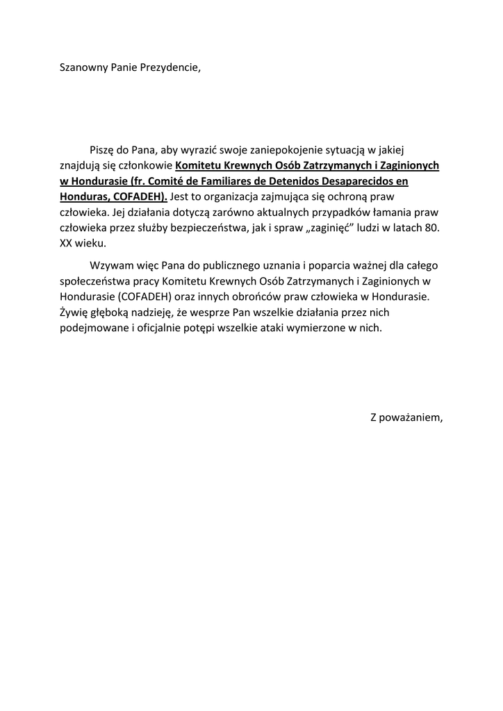 Szanowny Panie Prezydencie, Piszę do Pana, aby wyrazić swoje zaniepokojenie sytuacją w jakiej znajdują się członkowie Komitetu Krewnych Osób Zatrzymanych i Zaginionych w Hondurasie (fr. Comité de Familiares de Detenidos Desaparecidos en Honduras, COFADEH). Jest to organizacja zajmująca się ochroną praw człowieka. Jej działania dotyczą zarówno aktualnych przypadków łamania praw człowieka przez służby bezpieczeństwa, jak i spraw „zaginięć” ludzi w latach 80. XX wieku. Wzywam więc Pana do publicznego uznania i poparcia ważnej dla całego społeczeństwa pracy Komitetu Krewnych Osób Zatrzymanych i Zaginionych w Hondurasie (COFADEH) oraz innych obrońców praw człowieka w Hondurasie. Żywię głęboką nadzieję, że wesprze Pan wszelkie działania przez nich podejmowane i oficjalnie potępi wszelkie ataki wymierzone w nich. Z poważaniem,