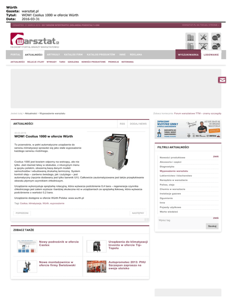 Würth Gazeta: warsztat.pl Tytuł: WOW! Coolius 1000 w ofercie Würth Data: 2016-03-31 WARSZTAT.PL NA TWOJEJ STRONIE » CZWARTEK, 31 MARCA 2016 • DO TARGÓW INTERTRAFFIC (HOLANDIA) POZOSTAŁY 4 DNI Firmy PORTAL AKTUALNOŚCI AKTUALNOŚCI RELACJE I FILMY ARTYKUŁY WYWIADY KATALOG FIRM TARGI SZKOLENIA KATALOG PRODUKTÓW NOWOŚCI PRODUKTOWE PROMOCJE INNE REKLAMA Forum LOGOWANIE NOTOWANIA Jesteś tutaj > Aktualności > Wyposażenie warsztatu AKTUALNOŚCI WYSZUKIWARKA Warsztaty Zobacz koniecznie: Forum warsztatowe TTM – znamy szczegóły RSS DODAJ NEWS 30.03.2016 WOW! Coolius 1000 w ofercie Würth To przenośnie, w pełni automatyczne urządzenie do serwisu klimatyzacji sprawdzi się jako stałe wyposażenie każdego serwisu mobilnego. FILTRUJ AKTUALNOŚCI Nowości produktowe Coolius 1000 jest bowiem odporny na wstrząsy, ale nie tylko. Jest również łatwy w obsłudze, z intuicyjnym menu w języku polskim, obszerną bazą danych modeli samochodów i wbudowaną drukarką termiczną. System kontroli oleju – zarówno świeżego, jak i zużytego – jest automatyczny (ręcznie dodawany jest tylko barwnik UV). Całkowicie zautomatyzowane jest także przepłukiwanie obwodu płynnym czynnikiem chłodniczym. Urządzenie wykorzystuje sprężarkę rotacyjną, która wytwarza podciśnienie 0,4 bara – regeneracja czynnika chłodniczego jest zatem szybsza i bardziej skuteczna niż w urządzeniach ze sprężarką tłokową, która wytwarza podciśnienie o wartości 0,2 bara. ZWIŃ Akcesoria i części Diagnostyka Wyposażenie warsztatu Lakiernictwo i blacharstwo Narzędzia w warsztacie Paliwa, oleje Chemia w warsztacie Instalacje gazowe Urządzenie dostępne w ofercie Würth Polska: www.wurth.pl Ogumienie Tagi: Coolius, klimatyzacja, Würth, wyposażenie Inne Pojazdy użytkowe POPRZEDNI NASTĘPNY Warto wiedzieć ZWIŃ Wpisz tag Szukaj ZOBACZ TAKŻE Nowy podnośnik w ofercie Castex Urządzenia do klimatyzacji Invento w ofercie TipTopolu Nowe montażownice w ofercie firmy Świstowski Autopromotec 2013: PHU Szczepan zaprasza na swoje stoisko Würth Gazeta: warsztat.pl Tytuł: WOW! Coolius 1000 w ofercie Würth Data: 2016-03-31 RELACJE I FILMY Premiera nowej opony GT RADIAL... WARSZTAT.PL SZYBKIE LINKI ZOBACZ TAKŻE » O portalu warsztat.pl » Warsztat.pl na Twojej stronie » PIM » Nasi partnerzy » Warsztat TV » Targi Frankfurt » Możliwości reklamowe » Słownik motoryzacyjny » Motomarketing.pl » Polityka prywatności » Lista warsztatów » Targi Techniki Motoryzacyjnej » Kontakt z redakcją » Zgłoś błąd na stronie » Targi Lipskie WARSZTAT.PL NA FACEBOOK WIĘCEJ