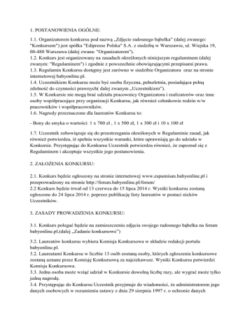 1. POSTANOWIENIA OGÓLNE: 1.1. Organizatorem konkursu pod nazwą „Zdjęcie radosnego bąbelka” (dalej zwanego: "Konkursem") jest spółka "Edipresse Polska" S.A. z siedzibą w Warszawie, ul. Wiejska 19, 00-480 Warszawa (dalej zwana: "Organizatorem"). 1.2. Konkurs jest organizowany na zasadach określonych niniejszym regulaminem (dalej zwanym: "Regulaminem") i zgodnie z powszechnie obowiązującymi przepisami prawa. 1.3. Regulamin Konkursu dostępny jest zarówno w siedzibie Organizatora oraz na stronie internetowej babyonline.pl. 1.4. Uczestnikiem Konkursu może być osoba fizyczna, pełnoletnia, posiadająca pełną zdolność do czynności prawnych( dalej zwanym „Uczestnikiem”). 1.5. W Konkursie nie mogą brać udziału pracownicy Organizatora i realizatorów oraz inne osoby współpracujące przy organizacji Konkursu, jak również członkowie rodzin w/w pracowników i współpracowników. 1.6. Nagrody przeznaczone dla laureatów Konkursu to: - Bony do smyka o wartości: 1 x 700 zł , 1 x 500 zł, 1 x 300 zł i 10 x 100 zł 1.7. Uczestnik zobowiązuje się do przestrzegania określonych w Regulaminie zasad, jak również potwierdza, iż spełnia wszystkie warunki, które uprawniają go do udziału w Konkursie. Przystępując do Konkursu Uczestnik potwierdza również, że zapoznał się z Regulaminem i akceptuje wszystkie jego postanowienia. 2. ZAŁOŻENIA KONKURSU: 2.1. Konkurs będzie ogłoszony na stronie internetowej www.espumisan.babyonline.pl i przeprowadzony na stronie http://forum.babyonline.pl/forum/ 2.2 Konkurs będzie trwał od 13 czerwca do 15 lipca 2014 r. Wyniki konkursu zostaną ogłoszone do 24 lipca 2014 r. poprzez publikację listy laureatów w postaci nicków Uczestników. 3. ZASADY PROWADZENIA KONKURSU: 3.1. Konkurs polegać będzie na zamieszczeniu zdjęcia swojego radosnego bąbelka na forum babyonline.pl.(dalej „Zadanie konkursowe”) 3.2. Laureatów konkursu wybiera Komisja Konkursowa w składzie redakcji portalu babyonline.pl. 3.2. Laureatami Konkursu w liczbie 13 osób zostaną osoby, których zgłoszenia konkursowe zostaną uznane przez Komisję Konkursową za najciekawsze. Wyniki Konkursu potwierdzi Komisja Konkursowa. 3.3. Jedna osoba może wziąć udział w Konkursie dowolną liczbę razy, ale wygrać może tylko jedną nagrodę. 3.4. Przystępując do Konkursu Uczestnik przyjmuje do wiadomości, że administratorem jego danych osobowych w rozumieniu ustawy z dnia 29 sierpnia 1997 r. o ochronie danych osobowych (tekst jedn. Dz. U. z 2002 r. Nr 101, poz. 926 z późn. zm.) jest Organizator. Organizator oświadcza, że dane osobowe Uczestnika w zakresie: imię i nazwisko, numer telefonu komórkowego lub stacjonarnego, adresu e-mailowego lub odpowiednio adres zamieszkania, będą przetwarzane przez Organizatora Konkursu z siedzibą w Warszawie przy ul. Wiejskiej 19 w celu realizacji umowy przystąpienia do Konkursu i jego prawidłowego przeprowadzenia lub marketingu bezpośredniego własnych produktów Organizatora Konkursu. Gwarantujemy prawo wglądu do swoich danych osobowych oraz ich poprawiania, jak również żądania zaprzestania przetwarzania danych. Dane osobowe nie będą udostępniane innym podmiotom. Podanie danych jest dobrowolne. Uczestnik Konkursu wyraża zgodę na upublicznienie jego danych osobowych w zakresie jego nicku na stronie portalu internetowego www.espumisan.babyonline.pl przy publikacji wyników konkursu i oświadcza, że nie będzie zgłaszał żadnych roszczeń z tego tytułu. 3.5. Zgłaszając udział w Konkursie Uczestnik potwierdza, że jestem autorem wszelkich Utworów – w rozumieniu ustawy o prawie autorskim i prawach pokrewnych – które powstały w związku z wykonaniem wskazanego w pkt 3.1 Regulaminu Zadania konkursowego. Uczestnicy Konkursu ponoszą pełną odpowiedzialność wobec Organizatora i fundatora nagród w przypadku zgłoszenia przez osoby trzecie roszczeń z tytułu naruszenia ich praw wskutek wykorzystania przez Organizatora i fundatora nagród Zadań konkursowych zgodnie z niniejszym Regulaminem. 3.6. Zgłoszenia muszą być unikalnymi treściami, stworzonymi specjalnie na potrzeby danego konkursu. Zdjęcia, które dostępne są już w internecie, na innych serwisach, będą dyskwalifikowane. 3.7.Uczestnicy Konkursu udzielają Organizatorowi nieodpłatnej, nieograniczonej terytorialnie ani czasowo licencji niewyłącznej do korzystania z Zadań konkursowych na polu eksploatacji rozpowszechnianie w taki sposób aby każdy miał dostęp w miejscu i czasie przez siebie wybranym w celu publikacji na stronach internetowych Organizatora, w szczególności www.babyonline.pl oraz www.espumisan.babyonline.pl, w wybranym przez Organizatora kontekście lub w zestawieniu z innymi Zadaniami konkursowymi biorącymi udział w Konkursie. 3.8. Uczestnicy Konkursu udzielają zgody na rozpowszechnianie wizerunku ich oraz ich dzieci w sposób określony w pkt 3.7. Regulaminu. 4. PRZYZNAWANIE NAGRÓD: 4.1. Laureaci wyłonieni zostaną do 24 lipca 2014 roku. 4.2. Laureaci powiadomieni zostaną o wygranej za pośrednictwem skrzynki profilowej na forum babyonline.pl do 24 lipca 2014 roku.. 4.3. Nagrody do poszczególnych laureatów wysłane zostaną pocztą lub przesyłką kurierską na koszt Organizatora pod adres zamieszkania wskazany przez laureata w terminie 28 dni od dnia otrzymania od laureata danych koniecznych do wysyłki. 4.4. W przypadku braku dostarczenia danych adresowych przez laureata w terminie 7 dni od dnia poinformowania o wygranej, prawo do nagrody wygasa. Organizator zastrzega, że nagrody nie podlegają zamianie na ich równowartość pieniężną. 4.5. Laureatom nie przysługuje prawo do wyboru nagrody i zastrzeżenia szczególnych właściwości nagród. 4.6. W konkursie mogą brać udział jedynie osoby przebywające na terenie Rzeczpospolitej Polskiej. 5. POSTĘPOWANIE REKLAMACYJNE: 5.1. W celu umożliwienia jak najszybszej dyskwalifikacji osób łamiących zasady Konkursu, prosimy o zgłaszanie 