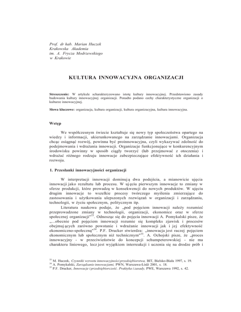 Prof. dr hab. Marian Huczek Krakowska Akademia im. A. Frycza Modrzewskiego w Krakowie KULTURA INNOWACYJNA ORGANIZACJI Streszczenie: W artykule scharakteryzowano istotę kultury innowacyjnej. Przedstawiono zasady budowania kultury innowacyjnej organizacji. Ponadto podano cechy charakterystyczne organizacji o kulturze innowacyjnej. Słowa kluczowe: organizacja, kultura organizacji, kultura organizacyjna, kultura innowacyjna. Wstęp We współczesnym świecie kształtuje się nowy typ społeczeństwa opartego na wiedzy i informacji, ukierunkowanego na zarządzanie innowacjami. Organizacja chcąc osiągnąć rozwój, powinna być proinnowacyjna, czyli wykazywać zdolność do podejmowania i wdrażania innowacji. Organizacje funkcjonujące w konkurencyjnym środowisku powinny w sposób ciągły tworzyć (lub przejmować z otoczenia) i wdrażać różnego rodzaju innowacje zabezpieczające efektywność ich działania i rozwoju. 1. Przesłanki innowacyjności organizacji W interpretacji innowacji dominuj ą dwa podejścia, a mianowicie ujęcia innowacji jako rezultatu lub procesu. W uj ęciu pierwszym innowacje to zmiany w sferze produkcji, które prowadzą w konsekwencji do nowych produktów. W ujęciu drugim innowacje to wszelkie procesy twórczego myślenia zmierzające do zastosowania i użytkowania ulepszonych rozwiązań w organizacji i zarządzaniu, technologii, w życiu społecznym, politycznym itp. Literatura naukowa podaje, że „pod pojęciem innowacji należy rozumieć przeprowadzone zmiany w technologii, organizacji, ekonomice oraz w sferze społecznej organizacji"33. Odnosząc się do pojęcia innowacji A. Pomykalski pisze, że „...obecnie pod pojęciem innowacji rozumie się kompleks zjawisk i procesów obejmuj ących zarówno powstanie i wdrażanie innowacji jak i jej efektywność ekonomiczno-społeczną"34. P.F. Drucker stwierdza: „innowacja jest raczej pojęciem ekonomicznym lub społecznym niż technicznym"35. A. Ochojski pisze, że „proces innowacyjny - w przeciwieństwie do koncepcji schumpeterowskiej - nie ma charakteru liniowego, lecz jest wyjątkiem interreakcji i uczenia się na drodze prób i 33 M. Huczek, Czynniki wzrostu innowacyjności przedsiębiorstwa, BIT, Bielsko-Biała 1997, s. 19. A. Pomykalski, Zarządzanie innowacjami, PWN, Warszawa-Łódź 2001, s. 18. 35 P.F. Drucker, Innowacje i przedsiębiorczość. Praktyka i zasady, PWE, Warszawa 1992, s. 42. 34 błędów oraz kumulowania wiedzy specyficznej i interdyscyplinarnej"36. D. SurówkaMarszałek pod pojęciem innowacji rozumie zmianę, która może przybierać kilka form, najczęściej ujmowanych w cztery kategorie: • innowacja produktowa - zmiany produktów (usług) oferowanych przez przedsiębiorstwo, • innowacja procesowa - zmiany w sposobie tworzenia i dystrybucji tych produktów, • innowacja pozycyjna - zmiany kontekstu, w którym produkty są wprowadzane, • innowacja paradygmatyczna - zmiany zasadniczego modelu będącego ideą działalności organizacji37. R. Nowacki stwierdza, że „innowacja jest postrzegana jako strategiczny instrument służący do budowania i poszerzania zdolności konkurencyjnych przedsiębiorstw. Jest kluczem do postępu i rozwoju, jest także źródłem wynalazków we wszystkich sferach życia społeczności, technologii i administracji"38. P.F. Drucker podkreśla, że „... cechą innowacji opartych na wiedzy - i to wyjątkową - jest to, że niemal nigdy nie są wynikiem wpływu jednej dziedziny naukowej, ale kilku różnych dziedzin, przy czym nie wszystkie z nich mają charakter ścisły lub techniczny"39. Gromadzona i rozwijana w organizacji oraz pozyskiwana z rynku wiedza ułatwia tworzenie i wdrażanie innowacji. Realizacja procesów w organizacji jest ukierunkowana na wzrost wartości wiedzy zgromadzonej w produktach tej organizacji, w celu większego zaspokojenia potrzeb klientów proponowaną im ofertą 0 większej wartości. Zgodnie z zasadami marketingu relacyjnego, w tym stosowanego z wykorzystaniem systemu CRM, klient aktywnie uczestniczy w tworzeniu i doskonaleniu w czasie oferty organizacji, zgodnej z jego oczekiwaniami i preferencjami. Ostatnio coraz częściej mówi się o koncepcji szybkiej innowacji (fast innovation). Szybka innowacja odnosi się do kreowania nowych produktów, usług, modeli biznesowych, procesów oraz rynków dostatecznie zróżnicowanych oraz szybkości, z jaką przedsiębiorstwo utrzymuje przez dekady ponadprzeciętny zwrot dla właścicieli40. Zaznacza się w ten sposób, że zachodzi konieczność tworzenia innowacji z wyprzedzeniem teraźniejszych i przyszłych konkurentów. Z podejściem tym wiążą się trzy zasady: zróżnicowanie, szybki czas wprowadzenia produktu na rynek oraz zaburzające radykalne innowacje41. Zróżnicowanie to wytwarzanie produktów, które uwzględniają potrzeby klienta 1 spełniają jego potrzeby lepiej, niż to robią konkurenci. Szybki czas wprowadzenia produktu na rynek pozwala z kolei utrzymać wzrost zyskowności. Zaburzające radykalne innowacje, czyli takie, które stanowią znaczącą zmianę w stosunku do 36 A. Ochojski, Przedsiębiorczość sektora publicznego a konkurencyjność i rozwój regionu, [w:] Konkurencyjność a rozwój regionalny, red. A. Klasik, Akademia Ekonomiczna w Katowicach, Katowice 2006, s. 291. 37 D. Surówka-Marszałek, Marketing, Zeszyty Naukowe Akademii Krakowskiej, Kraków 2006, s. 20. 38 R. Nowacki, Innowacyjność w zarządzaniu a konkurencyjność przedsiębiorstwa, Difin, Warszawa 2010, s. 30. 39 P.F. Drucker, Innowacja i przedsiębiorczość..., s. 124. 40 M.L. George, J. Works, K. Watson-Hemphill, Fast innovation-achieving superior, differentiation, sped to market and increased profitability, New York, Mc Graw-Hill 2005, s. 15. 4 A. Sankowska, Organizacja wirtualna, Wyd. Akademickie i Profesjonalne Spółka z o.o., Warszawa 2009, s. 104-105. istniejących rozwiązań na rynku, pełnią szczególną rolę w wyróżnianiu oferty rynkowej przedsięb