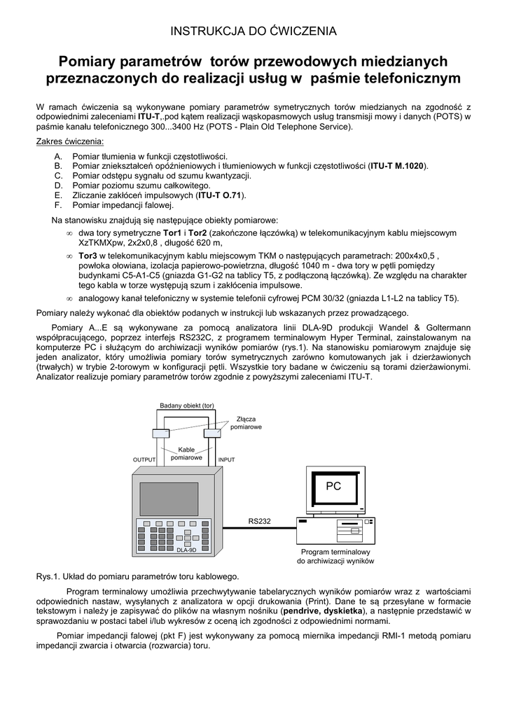 INSTRUKCJA DO ĆWICZENIA Pomiary parametrów torów przewodowych miedzianych przeznaczonych do realizacji usług w paśmie telefonicznym W ramach ćwiczenia są wykonywane pomiary parametrów symetrycznych torów miedzianych na zgodność z odpowiednimi zaleceniami ITU-T,.pod kątem realizacji wąskopasmowych usług transmisji mowy i danych (POTS) w paśmie kanału telefonicznego 300...3400 Hz (POTS - Plain Old Telephone Service). Zakres ćwiczenia: A. B. C. D. E. F. Pomiar tłumienia w funkcji częstotliwości. Pomiar zniekształceń opóźnieniowych i tłumieniowych w funkcji częstotliwości (ITU-T M.1020). Pomiar odstępu sygnału od szumu kwantyzacji. Pomiar poziomu szumu całkowitego. Zliczanie zakłóceń impulsowych (ITU-T O.71). Pomiar impedancji falowej. Na stanowisku znajdują się następujące obiekty pomiarowe: • dwa tory symetryczne Tor1 i Tor2 (zakończone łączówką) w telekomunikacyjnym kablu miejscowym XzTKMXpw, 2x2x0,8 , długość 620 m, • Tor3 w telekomunikacyjnym kablu miejscowym TKM o następujących parametrach: 200x4x0,5 , powłoka ołowiana, izolacja papierowo-powietrzna, długość 1040 m - dwa tory w pętli pomiędzy budynkami C5-A1-C5 (gniazda G1-G2 na tablicy T5, z podłączoną łączówką). Ze względu na charakter tego kabla w torze występują szum i zakłócenia impulsowe. • analogowy kanał telefoniczny w systemie telefonii cyfrowej PCM 30/32 (gniazda L1-L2 na tablicy T5). Pomiary należy wykonać dla obiektów podanych w instrukcji lub wskazanych przez prowadzącego. Pomiary A...E są wykonywane za pomocą analizatora linii DLA-9D produkcji Wandel & Goltermann współpracującego, poprzez interfejs RS232C, z programem terminalowym Hyper Terminal, zainstalowanym na komputerze PC i służącym do archiwizacji wyników pomiarów (rys.1). Na stanowisku pomiarowym znajduje się jeden analizator, który umożliwia pomiary torów symetrycznych zarówno komutowanych jak i dzierżawionych (trwałych) w trybie 2-torowym w konfiguracji pętli. Wszystkie tory badane w ćwiczeniu są torami dzierżawionymi. Analizator realizuje pomiary parametrów torów zgodnie z powyższymi zaleceniami ITU-T. Badany obiekt (tor) Złącza pomiarowe OUTPUT Kable pomiarowe INPUT PC RS232 DLA-9D Program terminalowy do archiwizacji wyników Rys.1. Układ do pomiaru parametrów toru kablowego. Program terminalowy umożliwia przechwytywanie tabelarycznych wyników pomiarów wraz z wartościami odpowiednich nastaw, wysyłanych z analizatora w opcji drukowania (Print). Dane te są przesyłane w formacie tekstowym i należy je zapisywać do plików na własnym nośniku (pendrive, dyskietka), a następnie przedstawić w sprawozdaniu w postaci tabel i/lub wykresów z oceną ich zgodności z odpowiednimi normami. Pomiar impedancji falowej (pkt F) jest wykonywany za pomocą miernika impedancji RMI-1 metodą pomiaru impedancji zwarcia i otwarcia (rozwarcia) toru. 1. Pomiary parametrów torów za pomocą analizatora DLA-9D. Poszczególne funkcje sterujące pracą analizatora, pojawiające się na pasku funkcyjnym (dolna linia wyświetlacza), są uruchamiane za pomocą odpowiadających im przycisków <S1>...<S5>. Funkcje te zmieniają się w zależności od rodzaju wykonywanego pomiaru i aktualnego poziomu menu. Do uruchomienia poszczególnych trybów pomiarowych służy przycisk <MODE> otwierający menu Measurement Modes, z którego te tryby są dostępne. Pomiary z pkt 1.3, 1.4 i 1.7 są uruchamiane za pomocą funkcji <RUN> na pasku funkcyjnym, a zatrzymywane automatycznie po spełnieniu zadanego kryterium lub za pomocą funkcji <STOP>. 1.1. Czynności wstępne. • Skonfigurować układ pomiarowy zgodnie z rys.1. • Włączyć analizator i poczekać na automatyczne wykonanie inicjalizacyjnych procedur testowych i otworzenie się głównego menu. W przypadku nieprawidłowego zachowania się przyrządu podczas pomiarów można sprawdzić poprawność działania analizatora za pomocą wybranych ręcznie procedur testujących. W tym celu należy połączyć wejście i wyjście analizatora kablem pomiarowym, a następnie z paska funkcyjnego na dole ekranu należy uruchomić funkcję SELF TEST, wybrać określoną procedurę i uruchomić ją funkcją RUN. Po poprawnym zakończeniu testów (brak błędów) można przystąpić do dalszych czynności. • Na komputerze PC uruchomić program terminalowy Hyper Terminal (za pomocą ikony na pulpicie) i nawiązać połączenie z analizatorem (w menu Plik/Otwórz otworzyć sesję DLA9). • Sprawdzić, czy są ustawione takie same parametry transmisji przez interfejs RS232C w analizatorze (funkcje Main Menu / UTILITIES / Printer Parameters / SELECT) i w programie terminalowym. Typowe ustawienia to: 9600 8 N 2. W razie potrzeby dokonać stosowanych zmian. 1.2. Ustawienie parametrów systemowych. Przed wykonaniem pomiarów należy ustawić wartości istotnych parametrów systemowych (impedancje pracy, rodzaj jednostek poziomu, tryb pomiaru itp), co jest realizowane z poziomu dowolnego trybu pomiarowego za wyjątkiem D.C. Voltage, poprzez odpowiednią zmianę grupy parametrów System (za pomocą funkcji <CHANGE> na pasku funkcyjnym). Dla wszystkich wykonywanych pomiarów (pasmo częstotliwości maks. 20 kHz) należy ustawić impedancje pracy nadajnika i odbiornika równe 600 Ω, co wykonuje się poprzez odpowiedni wybór wartości tzw. impedancji systemowej, a następnie ustawieniu impedancji generatora TX i odbiornika RX równych impedancji systemowej. Rodzaj jednostek poziomu nadawanego należy ustawić na bezwzględne (Absolute - dBm), a poziomu odebranego na względne (Relative - dB, względem poziomu odniesienia 0 dBm). Tryb pomiaru ustawić na 2-torowy (4-przewodowy) z włączona pętlą zwrotną. Poniżej przedstawiono właściwe nastawy tych parametrów systemowych. TX Impedance: System impedancja wyjściowa generatora RX Impedance: System impedancja wejściowa odbiornika System Impedence: 600 Ω impedancja systemowa TX Measurement: Absolut