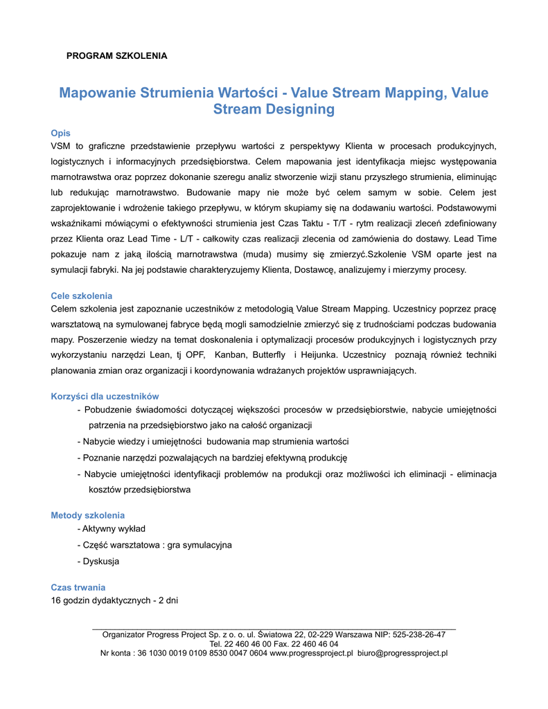 PROGRAM SZKOLENIA Mapowanie Strumienia Wartości - Value Stream Mapping, Value Stream Designing Opis VSM to graficzne przedstawienie przepływu wartości z perspektywy Klienta w procesach produkcyjnych, logistycznych i informacyjnych przedsiębiorstwa. Celem mapowania jest identyfikacja miejsc występowania marnotrawstwa oraz poprzez dokonanie szeregu analiz stworzenie wizji stanu przyszłego strumienia, eliminując lub redukując marnotrawstwo. Budowanie mapy nie może być celem samym w sobie. Celem jest zaprojektowanie i wdrożenie takiego przepływu, w którym skupiamy się na dodawaniu wartości. Podstawowymi wskaźnikami mówiącymi o efektywności strumienia jest Czas Taktu - T/T - rytm realizacji zleceń zdefiniowany przez Klienta oraz Lead Time - L/T - całkowity czas realizacji zlecenia od zamówienia do dostawy. Lead Time pokazuje nam z jaką ilością marnotrawstwa (muda) musimy się zmierzyć.Szkolenie VSM oparte jest na symulacji fabryki. Na jej podstawie charakteryzujemy Klienta, Dostawcę, analizujemy i mierzymy procesy. Cele szkolenia Celem szkolenia jest zapoznanie uczestników z metodologią Value Stream Mapping. Uczestnicy poprzez pracę warsztatową na symulowanej fabryce będą mogli samodzielnie zmierzyć się z trudnościami podczas budowania mapy. Poszerzenie wiedzy na temat doskonalenia i optymalizacji procesów produkcyjnych i logistycznych przy wykorzystaniu narzędzi Lean, tj OPF, Kanban, Butterfly i Heijunka. Uczestnicy poznają również techniki planowania zmian oraz organizacji i koordynowania wdrażanych projektów usprawniających. Korzyści dla uczestników - Pobudzenie świadomości dotyczącej większości procesów w przedsiębiorstwie, nabycie umiejętności patrzenia na przedsiębiorstwo jako na całość organizacji - Nabycie wiedzy i umiejętności budowania map strumienia wartości - Poznanie narzędzi pozwalających na bardziej efektywną produkcję - Nabycie umiejętności identyfikacji problemów na produkcji oraz możliwości ich eliminacji - eliminacja kosztów przedsiębiorstwa Metody szkolenia - Aktywny wykład - Część warsztatowa : gra symulacyjna - Dyskusja Czas trwania 16 godzin dydaktycznych - 2 dni _________________________________________________________________________________ Organizator Progress Project Sp. z o. o. ul. Światowa 22, 02-229 Warszawa NIP: 525-238-26-47 Tel. 22 460 46 00 Fax. 22 460 46 04 Nr konta : 36 1030 0019 0109 8530 0047 0604 www.progressproject.pl [email protected] PROGRAM SZKOLENIA Program szkolenia 1. Wprowadzenie - Lean Manufacturing, podstawowe założenia, charakterystyka koncepcji - Dlaczego zaczynamy od budowy mapy strumienia wartości? - idea mapowania - Charakterystyka marnotrawstwa - Definicja strumienia wartości i wartości dodanej 2. Value Stream Mapping - niezbędne informacje: - przykładowe mapy, - definicje, parametry i ikony wykorzystywane podczas budowania map, - etapy VSM: VSA (Value Stream Analysis), VSD (Value Stram Designing), VSP (Value Stream Plan), - podział na strumienie wartości, - wybór rodziny produktów, - zebranie wiarygodnych danych, - mapowanie przepływu informacji w strumieniu. 3. Część warsztatowa: VSA - diagnoza stanu istniejącego na podstawie symulowanej fabryki, tworzenie mapy wspólnie z uczestnikami szkolenia: - stan strumienia wartości w konkretnej chwili, dla reprezentanta i przeciętnego zapotrzebowania, charakterystyka procesów, - charakterystyka kluczowych dostawców strumienia wartości, - charakterystyka kluczowych klientów lub grupy klientów strumienia wartości. 4. Optymalizacja procesów symulowanej fabryki przy wykorzystaniu narzędzi Lean, m.in. projektowanie przepływu oraz organizacja stanowisk/gniazd wg Czasu Taktu (Taktu Klienta), OPF (przepływ jednej sztuki), system ssący, poziomowanie produkcji (Heijunka). 5. Analiza mapy stanu istniejącego, poszukiwanie możliwości zwiększenia efektywności strumienia wartości. 6. Część warsztatowa: VSD - projektowanie wizji stanu przyszłego, budowa mapy wraz z uczestnikami na podstawie wypracowanych wcześniej rozwiązań. - budowa strategii produkcyjno-logistycznej, - budowa systemu realizacji zleceń produkcyjnych, - określenie zasad obsługi klientów, planowania, zaopatrywania, zarządzania zapasami i przepływem w procesie wytwórczym. 7. Część warsztatowa: VSP - długoterminowy i krótkoterminowy plan doskonalenia i wdrożenia rozwiązań. Organizowanie grup i sesji Kaizen. _________________________________________________________________________________ Organizator Progress Project Sp. z o. o. ul. Światowa 22, 02-229 Warszawa NIP: 525-238-26-47 Tel. 22 460 46 00 Fax. 22 460 46 04 Nr konta : 36 1030 0019 0109 8530 0047 0604 www.progressproject.pl [email protected] PROGRAM SZKOLENIA Harmonogram Harmonogram Rejestracja uczestników Zajęcia Przerwa Zajęcia Obiad Zajęcia Przerwa Zajęcia Dzień 1 9:45 - 10:00 10:00 - 11:00 11:00 - 11:15 11:15 - 13:00 13:00 - 13:45 13:45 - 15:00 15:00 - 15:10 15:10 - 17:00 Dzień 2 9:00 - 11:00 11:00 - 11:15 11:15 - 13:00 13:00 - 13:45 13:45 - 15:00 15:00 - 15:10 15:10 - 16:00 Koszt inwestycji W celu poznania szczegółów, zapraszamy do kontaktu. Informacje dodatkowe W przypadku zainteresowania jednym szkoleniem większej liczby osób (powyżej 3-4) z jednej firmy jesteśmy w stanie zorganizować dodatkowe terminy w dogodnej lokalizacji przy założeniu, że szkolenie będzie zaplanowane z co najmniej półtora miesięcznym wyprzedzeniem. Każdy temat możemy również przygotować według Państwa wymagań oraz potrzeb firmy w formie szkolenia dedykowanego, wyjazdu integracyjnego lub doradztwa. Zapraszamy do kontaktu, Progress Project sp. z o.o. ul. Światowa 22 02-229 Warszawa Tel. 22 460 46 00 Fax. 22 460 46 04 e-mail: [email protected] www.progressproject.pl _________________________________________________________________________________ Organizator Progress Project Sp. z o. o. ul. Światowa 22, 02-229 Warszawa NIP: 525-238-26-47 Tel. 22 460 
