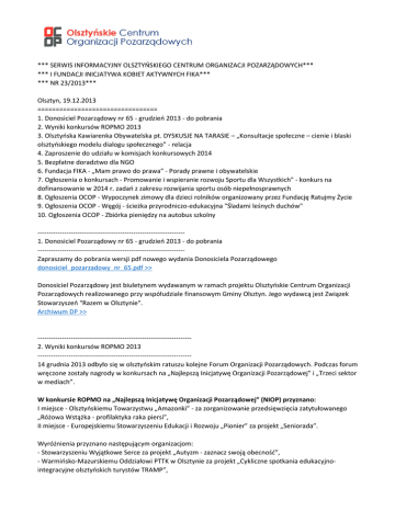 *** SERWIS INFORMACYJNY OLSZTYŃSKIEGO CENTRUM ORGANIZACJI POZARZĄDOWYCH*** *** I FUNDACJI INICJATYWA KOBIET AKTYWNYCH FIKA*** *** NR 23/2013*** Olsztyn, 19.12.2013 ================================= 1. Donosiciel Pozarządowy nr 65 - grudzień 2013 - do pobrania 2. Wyniki konkursów ROPMO 2013 3. Olsztyńska Kawiarenka Obywatelska pt. DYSKUSJE NA TARASIE – „Konsultacje społeczne – cienie i blaski olsztyńskiego modelu dialogu społecznego” - relacja 4. Zaproszenie do udziału w komisjach konkursowych 2014 5. Bezpłatne doradztwo dla NGO 6. Fundacja FIKA - „Mam prawo do prawa” - Porady prawne i obywatelskie 7. Ogłoszenia o konkursach - Promowanie i wspieranie rozwoju Sportu dla Wszystkich" - konkurs na dofinansowanie w 2014 r. zadań z zakresu rozwijania sportu osób niepełnosprawnych 8. Ogłoszenia OCOP - Wypoczynek zimowy dla dzieci rolników organizowany przez Fundację Ratujmy Życie 9. Ogłoszenia OCOP - Węgój - ścieżka przyrodniczo-edukacyjna "Śladami leśnych duchów" 10. Ogłoszenia OCOP - Zbiórka pieniędzy na autobus szkolny -----------------------------------------------------------------1. Donosiciel Pozarządowy nr 65 - grudzień 2013 - do pobrania -----------------------------------------------------------------Zapraszamy do pobrania wersji pdf nowego wydania Donosiciela Pozarządowego donosiciel_pozarzadowy_nr_65.pdf >> Donosiciel Pozarządowy jest biuletynem wydawanym w ramach projektu Olsztyńskie Centrum Organizacji Pozarządowych realizowanego przy współudziale finansowym Gminy Olsztyn. Jego wydawcą jest Związek Stowarzyszeń "Razem w Olsztynie". Archiwum DP >> --------------------------------------------------------------------2. Wyniki konkursów ROPMO 2013 --------------------------------------------------------------------14 grudnia 2013 odbyło się w olsztyńskim ratuszu kolejne Forum Organizacji Pozarządowych. Podczas forum wręczone zostały nagrody w konkursach na „Najlepszą Inicjatywę Organizacji Pozarządowej” i „Trzeci sektor w mediach”. W konkursie ROPMO na „Najlepszą Inicjatywę Organizacji Pozarządowej” (NIOP) przyznano: I miejsce - Olsztyńskiemu Towarzystwu „Amazonki” - za zorganizowanie przedsięwzięcia zatytułowanego „Różowa Wstążka - profilaktyka raka piersi”, II miejsce - Europejskiemu Stowarzyszeniu Edukacji i Rozwoju „Pionier” za projekt „Seniorada”. Wyróżnienia przyznano następującym organizacjom: - Stowarzyszeniu Wyjątkowe Serce za projekt „Autyzm - zaznacz swoją obecność”, - Warmińsko-Mazurskiemu Oddziałowi PTTK w Olsztynie za projekt „Cykliczne spotkania edukacyjnointegracyjne olsztyńskich turystów TRAMP”, - Fundacji Kobiety dla Kobiet za projekt „Kobieta”, - Warmińsko-Mazurskiemu Oddziałowi Polskiego Związku Chórów i Orkiestr w Olsztynie za projekt „Piosenka jest dobra na wszystko”. W konkursie „Trzeci sektor w mediach” nagrodzono: - Małgorzatę Kundzicz (Gazeta Olsztyńska) - I miejsce - za publikacje poświęcone działalności stowarzyszeń prowadzących Zespół Placówek Edukacyjnych w Olsztynie, gdzie nauki pobierają dzieci niepełnosprawne, głównie autystyczne, - Wacława Brudka (Gazeta On Line Olsztyn24) - II miejsce - za wyjątkową aktywność i rzetelność w relacjonowaniu działalności organizacji pozarządowych. Wyróżnienie przyznano Beacie Brokowskiej (Gazeta Olsztyńska). Gratulujemy wszystkim nagrodzonym! --------------------------------------------------------------------3. Olsztyńska Kawiarenka Obywatelska pt. DYSKUSJE NA TARASIE – „Konsultacje społeczne – cienie i blaski olsztyńskiego modelu dialogu społecznego” – relacja --------------------------------------------------------------------10 grudnia 2013 w Klubokawiarni Awangarda Bis odbyła się Olsztyńska Kawiarenka Obywatelska pt. DYSKUSJE NA TARASIE – „Konsultacje społeczne – cienie i blaski olsztyńskiego modelu dialogu społecznego”, w której wzięło udział ponad 20 osób - mieszkańców Olsztyna i okolic oraz przedstawicieli instytucji zainteresowanych problematyką konsultacji społecznych. Była to moderowana dyskusja między zaproszonymi ekspertami a uczestnikami, której głównym celem była merytoryczna analiza konsultacji społecznych w kontekście obecnie obowiązującej uchwały. Zobacz więcej >> --------------------------------------------------------------------4. Zaproszenie do udziału w komisjach konkursowych 2014 --------------------------------------------------------------------W związku z realizacją Uchwały Nr 59/773/13/IV Zarządu Województwa Warmińsko-Mazurskiego z dnia 25 listopada 2013 r. w sprawie ogłoszenia otwartego konkursu ofert na realizację 11 zadań Samorządu Województwa Warmińsko-Mazurskiego w roku 2014 przez organizacje pozarządowe oraz podmioty wymienione w art. 3 ust. 3 ustawy o działalności pożytku publicznego i o wolontariacie, Pełnomocnik Marszałka ds. Współpracy z Organizacjami Pozarządowymi Joanna Glezmann zwraca się z prośbą o wskazanie osób, które będą mogły wziąć udział w pracach komisji konkursowych powołanych przez Zarząd Województwa do zaopiniowania ofert organizacji pozarządowych wpływających na realizację w/w zadań. Zobacz więcej >> --------------------------------------------------------------------5. Bezpłatne doradztwo dla NGO --------------------------------------------------------------------Olsztyńskie Centrum Organizacji Pozarządowych oferuje bezpłatną pomoc przy przygotowaniu ofert konkursowych. Organizacje zainteresowane ofertą OCOP proszone są o kontakt: [email protected] Tel. 503 680 500 Bezpłatne doradztwo uzyskać można również w zakresie m.in.: rozliczania ofert z realizacji zadań publicznych oraz pisania i rozliczania projektów. Osoby zajmujące się w organizacji sprawami księgowymi i finansowymi zapraszamy do skorzystania z bezpłatnego doradztwa w Olsztyńskim Centrum Organizacji Pozarządowych we wtorki g.17.00-19.