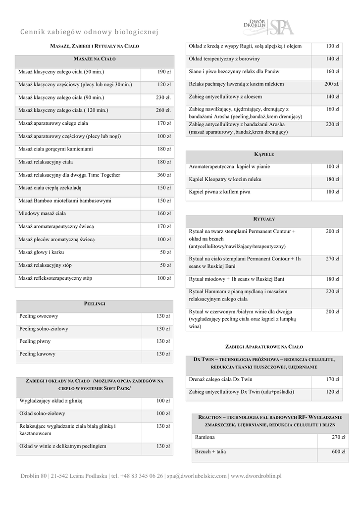 Cennik zabiegów odnowy biologicznej MASAŻE, ZABIEGI I RYTUAŁY NA CIAŁO MASAŻE NA CIAŁO Okład z kredą z wyspy Rugii, solą alpejską i olejem 130 zł Okład terapeutyczny z borowiny 140 zł Masaż klasyczny całego ciała (50 min.) 190 zł Siano i piwo bezczynny relaks dla Panów 160 zł Masaż klasyczny częściowy (plecy lub nogi 30min.) 120 zł Relaks pachnący lawendą z kozim mlekiem 200 zł. Masaż klasyczny całego ciała (90 min.) 230 zł. Zabieg antycellulitowy z aloesem 140 zł Masaż klasyczny całego ciała ( 120 min.) 260 zł. 160 zł Masaż aparaturowy całego ciała 170 zł Masaż aparaturowy częściowy (plecy lub nogi) 100 zł Zabieg nawilżający, ujędrniający, drenujący z bandażami Arosha (peeling,bandaż,krem drenujący) Zabieg antycellulitowy z bandażami Arosha (masaż aparaturowy ,bandaż,krem drenujący) Masaż ciała gorącymi kamieniami 180 zł Masaż relaksacyjny ciała 180 zł Masaż relaksacyjny dla dwojga Time Together 360 zł Masaż ciała ciepłą czekoladą 150 zł Masaż Bamboo miotełkami bambusowymi 150 zł Miodowy masaż ciała 160 zł Masaż aromaterapeutyczny świecą 170 zł Masaż pleców aromatyczną świecą 100 zł 220 zł KĄPIELE Aromaterapeutyczna kąpiel w pianie 100 zł Kąpiel Kleopatry w kozim mleku 180 zł Kąpiel piwna z kuflem piwa 180 zł RYTUAŁY Masaż głowy i karku 50 zł Masaż relaksacyjny stóp 50 zł Masaż refleksoterapeutyczny stóp 100 zł PEELINGI Peeling owocowy 130 zł Peeling solno-ziołowy 130 zł Peeling piwny 130 zł Peeling kawowy 130 zł Rytuał na twarz stemplami Permanent Contour + okład na brzuch (antycellulitowy/nawilżający/terapeutyczny) 200 zł Rytuał na ciało stemplami Permanent Contour + 1h seans w Ruskiej Bani 270 zł Rytuał miodowy + 1h seans w Ruskiej Bani 180 zł Rytuał Hammam z pianą mydlaną i masażem relaksacyjnym całego ciała 220 zł Rytuał w czerwonym /białym winie dla dwojga (wygładzający peeling ciała oraz kąpiel z lampką wina) 200 zł ZABIEGI APARATUROWE NA CIAŁO ZABIEGI I OKŁADY NA CIAŁO /MOŻLIWA OPCJA ZABIEGÓW NA CIEPŁO W SYSTEMIE SOFT PACK/ Wygładzający okład z glinką 100 zł Okład solno-ziołowy 100 zł Relaksujące wygładzanie ciała białą glinką i kasztanowcem 130 zł Okład w winie z delikatnym peelingiem 130 zł DX TWIN – TECHNOLOGIA PRÓŻNIOWA – REDUKCJA CELLULITU, REDUKCJA TKANKI TŁUSZCZOWEJ, UJĘDRNIANIE Drenaż całego ciała Dx Twin 170 zł Zabieg antycellulitowy Dx Twin (uda+pośladki) 120 zł REACTION – TECHNOLOGIA FAL RADIOWYCH RF- WYGŁADZANIE ZMARSZCZEK, UJĘDRNIANIE, REDUKCJA CELLULITU I BLIZN Ramiona 270 zł Brzuch + talia 600 zł Droblin 80 | 21-542 Leśna Podlaska | tel. +48 83 345 06 26 | [email protected] | www.dwordroblin.pl Cennik zabiegów odnowy biologicznej Uda /pośladki/ brzuch 500 zł Łydki 350 zł Uda+ pośladki 850 zł Blizny i rozstępy okolica zabiegowa 10x10cm 150 zł MIKRODERMABRAZJA DIAMENTOWA PRISTINE – ZŁUSZCZANIE, WYGŁADZANIE ZMARSZCZEK, ODŻYWIANIE Ramiona 180 zł Biust 160 zł Brzuch 220 zł Plecy 300 zł Pośladki 200 zł Uda 250 zł MASAŻE I ZABIEGI KOSMETYCZNE NA TWARZ Zabieg regenerujący na bazie kwasów, wygładzający zmarszczki 260 zł Zabieg normalizujący dla skóry trądzikowej 270 zł Zabieg ściągająco - liftingujący z aloesem dla cery dojrzałej 160 zł Ekskluzywny zabieg odmładzająco - lifingujący dla cery dojrzałej 300 zł For Men – zabieg energetyzujący i nawilżający 240 zł For Men – zabieg przeciwzmarszczkowy 240 zł Japoński lifting odmładzający – holistyczny masaż twarzy na bazie olejku różanego 120 zł Refleksologia Twarzy- masaż terapeutyczny 120 zł Klasyczny Masaż Twarzy 50 zł Sonoforeza/Kawitacja z ampułką i maską algową 100 zł Manualne oczyszczanie twarzy 120 zł Manualne oczyszczanie twarzy dołączone do zabiegu 90 zł Zabieg nawilżający z aloesem 100 zł Zabieg do cery trądzikowej z aloesem 120 zł Zabieg pielęgnacyjny do cery mieszanej i suchej z białą herbatą i aloesem 120 zł Zabieg intensywnie nawilżający z kwasem Hyaluronowym na okolicę oczu, stymulujący wzrost rzęs 180 zł Cosmolifting - zabieg z glinką, masażem refleksologicznym , dyskiem i kulami solnymi 150 zł Zabieg nawilżający dla cer wrażliwych i naczyniowych 200 zł Zabieg rozświetlająco-ujędrniający z wit.C 200 zł Zabieg intensywnie nawilżający dla cer odwodnionych i wrażliwych z kwasem hialuronowym 200 zł Zabieg odmładzający na bazie retinolu 220 zł Okolica oczu 80 zł Zabieg przeciwzmarszczkowy z komórkami macierzystymi, również dla skóry zmęczonej i przesuszonej 240 zł Okolica ust 60 zł Ekskluzywny zabieg wypełniający zmarszczki- botox like 250 zł Zabieg regenerujący na bazie kwasów dla cer problematycznych, z trądzikiem i przebarwieniami 260 zł MIKRODERMABRAZJA DIAMENTOWA PRISTINE – ZŁUSZCZANIE, WYGŁADZANIE ZMARSZCZEK, ODŻYWIANIE Twarz + ampułka i maska 150 zł Twarz, szyja, dekolt + ampułka i maska 270 zł Mikrodermabrazja twarzy dołączona do zabiegu 100 zł DX TWIN – TECHNOLOGIA PRÓŻNIOWA – ZABIEGI ANTI AGE LUB JAKO WZMOCNIENIE EFEKTU PRZY ZABIEGACH KOSMETYCZNYCH, LIFTING TWARZY Lifting twarzy + ampułka i maska 170 zł Czoło i lwia zmarszczka 100 zł Bruzdy nosowo-wargowe 100 zł REACTION – TECHNOLOGIA FAL RADIOWYCH RF- WYGŁADZANIE ZMARSZCZEK, UJĘDRNIANIE, REDUKCJA CELLULITU I BLIZN Cała twarz Droblin 80 | 21-542 Leśna Podlaska | tel. +48 83 345 06 26 | [email protected] | www.dwordroblin.pl 400 zł Cennik zabiegów odnowy biologicznej Okolica oczu/ ust/ bruzdy nosowo-wargowe 100 zł Szyja i podbródek 250 zł Pedicure Klasyczny 120 zł Czoło 170 zł Pedicure hybrydowy 130 zł Pedicure SPA 150 zł KOSMETYKA PODSTAWOWA TWARZY NAPRAWA OKOLICY OCZU STOPY Zdjęcie hybrydy 30 zł Regulacja brwi 30 zł Parafina 80 zł Henna brwi 25 zł Malowanie 20 zł Henna rzęs 20 zł Malowanie hybrydowe 30 zł Henna brwi z regulacją 50 zł Ziołowe wygładzanie stóp 90 zł WIZAŻ Makijaż dzienny 100 zł Makijaż wi