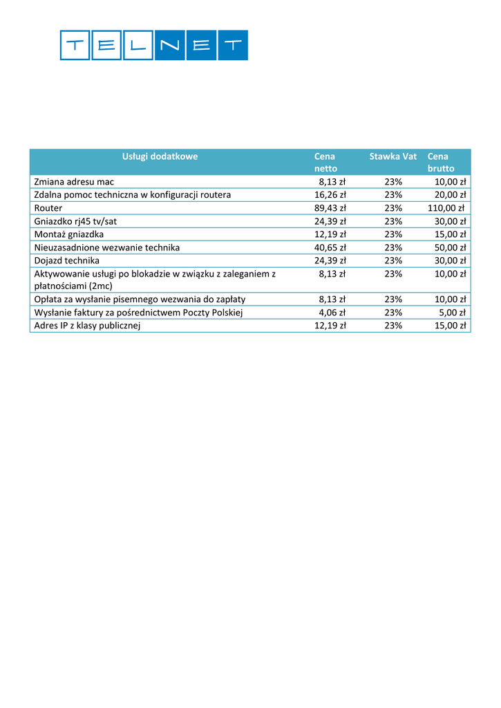 Usługi dodatkowe Zmiana adresu mac Zdalna pomoc techniczna w konfiguracji routera Router Gniazdko rj45 tv/sat Montaż gniazdka Nieuzasadnione wezwanie technika Dojazd technika Aktywowanie usługi po blokadzie w związku z zaleganiem z płatnościami (2mc) Opłata za wysłanie pisemnego wezwania do zapłaty Wysłanie faktury za pośrednictwem Poczty Polskiej Adres IP z klasy publicznej Cena netto 8,13 zł 16,26 zł 89,43 zł 24,39 zł 12,19 zł 40,65 zł 24,39 zł 8,13 zł Stawka Vat 23% 23% 23% 23% 23% 23% 23% 23% Cena brutto 10,00 zł 20,00 zł 110,00 zł 30,00 zł 15,00 zł 50,00 zł 30,00 zł 10,00 zł 8,13 zł 4,06 zł 12,19 zł 23% 23% 23% 10,00 zł 5,00 zł 15,00 zł