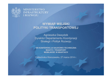 WYMIAR MIEJSKI POLITYKI TRANSPORTOWEJ Agnieszka Dawydzik Dyrektor Departamentu Koordynacji Strategii i Polityk Rozwoju VIII KONFERENCJA NAUKOWO-TECHNICZNA MIASTO i TRANSPORT MOBILNOŚĆ W MIASTACH Politechnika Warszawska, 27 marca 2014 r. Strategia Rozwoju Transportu do 2020 roku (z perspektywą do 2030 roku) – SRT §średniookresowy dokument planistyczny stanowiący integralny element spójnego systemu zarządzania, który wskazuje na transport miejski jako element zintegrowanego systemu transportowego §dokument przyjęty w drodze uchwały przez Radę Ministrów w dn. 22 stycznia 2013 r. §SRT wskazuje cele oraz nakreśla kierunki rozwoju transportu zgodne z celami założonymi w Długookresowej Strategii Rozwoju Kraju (DSRK) oraz Średniookresowej Strategii Rozwoju Kraju (SRK 2020) Głównymi kierunkami interwencji określonymi w wyznaczonymi dla transportu w obszarach miejskich są: SRT •przekształcenie sieci transportowej miasta w sprawny i funkcjonalny element infrastruktury regionu i systemu transportowego kraju, zapewniający dogodne powiązania z innymi regionami i z europejskim systemem transportowym; •zorganizowanie sprawnego, zgodnego z oczekiwaniami mieszkańców przemieszczania osób wewnątrz miasta i ułatwienie przemieszczania do i z obszarów zewnętrznych; •zorganizowanie sprawnego przemieszczania samochodów ciężarowych, w jak najmniejszym stopniu zakłócającego ruch w mieście; •zapewnienie równowagi pomiędzy zdolnością transportu do służenia rozwojowi ekonomicznemu a poszanowaniem środowiska naturalnego i zachowaniem jakości życia w przyszłości. Krajowa Polityka Miejska (KPM) §Założenia KPM zostały przyjęte przez Radę Ministrów 16 lipca 2013 r. §zakończono I etap prac nad projektem dokumentu, który obejmował szeroką dyskusję z udziałem ekspertów, środowisk samorządowych i organizacji pozarządowych. Tematyka mobilności i rozwiązywania problemów transportowych w miastach była jednym ze szczegółowo omawianych zagadnień, §obecnie trwają przygotowania do podjęcia II etapu prac nad KPM tj. poddania konkretnego tekstu do dyskusji z udziałem partnerów samorządowych, ekspertów, partnerów społecznych i gospodarczych oraz resortów, §transport jest jednym z dziesięciu wątków tematycznych uznanych za szczególnie ważne dla obecnych wyzwań rozwojowych polskich miast, Wydatki ze środków UE na projekty w zakresie transportu miejskiego w perspektywie finansowej 2007-2013 (według zawartych umów) Program operacyjny Program Operacyjny Infrastruktura i Środowisko Program Operacyjny Rozwój Polski Wschodniej Regionalny Program Operacyjny Województwa Dolnośląskiego Regionalny Program Operacyjny Województwa Kujawsko-Pomorskiego Regionalny Program Operacyjny Województwa Lubelskiego Regionalny Program Operacyjny Województwa Lubuskiego Regionalny Program Operacyjny Województwa Łódzkiego Regionalny Program Operacyjny Województwa Małopolskiego Regionalny Program Operacyjny Województwa Mazowieckiego Regionalny Program Operacyjny Województwa Opolskiego Regionalny Program Operacyjny Województwa Podkarpackiego Regionalny Program Operacyjny Województwa Podlaskiego Regionalny Program Operacyjny Województwa Pomorskiego Regionalny Program Operacyjny Województwa Śląskiego Regionalny Program Operacyjny Województwa Świętokrzyskiego Regionalny Program Operacyjny Województwa Wielkopolskiego Regionalny Program Operacyjny Województwa Zachodniopomorskiego razem dofinansowanie UE, PLN 7 880 015 805 1 490 517 134 242 319 533 101 056 608 84 624 110 12 673 345 18 103 529 136 338 856 99 916 650 22 120 400 46 090 220 35 979 314 138 662 547 236 007 423 5 509 976 295 434 958 125 276 501 10 970 646 911 POIiŚ - Działanie: 7.3 Transport miejski w obszarach metropolitalnych Kwota na działanie 3 372 411 500 EURO Główny cel to zwiększenie udziału przyjaznego środowisku transportu miejskiego w obsłudze mieszkańców 9 obszarów metropolitalnych (obszar warszawski, katowicki, wrocławski, łódzki, trójmiejski, krakowski, poznański, bydgosko-toruński, szczeciński) oraz zmniejszenia hałasu ulicznego oraz emisji spalin pochodzących ze środków transportu. W ramach Programu realizowane są m.in. projekty dotyczące rozbudowy sieci szynowych, zakupu i modernizacji taboru, budowy i rozbudowy stacji i węzłów przesiadkowych. O dofinansowanie realizacji projektów mogą wnioskować jednostki samorządu terytorialnego oraz instytucje odpowiedzialne za transport w ww. obszarach metropolitalnych. POIiŚ – Działanie: 8.3. Rozwój Inteligentnych Systemów Transportowych Działanie 8.3 jest ukierunkowane na wdrażanie Inteligentnych Systemów Transportowych w miastach. W ramach konkursu dla działania, dofinansowanie UE dla swoich projektów uzyskały następujące miasta: Bydgoszcz, Gliwice, Kraków, Wrocław, Poznań, Gdynia, Kalisz, Koszalin, Rzeszów, Szczecin oraz Legnica. Dofinansowanie otrzymały także Komunikacyjny Związek Komunalny Górnośląskiego Okręgu Przemysłowego oraz Międzygminny Związek Komunikacyjny Jastrzębie. W perspektywie finansowej UE 2007-2013 w ramach działania 8.3 POIiŚ, projektom z zakresu ITS przyznano dofinansowanie UE w kwocie 480 875 257,86 PLN przy łącznej wartości projektów 565 735 597,48 PLN. Program Operacyjny Rozwój Polski Wschodniej (PO RPW 2007-2013) W ramach programu wyodrębniono działanie III.1 - Systemy miejskiego transportu zbiorowego- alokacja z EFRR wynosi: 359 783 509 euro •6 projektów indywidualnych Zintegrowany system miejskiego transportu publicznego w Lublinie Budowa systemu integrującego transport publiczny miasta Rzeszowa i okolic Poprawa jakości funkcjonowania systemu transportu publicznego miasta Białegostoku - etap II i III Rozwój systemu komunikacji publicznej w Kieleckim Obszarze Metropolitalnym Modernizacja i rozwój zintegrowanego systemu transportu zbiorowego w Olsztynie Transport miejski w Umowie Partnerstwa (UP) Projekt UP przyjęty przez R