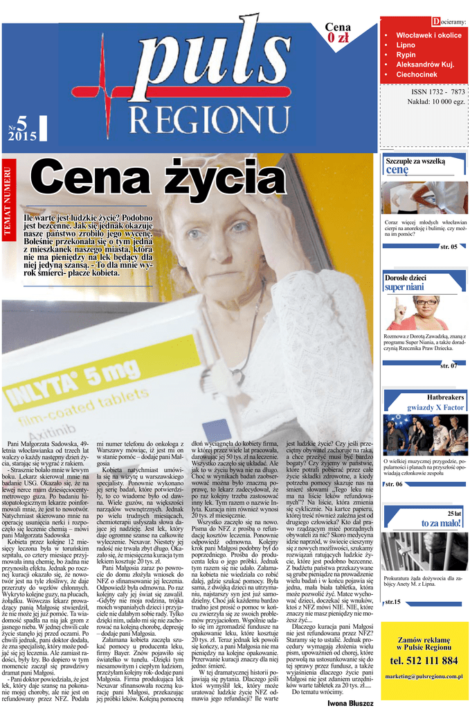 Cena 0 zł D ocieramy: • • • • • Włocławek i okolice Lipno Rypin Aleksandrów Kuj. Ciechocinek ISSN 1732 - 7873 Nakład: 10 000 egz. 5 2015 TEMAT NUMERU Nr Cena życia Ile warte jest ludzkie życie? Podobno jest bezcenne. Jak się jednak okazuje nasze państwo zrobiło jego wycenę. Boleśnie przekonała się o tym jedna z mieszkanek naszego miasta, która nie ma pieniędzy na lek będący dla niej jedyną szansą. - To dla mnie wyrok śmierci- płacze kobieta. Szczupłe za wszelką cenę Coraz więcej młodych włocławian cierpi na anoreksję i bulimię. czy można im pomóc? str. 05 Dorosłe dzieci super niani Rozmowa z Dorotą Zawadzką, znaną z programu Super Niania, a także doradczynią Rzecznika Praw Dziecka. str. 07 Hatbreakers gwiazdy X Factor Pani Małgorzata Sadowska, 49letnia włocławianka od trzech lat walczy o każdy następny dzień życia, starając się wygrać z rakiem. - Strasznie bolało mnie w lewym boku. Lekarz skierował mnie na badanie USG. Okazało się, że na lewej nerce mam dziesięciocentymetrowego guza. Po badaniu histopatologicznym lekarze poinformowali mnie, że jest to nowotwór. Natychmiast skierowano mnie na operację usunięcia nerki i rozpoczęło się leczenie chemią – mówi pani Małgorzata Sadowska Kobieta przez kolejne 12 miesięcy leczona była w toruńskim szpitalu, co cztery miesiące przyjmowała inną chemię, bo żadna nie przynosiła efektu. Jednak po rocznej kuracji okazało się, że nowotwór jest na tyle złośliwy, że daje przerzuty do węzłów chłonnych. Wykryto kolejne guzy, na płucach, żołądku. Wówczas lekarz prowadzący panią Małgosię stwierdził, że nie może jej już pomóc. Ta wiadomość spadła na nią jak grom z jasnego nieba. W jednej chwili całe życie stanęło jej przed oczami. Po chwili jednak, pani doktor dodała, że zna specjalistę, który może podjąć się jej leczenia. Ale zamiast radości, były łzy. Bo dopiero w tym momencie zaczął się prawdziwy dramat pani Małgosi. - Pani doktor powiedziała, że jest lek, który daje szansę na pokonanie mojej choroby, ale nie jest on refundowany przez NFZ. Podała mi numer telefonu do onkologa z Warszawy mówiąc, iż jest mi on w stanie pomóc – dodaje pani Małgosia Kobieta natychmiast umówiła się na wizytę u warszawskiego specjalisty. Ponownie wykonano jej serię badań, które potwierdziły, to co wiadome było od dawna. Wiele guzów, na większości narządów wewnętrznych. Jednak po wielu trudnych miesiącach, chemioterapii usłyszała słowa dające jej nadzieję. Jest lek, który daje ogromne szanse na całkowite wyleczenie. Nexavar. Niestety jej radość nie trwała zbyt długo. Okazało się, że miesięczna kuracja tym lekiem kosztuje 20 tys. zł. Pani Małgosia zaraz po powrocie do domu złożyła wniosek do NFZ o sfinansowanie jej leczenia. Odpowiedź była odmowna. Po raz kolejny cały jej świat się zawalił. -Gdyby nie moja rodzina, trójka moich wspaniałych dzieci i przyjaciele nie dałabym sobie rady. Tylko dzięki nim, udało mi się nie zachorować na kolejną chorobę, depresję – dodaje pani Małgosia. Załamana kobieta zaczęła szukać pomocy u producenta leku, firmy Bayer. Znów pojawiło się światełko w tunelu. -Dzięki tym niesamowitym i ciepłym ludziom, przeżyłam kolejny rok- dodaje pani Małgosia. Firma produkująca lek Nexavar sfinansowała roczną kurację pani Małgosi, przekazując jej próbki leków. Kolejną pomocną dłoń wyciągnęła do kobiety firma, w której przez wiele lat pracowała, darowując jej 50 tys. zł na leczenie. Wszystko zaczęło się układać. Ale jak to w życiu bywa nie na długo. Choć w wynikach badań zaobserwować można było znaczną poprawę, to lekarz zadecydował, że po raz kolejny trzeba zastosować inny lek. Tym razem o nazwie Inlyta. Kuracja nim również wynosi 20 tys. zł miesięcznie. Wszystko zaczęło się na nowo. Pisma do NFZ z prośbą o refundację kosztów leczenia. Ponownie odpowiedź odmowna. Kolejny krok pani Małgosi podobny był do poprzedniego. Prośba do producenta leku o jego próbki. Jednak tym razem się nie udało. Załamana kobieta nie wiedziała co robić dalej, gdzie szukać pomocy. Była sama, z dwójką dzieci na utrzymaniu, najstarszy syn jest już samodzielny. Choć jak każdemu bardzo trudno jest prosić o pomoc w końcu zwierzyła się ze swoich problemów przyjaciołom. Wspólnie udało się im zgromadzić fundusze na opakowanie leku, które kosztuje 20 tys. zł. Teraz jednak lek powoli się kończy, a pani Małgosia nie ma pieniędzy na kolejne opakowanie. Przerwanie kuracji znaczy dla niej jedno: śmierć. W tej dramatycznej historii pojawiają się pytania. Dlaczego jeśli ktoś wymyślił lek, który może uratować ludzkie życie NFZ odmawia jego refundacji? Ile warte jest ludzkie życie? Czy jeśli przeciętny obywatel zachoruje na raka, a chce przeżyć musi być bardzo bogaty? Czy żyjemy w państwie, które potrafi pobierać przez całe życie składki zdrowotne, a kiedy potrzeba pomocy skazuje nas na śmierć słowami „Tego leku nie ma na liście leków refundowanych”? Na liście, która zmienia się cyklicznie. Na kartce papieru, której treść również zależna jest od drugiego człowieka? Kto dał prawo rządzącym mieć porządnych obywateli za nic? Skoro medycyna idzie naprzód, w świecie cieszymy się z nowych możliwości, szukamy rozwiązań ratujących ludzkie życie, które jest podobno bezcenne. Z budżetu państwa przekazywane są grube pieniądze na prowadzenie wielu badań i w końcu pojawia się jedna, mała biała tabletka, która może pozwolić żyć. Matce wychować dzieci, doczekać się wnuków, ktoś z NFZ mówi NIE. NIE, które znaczy nie masz pieniędzy nie możesz żyć.... Dlaczego kuracja pani Małgosi nie jest refundowana przez NFZ? Staramy się to ustalić. Jednak procedury wymagają złożenia wielu pism, upoważnień od chorej, które pozwolą na ustosunkowanie się do tej 