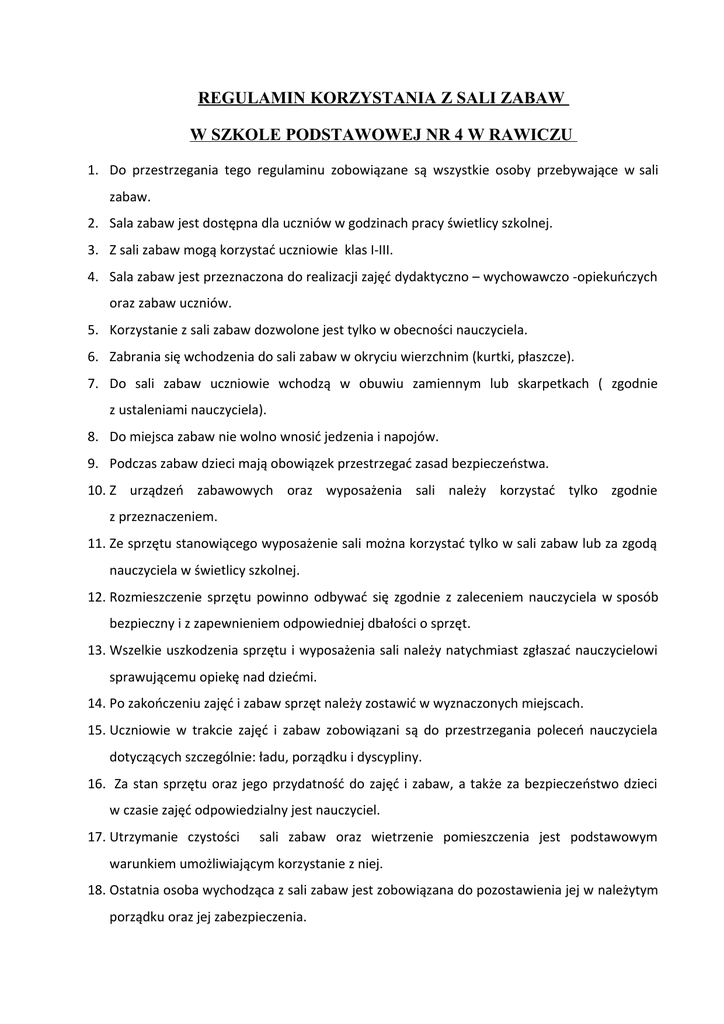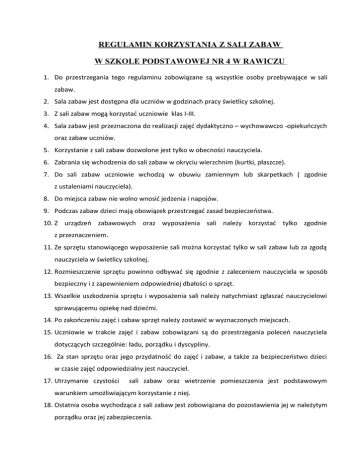 REGULAMIN KORZYSTANIA Z SALI ZABAW W SZKOLE PODSTAWOWEJ NR 4 W RAWICZU 1. Do przestrzegania tego regulaminu zobowiązane są wszystkie osoby przebywające w sali zabaw. 2. Sala zabaw jest dostępna dla uczniów w godzinach pracy świetlicy szkolnej. 3. Z sali zabaw mogą korzystać uczniowie klas I-III. 4. Sala zabaw jest przeznaczona do realizacji zajęć dydaktyczno – wychowawczo -opiekuńczych oraz zabaw uczniów. 5. Korzystanie z sali zabaw dozwolone jest tylko w obecności nauczyciela. 6. Zabrania się wchodzenia do sali zabaw w okryciu wierzchnim (kurtki, płaszcze). 7. Do sali zabaw uczniowie wchodzą w obuwiu zamiennym lub skarpetkach ( zgodnie z ustaleniami nauczyciela). 8. Do miejsca zabaw nie wolno wnosić jedzenia i napojów. 9. Podczas zabaw dzieci mają obowiązek przestrzegać zasad bezpieczeństwa. 10. Z urządzeń zabawowych oraz wyposażenia sali należy korzystać tylko zgodnie z przeznaczeniem. 11. Ze sprzętu stanowiącego wyposażenie sali można korzystać tylko w sali zabaw lub za zgodą nauczyciela w świetlicy szkolnej. 12. Rozmieszczenie sprzętu powinno odbywać się zgodnie z zaleceniem nauczyciela w sposób bezpieczny i z zapewnieniem odpowiedniej dbałości o sprzęt. 13. Wszelkie uszkodzenia sprzętu i wyposażenia sali należy natychmiast zgłaszać nauczycielowi sprawującemu opiekę nad dziećmi. 14. Po zakończeniu zajęć i zabaw sprzęt należy zostawić w wyznaczonych miejscach. 15. Uczniowie w trakcie zajęć i zabaw zobowiązani są do przestrzegania poleceń nauczyciela dotyczących szczególnie: ładu, porządku i dyscypliny. 16. Za stan sprzętu oraz jego przydatność do zajęć i zabaw, a także za bezpieczeństwo dzieci w czasie zajęć odpowiedzialny jest nauczyciel. 17. Utrzymanie czystości sali zabaw oraz wietrzenie pomieszczenia jest podstawowym warunkiem umożliwiającym korzystanie z niej. 18. Ostatnia osoba wychodząca z sali zabaw jest zobowiązana do pozostawienia jej w należytym porządku oraz jej zabezpieczenia.