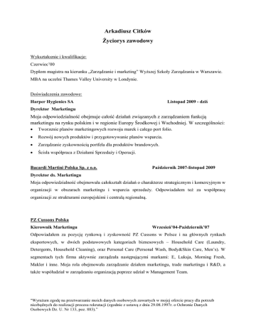 Arkadiusz Citków Życiorys zawodowy Wykształcenie i kwalifikacje: Czerwiec’00 Dyplom magistra na kierunku „Zarządzanie i marketing” Wyższej Szkoły Zarządzania w Warszawie. MBA na uczelni Thames Valley University w Londynie. Doświadczenia zawodowe: Listopad 2009 - dziś Harper Hygienics SA Dyrektor Marketingu Moja odpowiedzialność obejmuje całość działań związanych z zarządzaniem funkcją marketingu na rynku polskim i w regionie Europy Środkowej i Wschodniej. W szczególności: Tworzenie planów marketingowych rozwoju marek i całego port folio. Rozwój nowych produktów i przygotowywanie planów wsparcia. Zarządzanie zyskownością portfela dla produktów brandowych. Ścisła współpraca z Działami Sprzedaży i Operacji. Bacardi Martini Polska Sp. z o.o. Październik 2007-listopad 2009 Dyrektor ds. Marketingu Moja odpowiedzialność obejmowała całokształt działań o charakterze strategicznym i komercyjnym w organizacji w obszarach marketingu i wsparcia sprzedaży. Odpowiadałem też za współpracę organizacji ze strukturami europejskimi i centralą regionalną. PZ Cussons Polska Kierownik Marketingu Wrzesień’04-Październik’07 Odpowiadałem za pozycję rynkową i zyskowność PZ Cussons w Polsce i na głównych rynkach eksportowych, w dwóch podstawowych kategoriach biznesowych – Household Care (Laundry, Detergents, Household Cleaning), oraz Personal Care (Personal Wash, Body&Skin Care, Men’s). W segmentach tych firma aktywnie zarządzała następującymi markami: E, Luksja, Morning Fresh, Makler i inne. Moja rola obejmowała zarządzanie działem marketingu, trade marketingu i R&D, a także współudział w zarządzaniu organizacją poprzez udział w Management Team. "Wyrażam zgodę na przetwarzanie moich danych osobowych zawartych w mojej ofercie pracy dla potrzeb niezbędnych do realizacji procesu rekrutacji (zgodnie z ustawą z dnia 29.08.1997r. o Ochronie Danych Osobowych Dz. U. Nr 133, poz. 883).” SC Johnson Senior Product Manager Październik’02- Wrzesień’04 Moja odpowiedzialność obejmowała zarządzanie 3 kategoriami produktów chemii gospodarczej: środki do mycia i pielęgnacji mebli (marka Pronto), środki do mycia i pielęgnacji podłóg (marka Pronto) i środki czystości toalet (marka Toilet Duck). Odpowiedzialność ta rozciągała się na obszar Polski oraz krajów Europy Środkowej i Wschodniej. Mars Inc. / Master Foods Polska Brand Manager Marzec’98 –Październik’02 Moją karierę w Master Foods zacząłem od Programu Rozwoju Menadżerów (Management Trainee), w którym po okresie 2 lat objąłem samodzielne stanowisko menedżerskie. Od tego czasu moją główną odpowiedzialnością była marka Pedigree, (a potem także Chappi i Frolic) - największa marka w portfolio Master Foods Polska. Rok później moja rola obejmowała zarządzanie marką na obszarze Europy Środkowej i Wschodniej, gdzie byłem w pełni odpowiedzialny za strategię, pozycjonowanie, komunikację , kampanie i programy marketingowe tej marki. "Wyrażam zgodę na przetwarzanie moich danych osobowych zawartych w mojej ofercie pracy dla potrzeb niezbędnych do realizacji procesu rekrutacji (zgodnie z ustawą z dnia 29.08.1997r. o Ochronie Danych Osobowych Dz. U. Nr 133, poz. 883).”