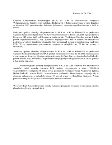 Puławy, 16.08.2016 r. Krajowe Laboratorium Referencyjne (KLR) ds. ASF w Państwowym Instytucie Weterynaryjnym -Państwowym Instytucie Badawczym w Puławach uzyskało wyniki dodatnie w kierunku ASF, potwierdzając dziesiąte, jedenaste i dwunaste ognisko choroby u świń w Polsce. Dziesiąte ognisko choroby zdiagnozowano w KLR ds. ASF w PIWet-PIB na podstawie wyników badań metodą real-time PCR próbek otrzymanych w dniu 11.08.2016 z gospodarstwa liczącego 110 sztuk świń położonego w miejscowości Truskolasy-Niwisko, gmina Sokoły, powiat wysokomazowiecki, woj. podlaskie. Występowanie ASF w stadzie stwierdzono na podstawie wyników dodatnich w kierunku ASF uzyskanych metodą wirusologiczną - real-time PCR. Wyżej wymienione gospodarstwo znajduje w odległości ok. 75 km od granicy z Białorusią. Jedenaste ognisko choroby zdiagnozowano w KLR ds. ASF w PIWet-PIB na podstawie wyników badań metodą real-time PCR próbek otrzymanych w dniu 11.08.2016 pochodzących z gospodarstwa liczącego 36 sztuk świń w miejscowości Stare Buczyce (gmina Janów Podlaski, powiat bialski, woj. lubelskie). Gospodarstwo znajduje się w odległości około 1 km od granicy z Republiką Białorusi. Dwunaste ognisko choroby zdiagnozowano w KLR ds. ASF w PIWet-PIB na podstawie wyników badań metodą real-time PCR próbek otrzymanych w dniu 12.08.2016 w gospodarstwie liczącym 34 sztuki świń, położonym w miejscowości Augustowo (gmina Bielsk Podlaski, powiat bielski, województwo podlaskie). Gospodarstwo znajduje się w obszarze ochronnym, w odległości około 35 km od granicy z Republiką Białorusi. Próbki pobrane zostały w związku ze stwierdzeniem padnięć w stadzie. We wszystkich 3 gospodarstwach zostały wdrożone procedury związane z likwidacją ogniska choroby i utylizacją zabitych świń.