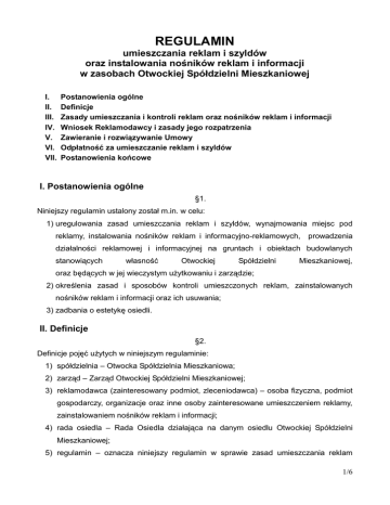 REGULAMIN umieszczania reklam i szyldów oraz instalowania nośników reklam i informacji w zasobach Otwockiej Spółdzielni Mieszkaniowej I. II. III. IV. V. VI. VII. Postanowienia ogólne Definicje Zasady umieszczania i kontroli reklam oraz nośników reklam i informacji Wniosek Reklamodawcy i zasady jego rozpatrzenia Zawieranie i rozwiązywanie Umowy Odpłatność za umieszczanie reklam i szyldów Postanowienia końcowe I. Postanowienia ogólne §1. Niniejszy regulamin ustalony został m.in. w celu: 1) uregulowania zasad umieszczania reklam i szyldów, wynajmowania miejsc pod reklamy, instalowania nośników reklam i informacyjno-reklamowych, prowadzenia działalności reklamowej i informacyjnej na gruntach i obiektach budowlanych stanowiących własność Otwockiej Spółdzielni Mieszkaniowej, oraz będących w jej wieczystym użytkowaniu i zarządzie; 2) określenia zasad i sposobów kontroli umieszczonych reklam, zainstalowanych nośników reklam i informacji oraz ich usuwania; 3) zadbania o estetykę osiedli. II. Definicje §2. Definicje pojęć użytych w niniejszym regulaminie: 1) spółdzielnia – Otwocka Spółdzielnia Mieszkaniowa; 2) zarząd – Zarząd Otwockiej Spółdzielni Mieszkaniowej; 3) reklamodawca (zainteresowany podmiot, zleceniodawca) – osoba fizyczna, podmiot gospodarczy, organizacje oraz inne osoby zainteresowane umieszczeniem reklamy, zainstalowaniem nośników reklam i informacji; 4) rada osiedla – Rada Osiedla działająca na danym osiedlu Otwockiej Spółdzielni Mieszkaniowej; 5) regulamin – oznacza niniejszy regulamin w sprawie zasad umieszczania reklam 1/6 i szyldów oraz instalowania nośników reklam i informacji w zasobach Otwockiej Spółdzielni Mieszkaniowej; 6) zasoby spółdzielni – budynki mieszkalne, pawilony handlowo-usługowe, pozostałe obiekty i tereny będące w zarządzie spółdzielni; 7) reklama – każdy przekaz reklamowy zmierzający do promocji sprzedaży albo innych form korzystania z towarów lub usług, popierania określonych spraw lub idei, albo do osiągnięcia innego efektu pożądanego przez zleceniodawcę; 8) nośniki reklam i informacji: a) nośniki reklam – tablice i billboardy, litery przestrzenne 3D, pneumatyczne (dmuchane), mobilne (reklamopojazd, przyczepa z reklamą); b) nośniki informacyjno - reklamowe – neony, słupy i tablice ogłoszeniowe, pylony, totemy, kasetony z podświetleniem lub bez podświetlenia, wyświetlacze LED, flagi, maszty, stojaczki, ekspozytory, potykacze, gabloty ogłoszeniowe na klatkach schodowych oraz zainstalowane w innych miejscach, diapazony, banery, siatki, banery w formie transparentów umieszczonych na obiektach lub pomiędzy obiektami, itp. 9) szyld –oznaczenie podmiotu prowadzącego działalność w lokalu lub budynku, wskazujące rodzaj tej działalności, umieszczone na elewacji w obrębie lokalu lub w obrębie wejścia do budynku ; 10) okres najmu – przedział czasowy, w którym ma być eksponowana reklama, lub nośnik reklam i informacji; 11) umowa – oznacza umowę zawartą zgodnie z regulaminem pomiędzy reklamodawcą (zainteresowanym podmiotem, zleceniodawcą) a spółdzielnią. III. Zasady umieszczania i kontroli reklam oraz nośników reklam i informacji §3. 1. Umieszczanie reklam oraz instalowanie nośników reklam i informacji w zasobach spółdzielni wymaga zgody zarządu, której to zgody zarząd może udzielić na uprzednio złożony pisemny wniosek reklamodawcy. 2. Reklamy, umieszczone w witrynach lokali od strony wewnętrznej, nie wymagają zgody zarządu. 3. W przypadku dużego zainteresowania osób fizycznych i prawnych obiektami lub terenami nadającymi się do celów reklamowych, zarząd organizuje przetarg w celu wyboru najkorzystniejszej oferty. 2/6 §4. 1. Rada osiedla może wnioskować do zarządu o umieszczanie reklam, nośników reklam i informacji w miejscach i w sposób przez nią określony. 2. Administrator osiedla oraz rada osiedla są zobowiązani do zgłaszania zarządowi na bieżąco: 1) zmian zauważonych w usytuowaniu reklam, nośników reklam i informacji na terenie osiedla; 2) reklam i nośników reklam i informacji umieszczonych i zainstalowanych na osiedlu bez zgody zarządu. §5. 1. W zasobach spółdzielni mogą być umieszczane różnego rodzaju reklamy, m.in.: murale i inne trwałe wymalowania na ścianach budynków, ogłoszenia, plakaty, banery. 2. Wymienione w § 2 pkt 8 nośniki reklam i informacji mogą być zainstalowane m.in. jako: konstrukcje trwale i nietrwale związane z gruntem, na terenach i w budynkach zasobów spółdzielni, na ścianach budynków, na uwięzi, wolnostojące lub mobilne. 3. Nośniki reklam i informacji mogą być wykonane i zainstalowane tak przez reklamodawcę, jak też przez spółdzielnię. 4. Reklamy, których treść lub sposób przedstawienia sprzeczne są z przepisami prawa lub dobrymi obyczajami, nie mogą być eksponowane. 5. Spółdzielnia nie ponosi odpowiedzialności za treść reklam. §6. 1. Lokalizacja nośnika reklam i informacji, przede wszystkim świetlnego lub dźwiękowego, nie może powodować szkodliwych bądź uciążliwych skutków dla mieszkańców osiedla i otoczenia. 2. Wygląd nośników reklam i informacji oraz sposób ich wykonania nie może szpecić obiektu i terenu, a przede wszystkim nie może zagrażać bezpieczeństwu ludzi i mienia. 3. Ze względu na infrastrukturę terenu, instalacje w budynku oraz inne zagrożenia, które mogą mieć miejsce podczas instalacji nośnika reklam i informacji, sposób wykonania instalacji musi być bezpieczny i zgodny z obowiązującymi przepisami ustawy -Prawo budowlane. 4. Reklamodawca ponosi odpowiedzialność za szkody wyrządzone w związku 3/6 z niewłaściwym lub niezgodnym z prawem zainstalowaniem i użytkowaniem nośnika reklam i informacji. 5. Za estetykę reklamy oraz nośnika reklam i informacji, ich stan techniczny i konserwację, ponosi odpowiedzialność reklamodawca, chyba że umowa stanowi inaczej. Gdy wskutek dz