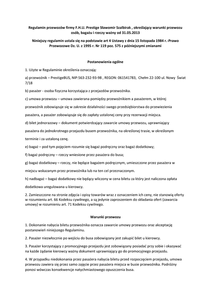 Regulamin przewozów firmy F.H.U. Prestige Sławomir Szalbirak , określający warunki przewozu osób, bagażu i rzeczy ważny od 31.05.2013 Niniejszy regulamin ustala się na podstawie art 4 Ustawy z dnia 15 listopada 1984 r.-Prawo Przewozowe Dz. U. z 1995 r. Nr 119 poz. 575 z późniejszymi zmianami Postanowienia ogólne 1. Użyte w Regulaminie określenia oznaczają: a) przewoźnik – PrestigeBUS, NIP:563-232-93-98 , REGON: 061541783, Chełm 22-100 ul. Nowy Świat 7/18 b) pasażer - osoba fizyczna korzystająca z przejazdów przewoźnika. c) umowa przewozu – umowa zawierana pomiędzy przewoźnikiem a pasażerem, w której przewoźnik zobowiązuje się w zakresie działalności swego przedsiębiorstwa do przewiezienia pasażera, a pasażer zobowiązuje się do zapłaty ustalonej ceny przy rezerwacji miejsca. d) bilet jednorazowy – dokument potwierdzający zawarcie umowy przewozu, uprawniający pasażera do jednokrotnego przejazdu busem przewoźnika, na określonej trasie, w określonym terminie i za ustaloną cenę. e) bagaż – pod tym pojęciem rozumie się bagaż podręczny oraz bagaż dodatkowy; f) bagaż podręczny – rzeczy wniesione przez pasażera do busa; g) bagaż dodatkowy – rzeczy, nie będące bagażem podręcznym, umieszczone przez pasażera w miejscu wskazanym przez przewoźnika lub na ten cel przeznaczonym. h) nadbagaż – bagaż dodatkowy nie będący wliczony w cena biletu za który jest naliczona opłata dodatkowa uregulowana u kierowcy. 2. Zamieszczone na stronie zdjęcia i opisy towarów wraz z oznaczeniem ich ceny, nie stanowią oferty w rozumieniu art. 66 Kodeksu cywilnego, a są jedynie zaproszeniem do składania ofert (zawarcia umowy) w rozumieniu art. 71 Kodeksu cywilnego. Warunki przewozu 1. Dokonanie nabycia biletu przewoźnika oznacza zawarcie umowy przewozu oraz akceptację postanowień niniejszego Regulaminu. 2. Pasażer niezwłocznie po wejściu do busa zobowiązany jest zakupić bilet u kierowcy. 3. Pasażer korzystający z promocyjnego przejazdu jest zobowiązany posiadać przy sobie i okazywać na każde żądanie kierowcy ważny dokument uprawniający go do promocyjnego przejazdu. 4. W przypadku niedokonania przez pasażera nabycia biletu przed rozpoczęciem przejazdu, umowa przewozu zawiera się przez samo zajęcie przez pasażera miejsca w busie przewoźnika. Podróżny ponosi wówczas konsekwencje natychmiastowego opuszczenia busa. 5. Przewoźnik jest zwolniony z obowiązku przewozu, jak również ma prawo nie dopuścić do przewozu lub usunąć z busa pasażera, jeżeli: a) pasażer nie stosuje się do Regulaminu lub przepisów przewozowych. b) pasażer znajduje się w stanie wskazującym na spożycie alkoholu lub środków odurzających (np. narkotyków) c) pasażer znajduje się w stanie wskazującym, iż jest chory, a skutki tej choroby mogą zagrażać współpasażerom. d) pasażer zachowuje się w sposób uciążliwy dla współpasażerów lub zagrażający bezpieczeństwu podróży. e) pasażer odmawia zapłacenia należności za przewóz. f) zachodzą okoliczności uniemożliwiające przewóz, których przewoźnik nie mógł uniknąć ani zapobiec ich skutkom. 6. Przewoźnik ma prawo odmówić zawarcia umowy przewozu oraz zatrzymać bilet osoby, która weszła w jego posiadanie z naruszeniem prawa lub która z własnej winy nie jest w stanie wykazać, iż jest osobą, której dane osobowe zostały podane przy rezerwacji miejsca. 7. Przewoźnik nie ponosi odpowiedzialności za opóźnienia w przewozie i ich dalsze skutki spowodowane czynnikami administracyjnymi (w tym m.in. kontrolami policyjnymi, kontrolami Inspekcji Transportu Drogowego) oraz innymi czynnikami niezależnymi od przewoźnika (w szczególności warunkami atmosferycznymi, utrudnieniami w ruchu drogowym, problemami technicznymi). Bilet 1. Przewoźnik oferuje do sprzedaży następujące rodzaje biletów: a) Bilet jednorazowy. b) Bilet promocyjny: po okazaniu ważnego dokumentu uprawniającego do skorzystania z promocji oraz po podaniu pięciu ostatnich przejazdów podanych przy rezerwacji i po zaakceptowaniu je przez biuro. 2. Obowiązujące u przewoźnika zniżki, ulgi, rabaty, promocje nie podlegają łączeniu. Obowiązki pasażera 1. Pasażer jest obowiązany do: a) przestrzegania przepisów porządkowych obowiązujących w przewozie drogowym oraz postanowień Regulaminu; b) stosowania się do zaleceń kierowcy. c) w busie fabrycznie wyposażonym w pasy bezpieczeństwa, pasażer ma obowiązek je zapiąć i utrzymać w tym stanie przez okres jazdy. d) Pasażer odpowiada za szkody wyrządzone przewoźnikowi (w tym w szczególności za zniszczenie urządzeń i wyposażenia) oraz za szkody wyrządzone przez niego współpasażerom. e) Pasażer odpowiada wobec w/w podmiotów również za szkody powstałe w związku z przewozem jego bagażu, chyba że szkody powstały z winy przewoźnika. f) Pasażer, który w sposób umyślny lub wskutek zaniedbania zanieczyszcza bus jest zobowiązany zapłacić przewoźnikowi kwotę stanowiącą równowartość kosztów poniesionych przez przewoźnika w związku z koniecznością całkowitego naprawienia szkody powstałej wskutek powyższych działań pasażera. g) Bagażu i zwierząt nie wolno umieszczać na miejscu przeznaczonych do siedzenia. h) Kierowca może odmówić przewozu osób nietrzeźwym i zachowującym się nieodpowiednio. i) Osoby zagrażające bezpieczeństwu lub porządkowi, mogą nie zostać wpuszczone do pojazdu lub z niego usunięcie przez kierowcę lub inne organy. j) Za zanieczyszczenie pojazdu przez pasażera powodujące konieczność jego zjazdu celem sprzątnięcia, pobrana będzie opłata specjalna. 2. W przypadku gdy osoba która potwierdziła swój przejazd i w dniu wyjazdu nie informuje biuro o rezygnacji z przejazdu, przewoźnik ma prawo wystawić rachunek i przesłać go pocztą. Bagaż 1. Limit bagażowy wynosi dwie torby podróżne średniej wielkości plus bagaż podręczny. Całość nie może przek