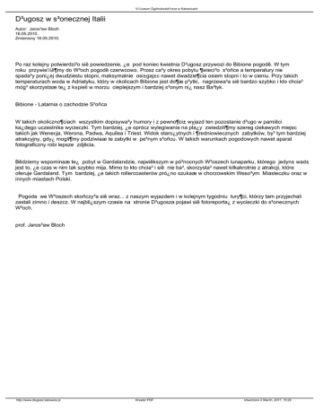 VI Liceum Ogólnokszta³c±ce w Katowicach D³ugosz w s³onecznej Italii Autor: Jaros³aw Bloch 16.05.2010. Zmieniony 16.05.2010. Po raz kolejny potwierdzi³o siê powiedzenie, ¿e pod koniec kwietnia D³ugosz przywozi do Bibione pogodê. W tym roku przywie¼li¶my do W³och pogodê czerwcow±. Przez ca³y okres pobytu ¶wieci³o s³oñce a temperatury nie spada³y poni¿ej dwudziestu stopni, maksymalnie osi±gaj±c nawet dwadzie¶cia osiem stopni i to w cieniu. Przy takich temperaturach woda w Adriatyku, który w okolicach Bibione jest do¶æ p³ytki, nagrzewa³a siê bardzo szybko i kto chcia³ móg³ skorzystaæ te¿ z k±pieli w morzu cieplejszym i bardziej s³onym ni¿ nasz Ba³tyk. Bibione - Latarnia o zachodzie S³oñca W takich okoliczno¶ciach wszystkim dopisywa³y humory i z pewno¶ci± wyjazd ten pozostanie d³ugo w pamiêci ka¿dego uczestnika wycieczki. Tym bardziej, ¿e oprócz wylegiwania na pla¿y zwiedzili¶my szereg ciekawych miejsc takich jak Wenecja, Werona, Padwa, Aquilea i Triest. Widok staro¿ytnych i ¶redniowiecznych zabytków, by³ tym bardziej atrakcyjny, gdy¿ mogli¶my podziwiaæ te zabytki w pe³nym s³oñcu. W takich warunkach pogodowych nawet aparat fotograficzny robi lepsze zdjêcia. Bêdziemy wspominaæ te¿ pobyt w Gardalandzie, najwiêkszym w pó³nocnych W³oszech lunaparku, którego jedyn± wad± jest to, ¿e czas w nim tak szybko mija. Mimo to kto chcia³ i siê nie ba³, skorzysta³ nawet kilkakrotnie z atrakcji, które oferuje Gardaland. Tym bardziej, ¿e takich rollercoasterów pró¿no szukaæ w chorzowskim Weso³ym Miasteczku oraz w innych miastach Polski. Pogoda we W³oszech skoñczy³a siê wraz... z naszym wyjazdem i w kolejnym tygodniu tury¶ci, którzy tam przyjechali zastali zimno i deszcz. W najbli¿szym czasie na stronie D³ugosza pojawi siê fotoreporta¿ z wycieczki do s³onecznych W³och. prof. Jaros³aw Bloch http://www.dlugosz.katowice.pl Kreator PDF Utworzono 2 March, 2017, 15:29