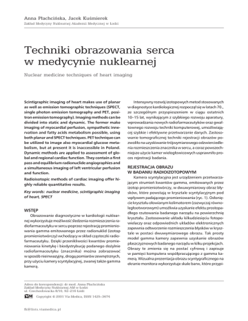 Anna Płachcińska, Jacek Kuśmierek Zakład Medycyny Nuklearnej Akademii Medycznej w Łodzi Techniki obrazowania serca w medycynie nuklearnej Nuclear medicine techniques of heart imaging Scintigraphic imaging of heart makes use of planar as well as emission tomographic techniques (SPECT, single photon emission tomography and PET, positron emission tomography). Imaging methods can be divided into static and dynamic. The former make imaging of myocardial perfusion, sympathetic innervation and fatty acids metabolism possible, using both planar and SPECT techniques. PET technique can be utilized to image also myocardial glucose metabolism, but at present it is inaccessible in Poland. Dynamic methods are applied to assessment of global and regional cardiac function. They contain a first pass and equilibrium radionuclide angiographies and a simultaneous imaging of left ventricular perfusion and function. Radioisotopic methods of cardiac imaging offer highly reliable quantitative results. Key words: nuclear medicine, scintigraphic imaging of heart, SPECT WSTĘP Obrazowanie diagnostyczne w kardiologii nuklearnej wykorzystuje możliwość śledzenia rozmieszczenia radiofarmaceutyku w sercu poprzez rejestrację promieniowania gamma emitowanego przez radionuklid (izotop promieniotwórczy) wchodzący w skład cząsteczki radiofarmaceutyku. Dzięki przenikliwości kwantów promieniowania kinetykę i biodystrybucję podanego dożylnie radiofarmaceutyku (znacznika) można zobrazować w sposób nieinwazyjny, drogą pomiarów zewnętrznych, przy użyciu kamery scyntylacyjnej, zwanej także gamma kamerą. Adres do korespondencji: dr med. Anna Płachcińska Zakład Medycyny Nuklearnej AM w Łodzi ul. Czechosłowacka 8/10, 92–216 Łódź Copyright „ 2001 Via Medica, ISSN 1425–3674 [email protected] Intensywny rozwój izotopowych metod stosowanych w diagnostyce kardiologicznej rozpoczął się w latach 70., ze szczególnym przyspieszeniem w ciągu ostatnich 10–15 lat, wynikającym z szybkiego rozwoju aparatury, wprowadzania nowych radiofarmaceutyków oraz gwałtownego rozwoju techniki komputerowej, umożliwiającej szybkie i efektywne przetwarzanie danych. Zastosowanie tomograficznej techniki rejestracji obrazów pozwoliło na uzyskiwanie trójwymiarowego odzwierciedlenia rozmieszczenia znacznika w sercu, a coraz powszechniejsze użycie kamer wielogłowicowych usprawniło proces rejestracji badania. REJESTRACJA OBRAZU W BADANIU RADIOIZOTOPOWYM Kamera scyntylacyjna jest urządzeniem przetwarzającym strumień kwantów gamma, emitowanych przez izotop promieniotwórczy, w dwuwymiarowy obraz błysków, które powstają w krysztale scyntylacyjnym pod wpływem padającego promieniowania (ryc. 1). Osłonięcie kryształu ołowianym kolimatorem (zazwyczaj równoległootworowym) umożliwia uzyskanie efektu prostopadłego rzutowania badanego narządu na powierzchnię kryształu. Zastosowanie układu kilkudziesięciu fotopowielaczy oraz odpowiednich układów elektronicznych zapewnia odtworzenie rozmieszczenia błysków w krysztale w postaci dwuwymiarowego obrazu. Tak prosty model gamma kamery zapewnia uzyskanie obrazów płaszczyznowych badanego narządu w kilku projekcjach. Obrazy te zmienia się na postać cyfrową i zapisuje w pamięci komputera współpracującego z gamma kamerą. Wizualna prezentacja obrazu scyntygraficznego na ekranie monitora wykorzystuje skale barw, które przypi- Forum Kardiologów 2001, tom 6, nr 2 y Kryształ scyntylacyjny x y Kolimator y’ x’ x Każdy błysk lokalizowany w układzie współrzędnych x,y 2 kwanty gamma Detektor Detektor Rycina 1. Schemat działania kamery scyntylacyjnej Układ koincydencji suje poszczególnym punktom obrazu w zależności od poziomu rejestrowanych zliczeń. Nowsze kamery scyntylacyjne pozwalają na tomograficzne odzwierciedlenie rozmieszczenia znacznika, w postaci serii warstw w trzech wzajemnie prostopadłych płaszczyznach, dzięki czemu uzyskuje się lepszy kontrast odwzorowania rozmieszczenia radionuklidu w sercu, a tym samym większą czułość wykrywania niewielkich obszarów nieprawidłowego gromadzenia radiofarmaceutyku, unikając nakładania się na warstwowe obrazy miokardium radioaktywności z sąsiednich części serca i tkanek otaczających. Technika ta nosi nazwę tomografii emisyjnej pojedynczych fotonów (SPECT, single photon emission computed tomography). Uzyskiwanie badania techniką tomograficzną polega na zarejestrowaniu serii kilkudziesięciu obrazów przez detektor obracający się skokowo wokół długiej osi ciała pacjenta. Odtworzenie rozmieszczenia znacznika w postaci serii cięć jest możliwe dzięki zastosowaniu specjalistycznego oprogramowania komputerowego. Inna technika tomografii emisyjnej, zwana tomografią pozytronową (PET, positron emission tomography) wykorzystuje radionuklidy emitujące pozytrony, czyli przeciwcząstki elektronów (o dodatnim ładunku elektrycznym). W wyniku zjawiska anihilacji z elektronem w ciele pacjenta, pozytron (po przebyciu najwyżej kilku milimetrów) zostaje zamieniony na dwa wysokoenergetyczne fotony (kwanty gamma) emitowane w przeciwnych kierunkach. Detekcja promieniowania polega na jednoczesnym zarejestrowaniu fotonów przez dwa przeciwległe detektory kamery tomograficznej umieszczone w pierścieniu okalającym pacjenta (ryc. 2). W badaniach techniką PET stosuje się ultrakrótkożyciowe radionuklidy produkowane w cyklotronach. Badania te są bardzo kosztowne, co wynika zarówno z konieczności posiadania cyklotronu do produkcji krótkożyciowych radionuklidów, jak i wysokiej ceny tomografów typu PET, dlatego powyższa technika diagnostyczna nie jest jak dotąd w Polsce dostępna. 72 Rycina 2. Zasada działania pozytronowej tomografii emisyjnej. Kwanty gamma, powstałe na skutek anihilacji pozytronu z elektronem w ciele pacjenta, podlegają detekcji parami w tzw. układzie koincydencji BADANIA STATYCZNE I DYNAMICZNE Badania radioizotopowe ze względu na sposób rejestracj