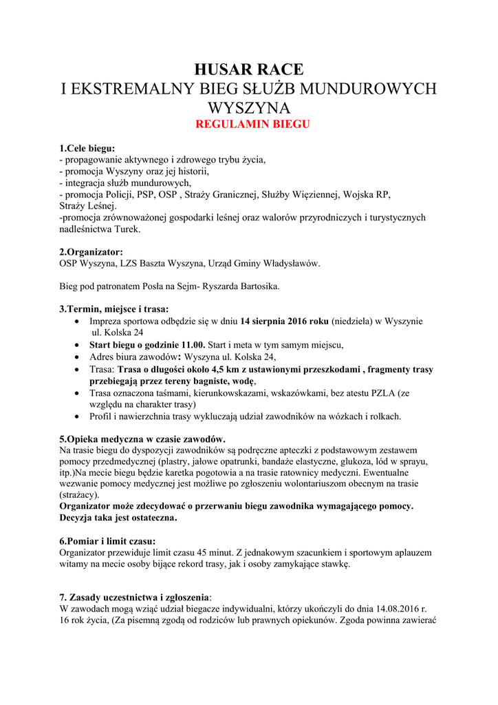 HUSAR RACE I EKSTREMALNY BIEG SŁUŻB MUNDUROWYCH WYSZYNA REGULAMIN BIEGU 1.Cele biegu: - propagowanie aktywnego i zdrowego trybu życia, - promocja Wyszyny oraz jej historii, - integracja służb mundurowych, - promocja Policji, PSP, OSP , Straży Granicznej, Służby Więziennej, Wojska RP, Straży Leśnej. -promocja zrównoważonej gospodarki leśnej oraz walorów przyrodniczych i turystycznych nadleśnictwa Turek. 2.Organizator: OSP Wyszyna, LZS Baszta Wyszyna, Urząd Gminy Władysławów. Bieg pod patronatem Posła na Sejm- Ryszarda Bartosika. 3.Termin, miejsce i trasa: Impreza sportowa odbędzie się w dniu 14 sierpnia 2016 roku (niedziela) w Wyszynie ul. Kolska 24 Start biegu o godzinie 11.00. Start i meta w tym samym miejscu, Adres biura zawodów: Wyszyna ul. Kolska 24, Trasa: Trasa o długości około 4,5 km z ustawionymi przeszkodami , fragmenty trasy przebiegają przez tereny bagniste, wodę, Trasa oznaczona taśmami, kierunkowskazami, wskazówkami, bez atestu PZLA (ze względu na charakter trasy) Profil i nawierzchnia trasy wykluczają udział zawodników na wózkach i rolkach. 5.Opieka medyczna w czasie zawodów. Na trasie biegu do dyspozycji zawodników są podręczne apteczki z podstawowym zestawem pomocy przedmedycznej (plastry, jałowe opatrunki, bandaże elastyczne, glukoza, lód w sprayu, itp.)Na mecie biegu będzie karetka pogotowia a na trasie ratownicy medyczni. Ewentualne wezwanie pomocy medycznej jest możliwe po zgłoszeniu wolontariuszom obecnym na trasie (strażacy). Organizator może zdecydować o przerwaniu biegu zawodnika wymagającego pomocy. Decyzja taka jest ostateczna. 6.Pomiar i limit czasu: Organizator przewiduje limit czasu 45 minut. Z jednakowym szacunkiem i sportowym aplauzem witamy na mecie osoby bijące rekord trasy, jak i osoby zamykające stawkę. 7. Zasady uczestnictwa i zgłoszenia: W zawodach mogą wziąć udział biegacze indywidualni, którzy ukończyli do dnia 14.08.2016 r. 16 rok życia, (Za pisemną zgodą od rodziców lub prawnych opiekunów. Zgoda powinna zawierać zapis, że rodzic lub opiekun bierze pełną odpowiedzialność za zdrowie i życie swojego podopiecznego) oraz uczestnicy którzy ukończyli 18 rok życia i podpiszą oświadczenie, że startują na własną odpowiedzialność pracują, pracowali lub zajmują się pracą związaną z Służbami Mundurowymi( funkcjonariusze Policji, PSP, Straży Granicznej, Służby Więziennej, Straży Leśnej żołnierze Wojska Polskiego, albo emerytami lub rencistami tych służb lub członkowie Ochotniczej Straży Pożarnej z przynajmniej półrocznym stażem. Niezależnie od miejsca zamieszkania, przynależności klubowej i narodowości. Zawodnicy zobowiązani są do przedstawienia zaświadczenia lekarskiego o zdolności do udziału w biegach długodystansowych lub do podpisania oświadczenia udziału na własną odpowiedzialność. Zgłoszenia można dokonywać drogą elektroniczną do dnia 10 sierpnia 2016 r. zgodnie z formularzem zgłoszeniowym umieszczonym na stronie internetowej. Za osobę zgłoszoną uważa się osobę ,która dokonała opłaty startowej. Każdy uczestnik jest zobowiązany do wniesienia opłaty startowej w ciągu 3 dni od momentu dokonania zgłoszenia do biegu. W przeciwnym wypadku jego zgłoszenie zostanie anulowane. Opłata raz uiszczona nie podlega zwrotowi. Po 10 sierpnia 2016 r. ze względów organizacyjnych zapisy będą przyjmowane tylko w biurze zawodów. Wydawanie numerów startowych w biurze zawodów w dniu imprezy od 08.30 do 10.30. Numer startowy musi być przypięty z przodu na piersiach. Niedopełnienie tego obowiązku może skutkować dyskwalifikacją. Każdy zawodnik rejestrując się wyraża zgodę na przetwarzanie danych osobowych dla celów weryfikacji i umieszczenia w komunikacie końcowym. Zgoda dotyczy również wykorzystania danych teleadresowych do ewentualnej korespondencji z zawodnikiem w sprawach dotyczących biegu oraz wykorzystania jego wizerunku widniejącego na fotografiach. Zawodnik podczas rejestracji musi posiadać dowód tożsamości ze zdjęciem oraz uczestnik zobowiązany jest przedstawić dokument potwierdzający przynależność do jednej ze służb mundurowych, a w przypadku członków Ochotniczych Straży Pożarnych również wypełnionej deklaracji pobranej ze strony internetowej biegu(załącznik 1). Organizator przewiduje limit do 150 miejsc. Zgłoszenia oraz wpisowe można dokonać drogą elektroniczną poprzez stronę : http://time4run.com.pl/imprezy/husar-race-wyszyna/ 7.Wpisowe: Wpisowe opłacone przelewem na konto Klubu -do 10 sierpnia 30 zł - w dniu biegu 50 zł Decyduje data wpływu na konto Organizatora Prowadzone będą następujące klasyfikacje: 8. Klasyfikacja końcowa. Prowadzona będzie następująca klasyfikacja: Klasyfikacja ogólna : I-VI - miejsce mężczyzn, I-VI- miejsce kobiet, Klasyfikacja poszczególnych służb mundurowych(PSP, Policja, OSP, Żołnierze, pozostałe służby mundurowe): I-III – miejsce mężczyzn w każdej z ww. grup, I-III – miejsce kobiet w każdej z ww. grup, 9. Nagrody: Uczestnicy wymienieni w klasyfikacji końcowej otrzymują dodatkowe puchary-statuetki, Pozostałe nagrody są uzależnione od sponsorów, informacje na ich temat będą pojawiały się na stronie wydarzenia na facebook-u. Dla wszystkich uczestników planowane jest losowanie pamiątkowych nagród rzeczowych. 10. Świadczenia: Każdy zawodnik otrzymuje medal, numer startowy, wodę na trasie oraz napoje i posiłek regeneracyjny na mecie .Jakiekolwiek dodatkowe świadczenia przyznane w związku z udziałem w biegu są uzależnione od sponsorów i decyzji Organizatorów. Żadne z nich nie mogą być przedmiotem sporu. 11. Szczególne zasady bezpieczeństwa. Ze względu na dystans, profil trasy, panujące temperatury zabroniony jest start zawodników, którzy są chorzy, przeziębieni, przemęczeni, spożywali alkohol, środki chemiczne wpływające na zdolności psychofizyczne, jakiekolwiek leki bez wiedzy lekar