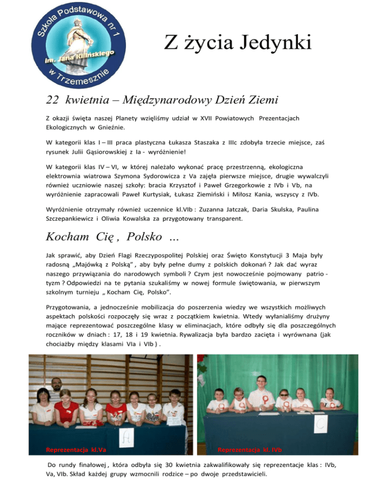 Z życia Jedynki 22 kwietnia – Międzynarodowy Dzień Ziemi Z okazji święta naszej Planety wzięliśmy udział w XVII Powiatowych Prezentacjach Ekologicznych w Gnieźnie. W kategorii klas I – III praca plastyczna Łukasza Staszaka z IIIc zdobyła trzecie miejsce, zaś rysunek Julii Gąsiorowskiej z Ia - wyróżnienie! W kategorii klas IV – VI, w której należało wykonad pracę przestrzenną, ekologiczna elektrownia wiatrowa Szymona Sydorowicza z Va zajęła pierwsze miejsce, drugie wywalczyli również uczniowie naszej szkoły: bracia Krzysztof i Paweł Grzegorkowie z IVb i Vb, na wyróżnienie zapracowali Paweł Kurtysiak, Łukasz Ziemioski i Miłosz Kania, wszyscy z IVb. Wyróżnienie otrzymały również uczennice kl.VIb : Zuzanna Jatczak, Daria Skulska, Paulina Szczepankiewicz i Oliwia Kowalska za przygotowany transparent. Kocham Cię , Polsko … Jak sprawid, aby Dzieo Flagi Rzeczypospolitej Polskiej oraz Święto Konstytucji 3 Maja były radosną „Majówką z Polską” , aby były pełne dumy z polskich dokonao ? Jak dad wyraz naszego przywiązania do narodowych symboli ? Czym jest nowocześnie pojmowany patrio tyzm ? Odpowiedzi na te pytania szukaliśmy w nowej formule świętowania, w pierwszym szkolnym turnieju „ Kocham Cię, Polsko”. Przygotowania, a jednocześnie mobilizacja do poszerzenia wiedzy we wszystkich możliwych aspektach polskości rozpoczęły się wraz z początkiem kwietnia. Wtedy wyłanialiśmy drużyny mające reprezentowad poszczególne klasy w eliminacjach, które odbyły się dla poszczególnych roczników w dniach : 17, 18 i 19 kwietnia. Rywalizacja była bardzo zacięta i wyrównana (jak chociażby między klasami VIa i VIb ) . Reprezentacja kl.Va Reprezentacja kl. IVb Do rundy finałowej , która odbyła się 30 kwietnia zakwalifikowały się reprezentacje klas : IVb, Va, VIb. Skład każdej grupy wzmocnili rodzice – po dwoje przedstawicieli. Na widowni zasiedli zaproszeni goście , uczniowie , rodzice oraz nauczyciele. Każda z drużyn odpowiadała na pytania w siedmiu różnych kategoriach związanych z Polską: - wiedzy ogólnej - sporcie - filmie -kuchni -piosence - literówkach, czyli zawiłościach polskiej ortografii -kalamburach związanych najczęściej z historią Polski. Po trzeciej rundzie pytao emocje zawodników wzrosły w momencie , gdy o zwycięstwie mogło zaważyd koło fortuny . Sprzyjało ono najbardziej najstarszym uczniom – reprezentacji VIb. Za wspomnianymi szóstoklasistami uplasowali się przedstawiciele IVb , na miejscu trzecim – Va. Atmosfera dobrej zabawy udzieliła się wszystkim zawodnikom , bez względu na zajęte miejsce. Turniej wzbogacił naszą wiedzę o Ojczyźnie , nauczył nas również radośnie i szlachetnie zwyciężad , a także godnie przegrywad. Ach, żeby tak 50 punktów! Igor z VIb przywołuje skojarzenia. Prowadzący turniej Dyrektor Włodzimierz Dobersztyn. Emocje na widowni a Zwycięska drużyna VIb odbierająca gratulacje i nagrodę od Przewodniczącej Komisji Oświaty, Kultury i Sportu Rady Miasta i Gminy Mogilno Turniejowe zmagania uatrakcyjniły występy szkolnych chórzystek oraz miniformacji taoca współczesnego PARBAT z Mogileoskiego Domu Kultury. V Powiatowy Konkurs Piosenki Ekologicznej – EKOSONG 2012 Już po raz piąty nasza szkoła była organizatorem festiwalu piosenki ekologicznej. Wyraz ekologia ma grecki rodowód i łączy w sobie słowa : oiko – dom i logos – nauka. Śpiewano więc o naszym wspólnym domu – Ziemi. Element ekologiczny był niezwykle istotnym dla komisji oceniającej , w skład której weszli : Pani Danuta Szreder , Pani Kamila Wesołowska oraz Pan Mariusz Zielioski. Nagrody w konkursie ufundowali Urząd Miasta i Gminy Trzemeszno oraz Starostwo Powiatowe w Gnieźnie , a były to trzy wspaniałe gitary oraz albumy ekologiczne. Pierwsze miejsce wyśpiewały reprezentantki naszej szkoły , drugie przypadło Szkole Podstawowej w Dębnicy , trzecie Szkole Podstawowej w Mielżynie. Wyróżnienia otrzymały: Szkoła Podstawowa nr 2 w Trzemesznie i Szkoła Podstawowa w Karniszewie . My zaś, przez jeszcze wiele dni, będziemy nucili te piękne melodie. Słowiki z SP 1 z Panem Michałem Stochlioskim, który przygotował dziewczęta do występu Utalentowani uczniowie z SP w Dębnicy Zdobywcy trzeciego miejsca Rodzinna fotografia uczestników konkursu Chór szkolny umilał okres oczekiwania na werdykt jury Mistrzostwa Miasta i Gminy Trzemeszno w czwórboju lekkoatletycznym dziewcząt i chłopców Do rywalizacji stanęły : Szkoła Podstawowa nr 2, Szkoła Podstawowa Trzemżal oraz my , czyli Szkoła Podstawowa nr 1. Zawodnicy zmagali się w czterech konkurencjach: - rzucie piłeczką palantową - skoku w dal - biegu na 60 m -biegu na 600 m Najlepszą okazała się reprezentacja naszej szkoły , najwyższe indywidualne wyniki uzyskali - wśród dziewcząt – Paulina Szczepankiewicz kl.VIb - wśród chłopców – Alan Giza kl.VIb -Artur Giza kl.VIc Wiadomości zebrali: Zosia Hartwich , Nelly Wesołowska, Weronika Koperska, Dominika Szambelan, Natalia Kozłowska, Janusz Koteras Foto. p. K.Kulik